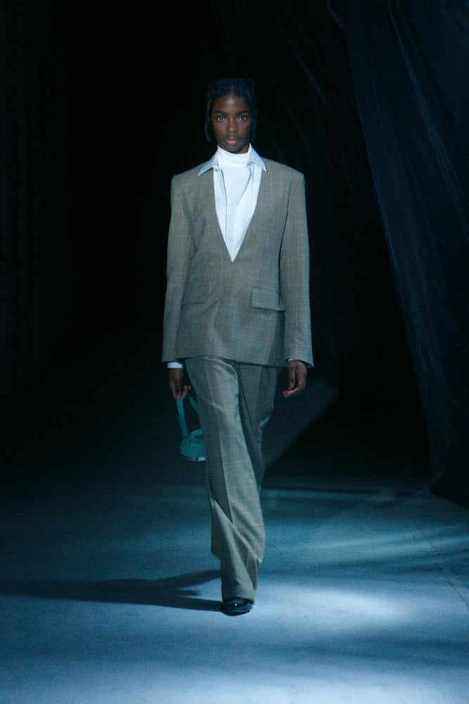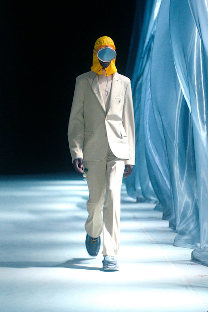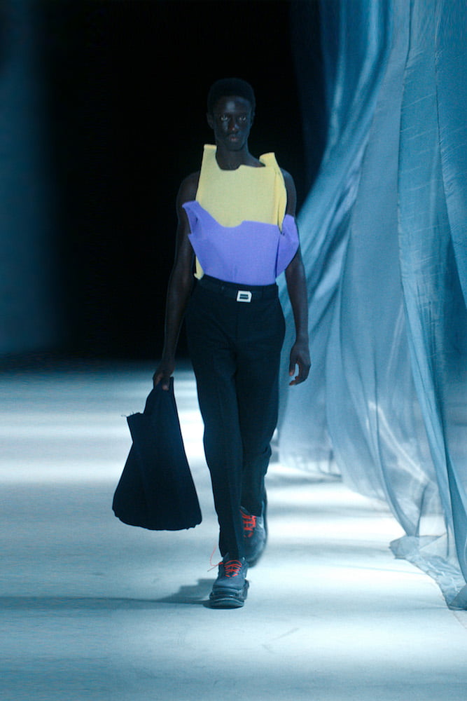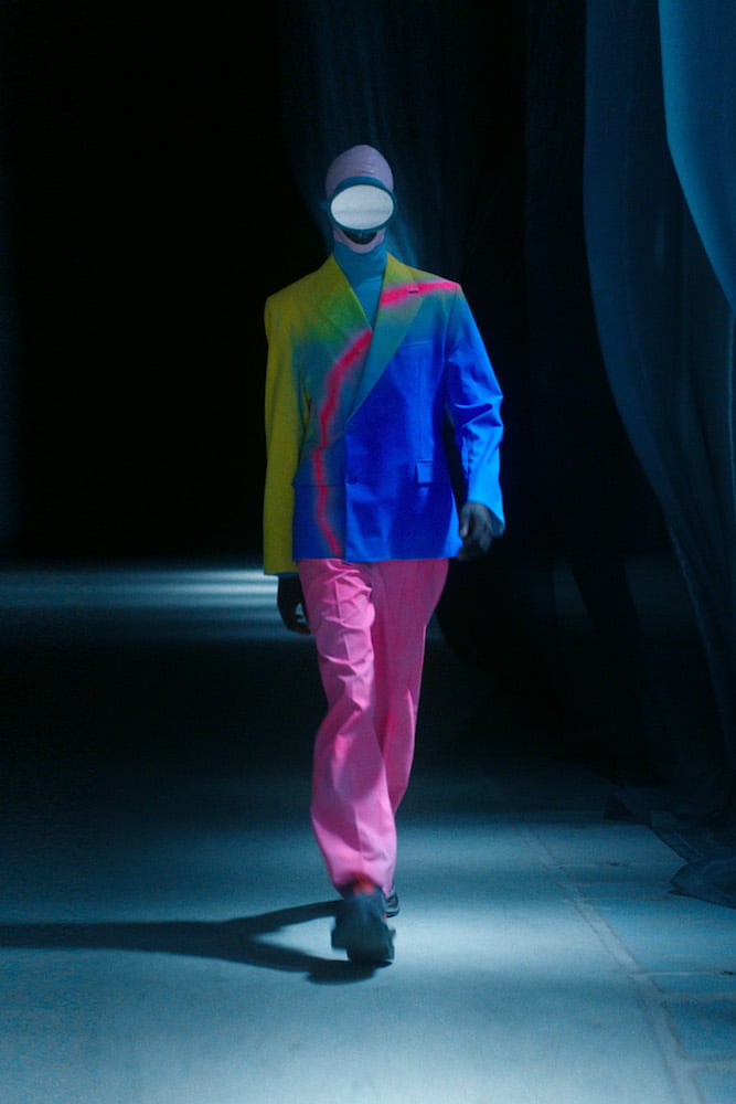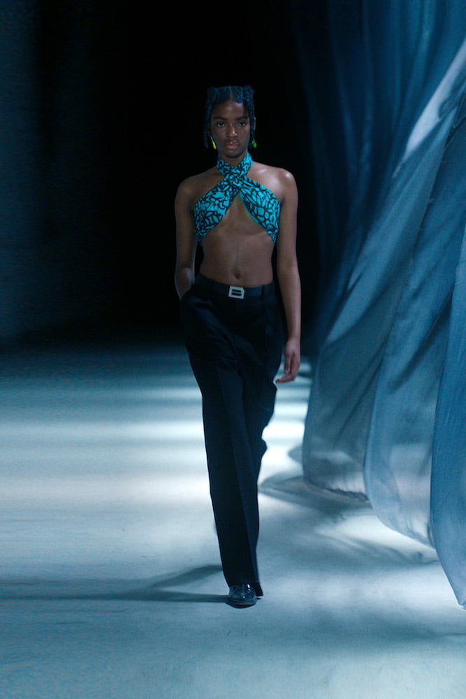 They called this collection Global Warning and 60 per cent of the fabrics you see here are made from recycled ocean plastic from nonprofit environmental organisation Parley for the Oceans, used to create aqua blue outerwear with diver fastenings, scuba vests and the brand’s signature boxy tailoring – made for all genders.