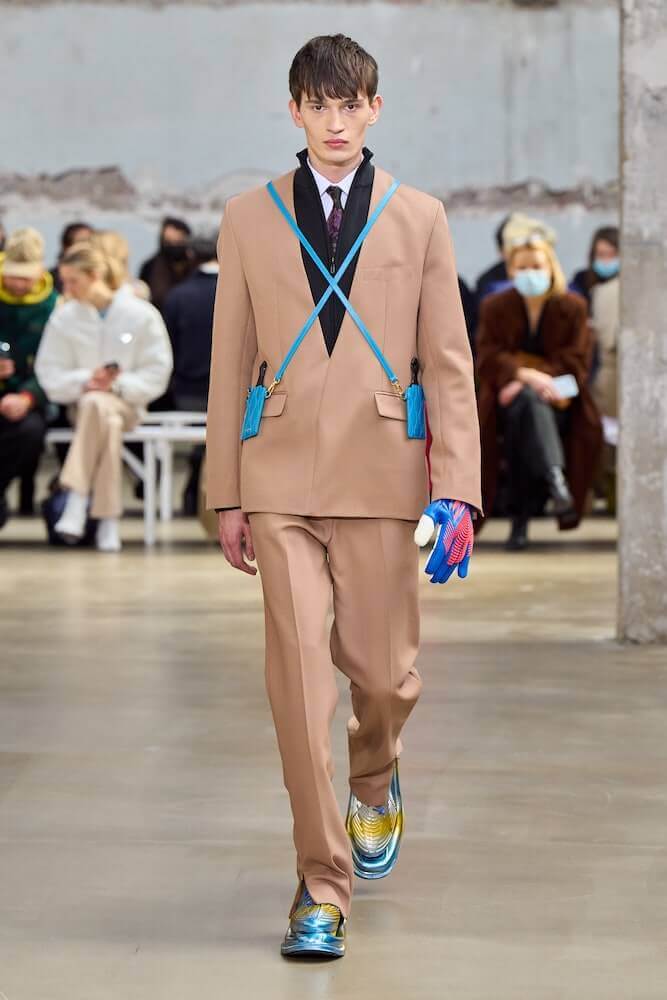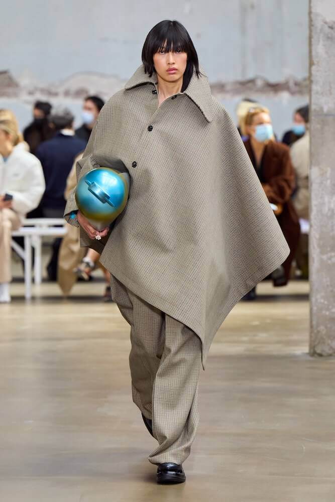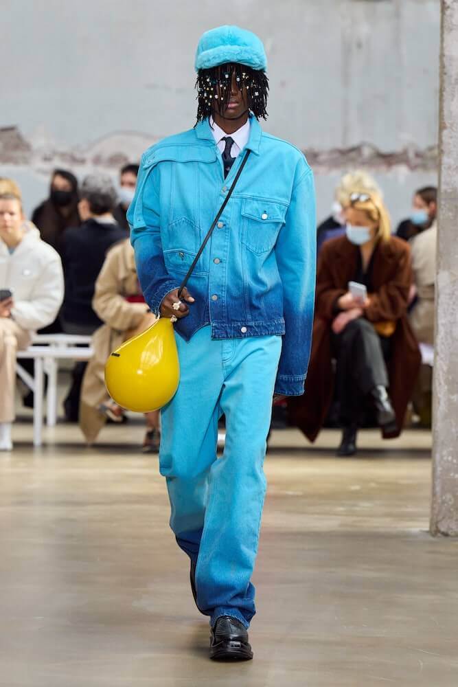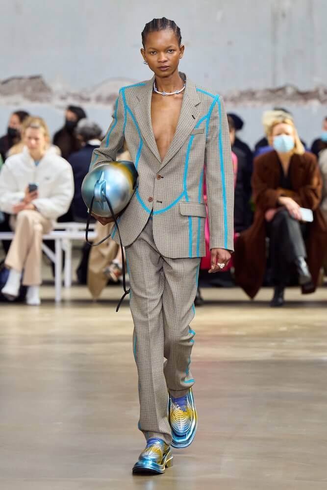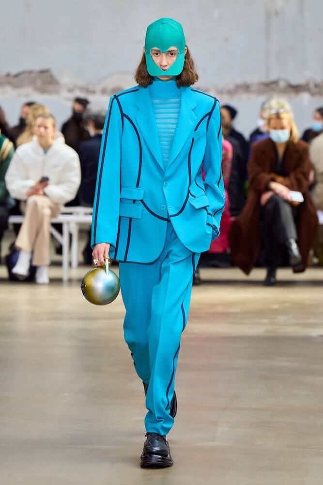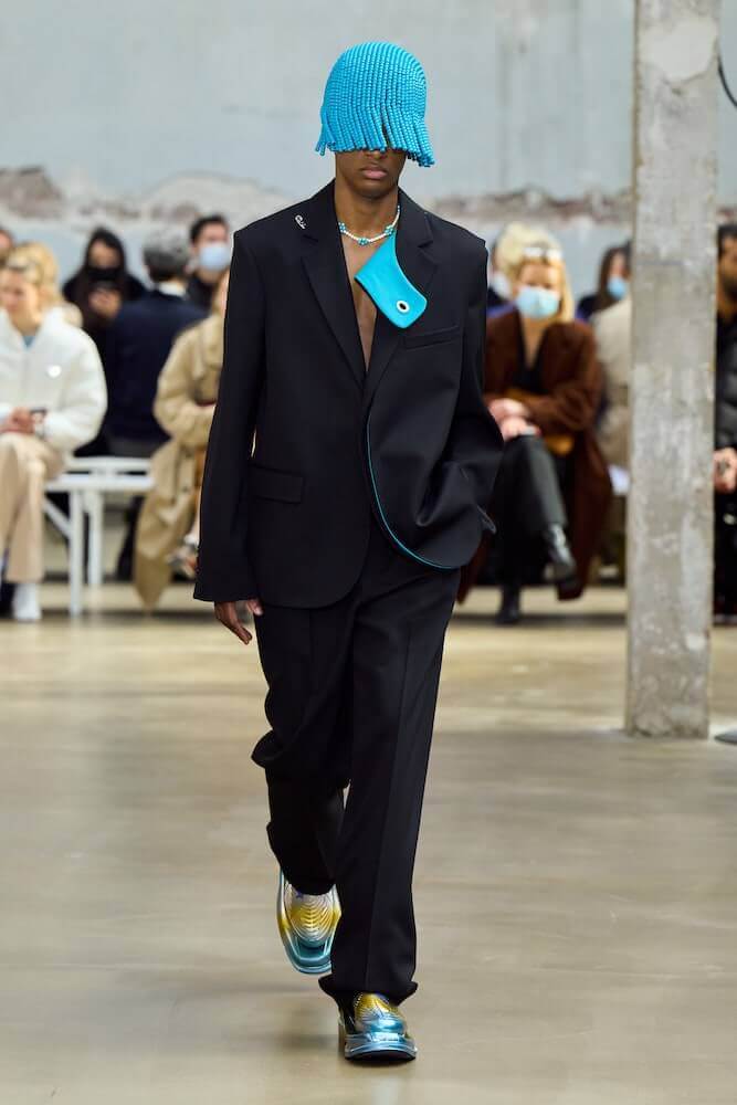 Bringing this belief to life, Botter offered a kaleidoscopic edit chock-full of electric blues, apple greens and sugary pinks. From beginning to end, their sartorial expertise was woven into watercolour suiting, oversized ponchos, fluffy chairs slung over shoulders and bold puffer vests. And, playing with eccentric beading the pair took on tops, hats and even a leather jacket to create uniquely layered Caribbean ornamentation. For AW22, Botter rejoiced in human proclivity to triumph over tragedy.
