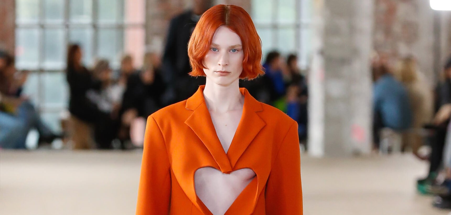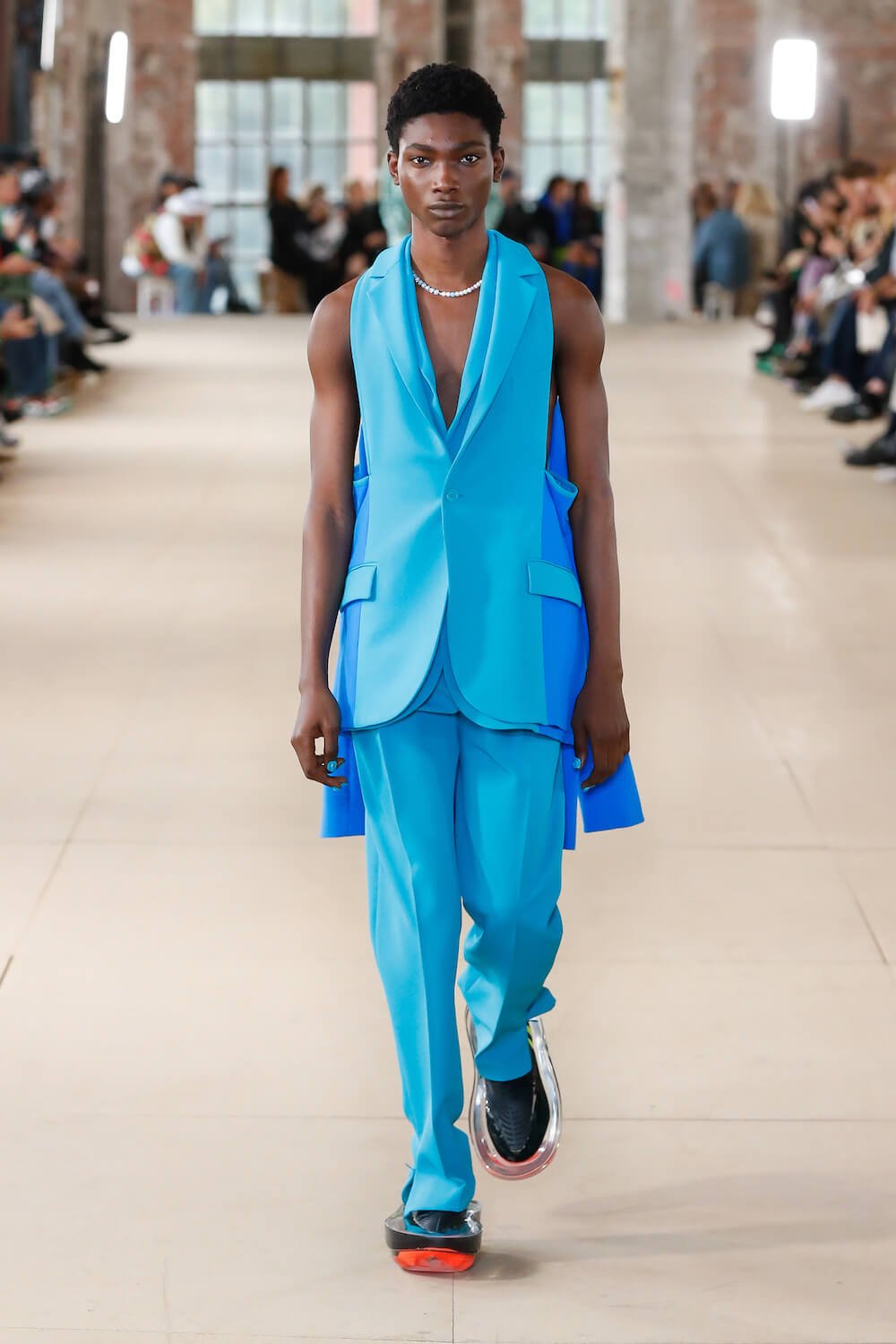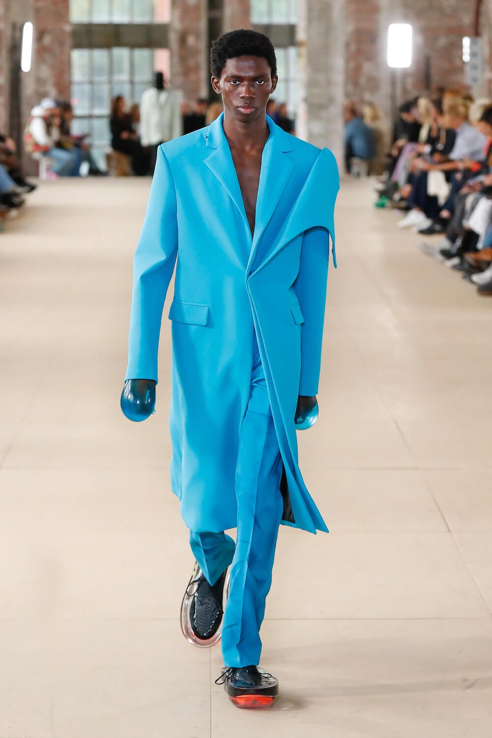 Inspired by the Caribbean Sea – where the duo have set up a coral farm – suits also surfaced in Botter’s blue brand colour, some with heart-shaped lapels and others with subversive slits. Something especially arresting was how models’ hands swam in little prophylactic aquariums across the catwalk, their fingers submerged in XXL condoms filled with dyed water. But Herrebrugh and Botter didn’t come up for air just yet: they also proposed bags made of ice – as ephemeral as the current state of our seas.