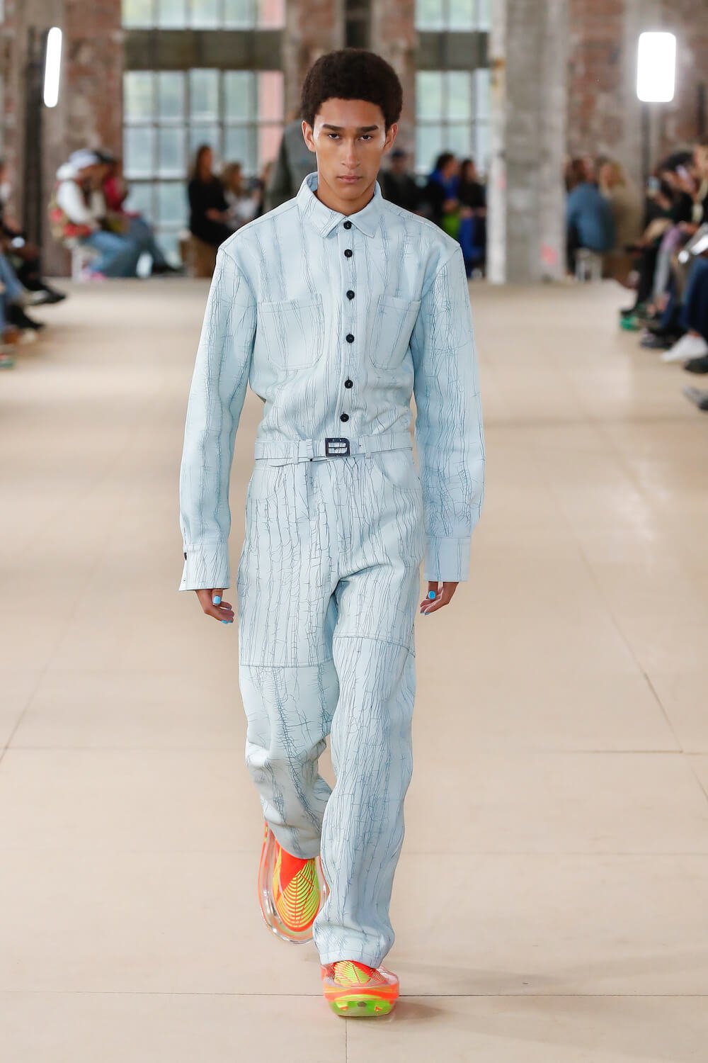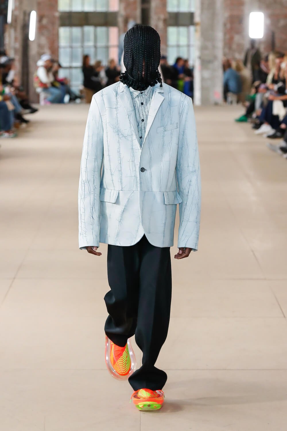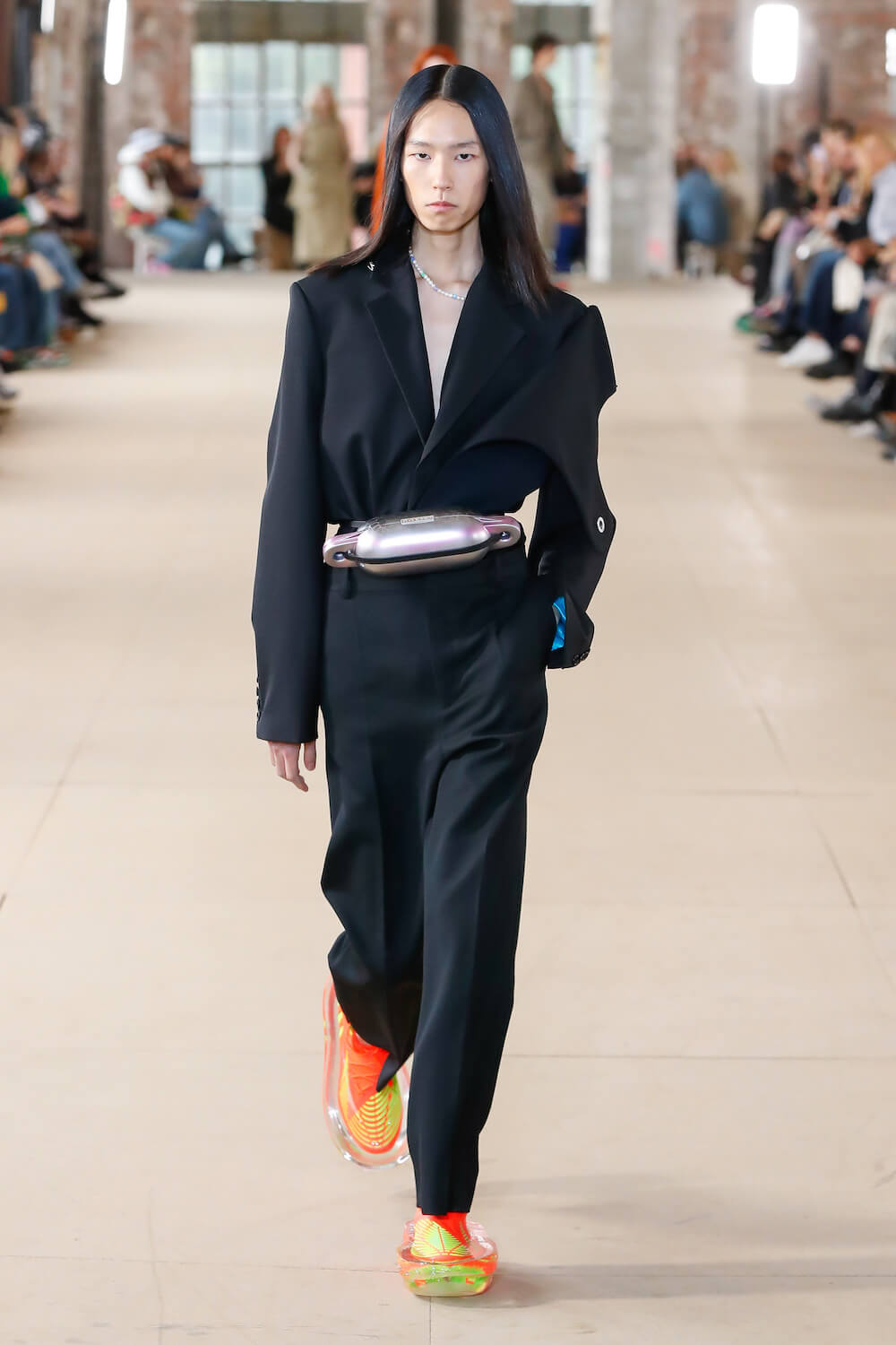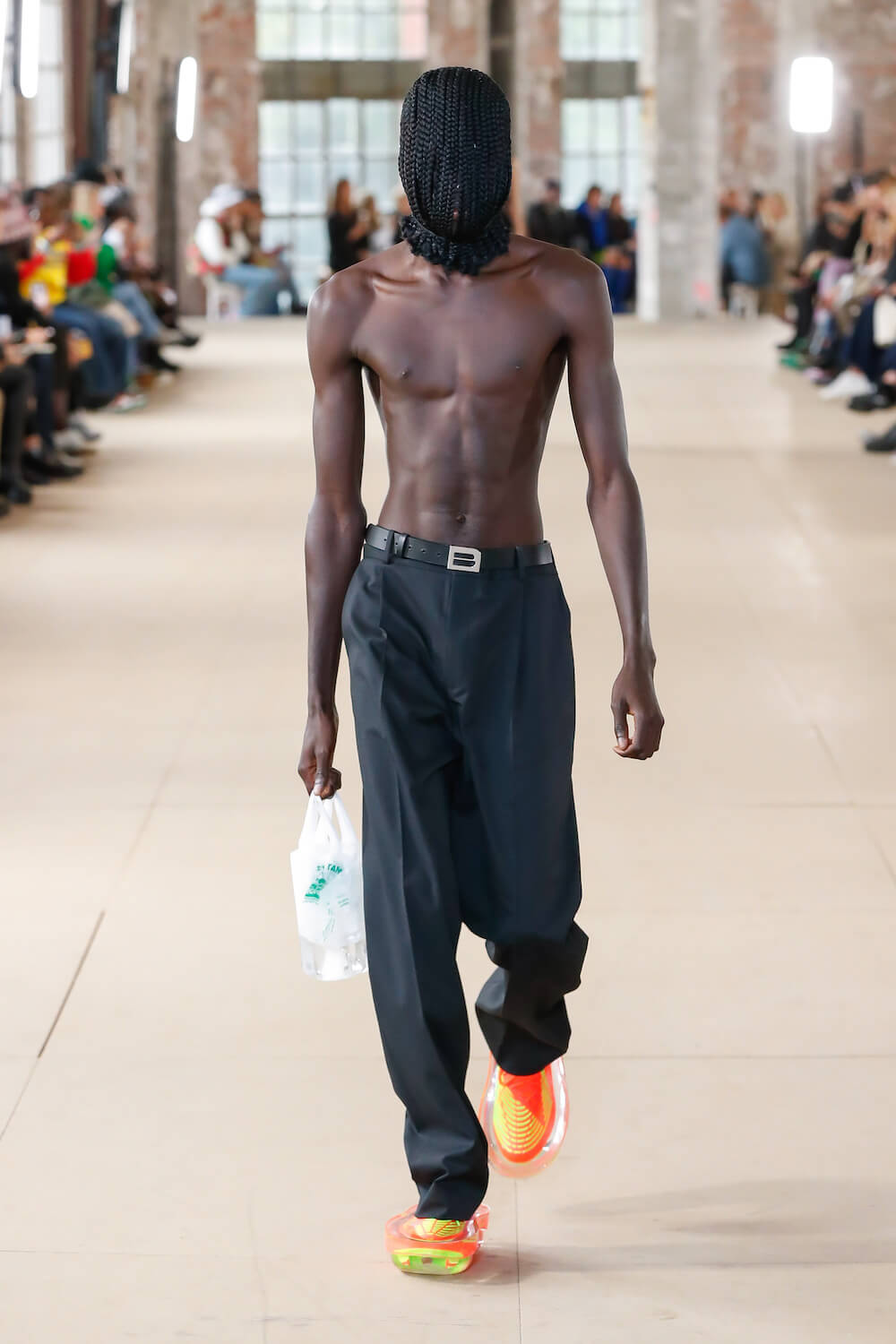 Botter collided with Notpla too, a start-up focussed on formulating home-compostable packaging. For this collection they introduced edible water-bubbles made from seaweed and plants. The trainers were a point of pride, fitted on water-bubble soles so that they felt as if they were floating.