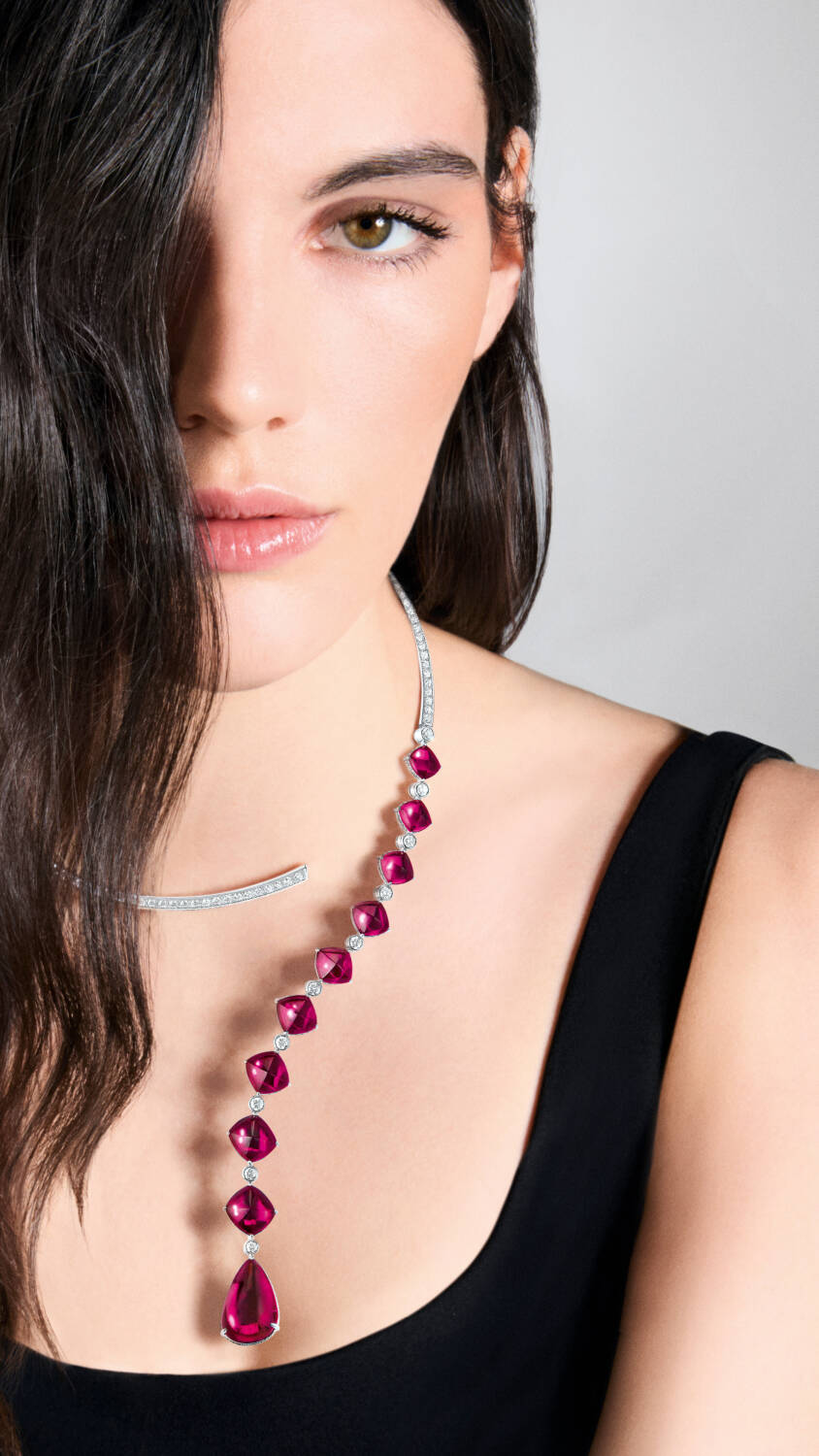 Inspired by an archival image of a custom piece for American businessman Cornelius Vanderbilt dating back to 1884, the refreshed design features a tailor-made system which allows the necklace to be reversible. Easy to operate and available in three distinct colourways – rubellite, tanzanite and green tourmaline – the necklace dons custom-cut rock crystals and pavé diamonds. A variety of motifs are used throughout the offering, ranging from an ivy – inspired by the vibes at Palais Royal where founder Frederic Boucheron’s first boutique was located – to a peacock feature, olive leaf and laurel.