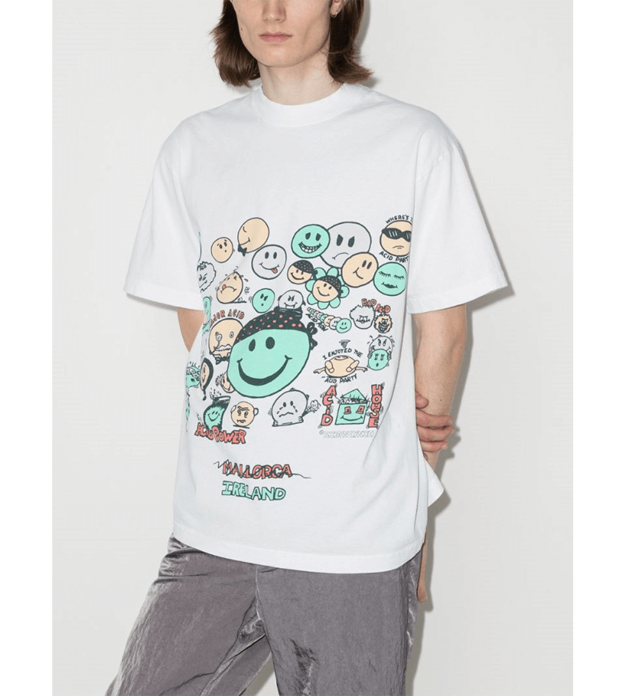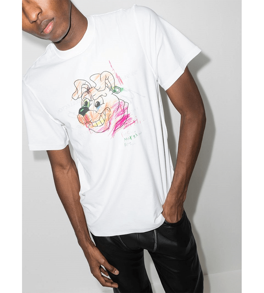 What’s up for grabs, then? Williams pays homage to the craft-makers who help create her collections with a flowchart of her production timeline; Anderson plasters his “Keep Looking Up” mantra against blue skies and sprouting flowers, and Spencer Phipps is basically just grateful to be part of this planet with a hippie tye-dye number. Martine Rose gets her kids on board, with her son scribbling over an old season print of the brand alongside a rendition of her logo by her daughter, and Robyn Lynch puts an Irish spin on one of her mum’s old holiday tees.
