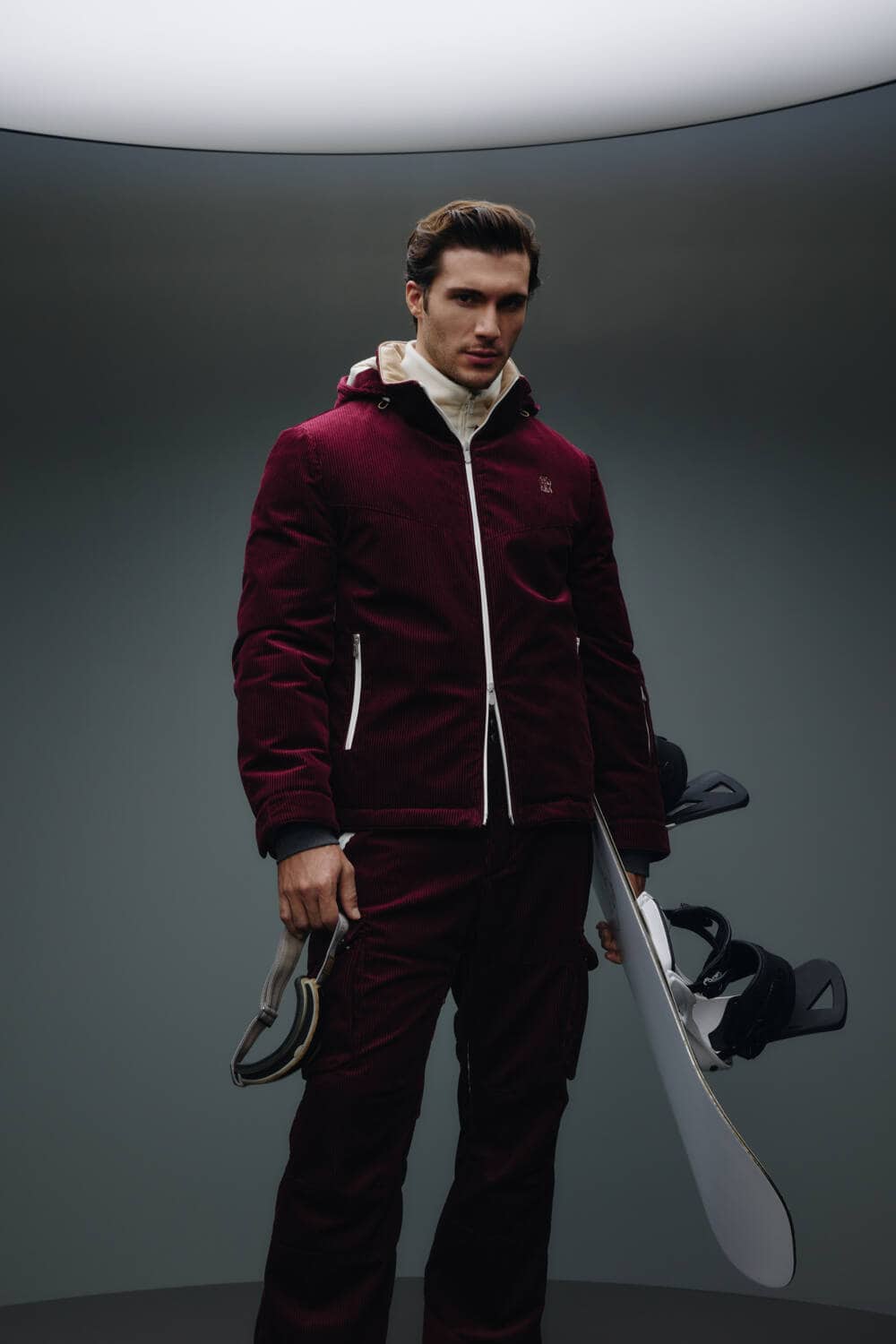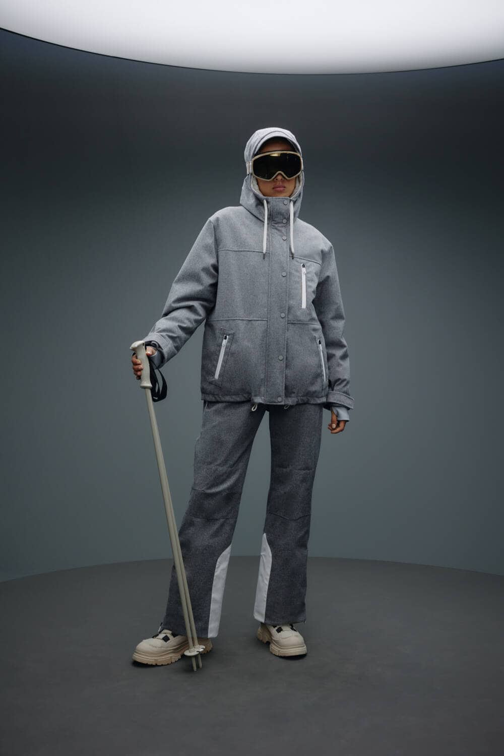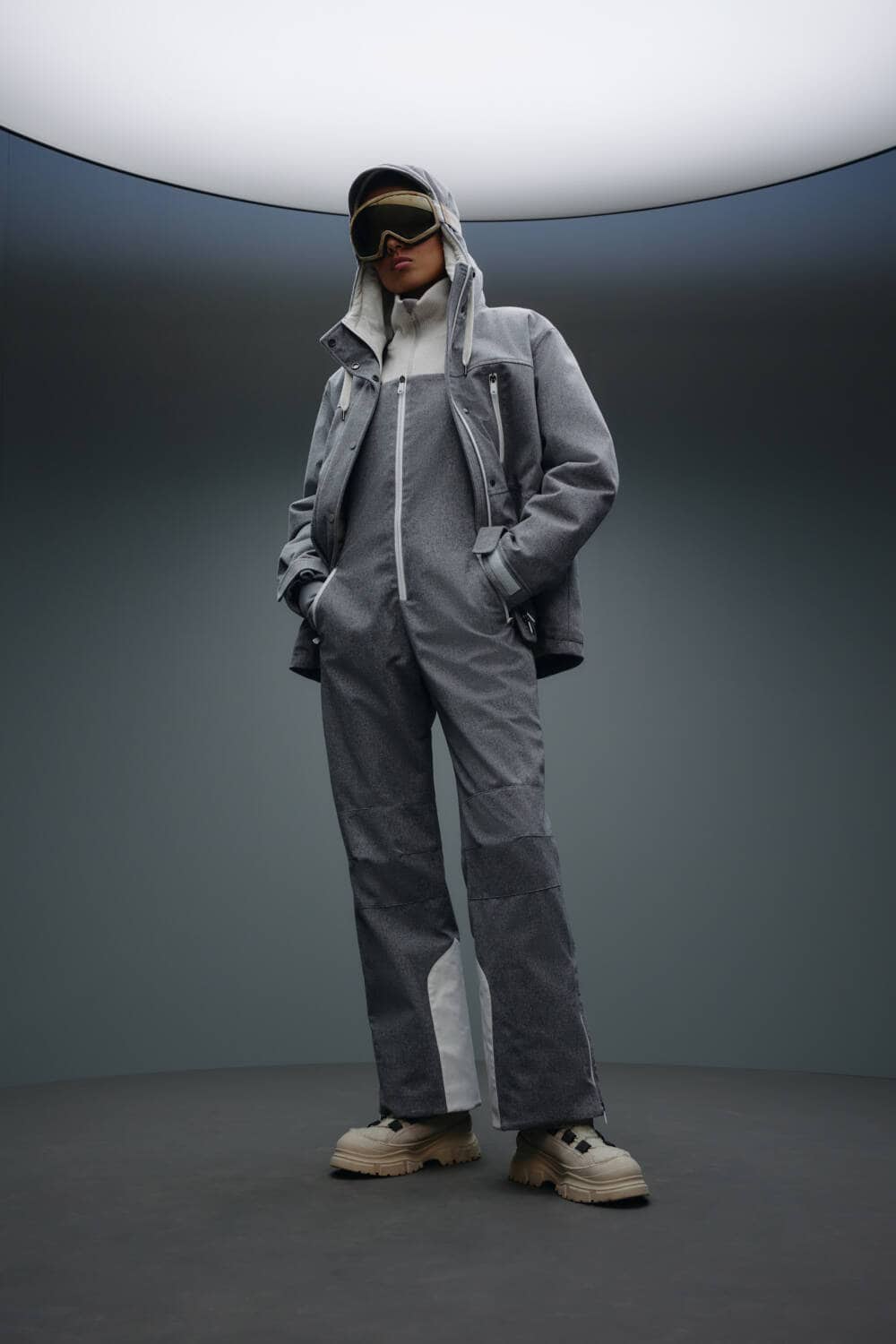 Customers have a versatile range of products to choose from, with the capsule offering both garments for both men and women, ranging from jumpsuits to boots to matching sets. An understated colour palette of grey, beige, maroon and black make the pieces perfect for those wanting to look sleek on the slopes.