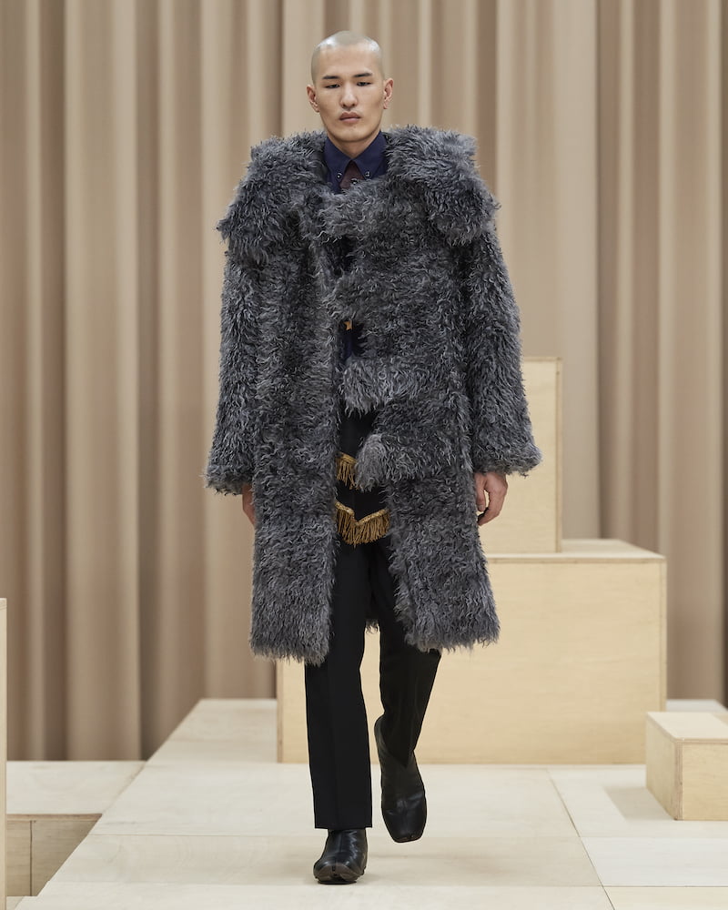 Outerwear played a starring role in this show with Tisci taking Burberry classics like the trench, duffle and car coat, but giving them a totally new energy. He radically transformed these traditional pieces with unconventional cuts and hybrid structures. A trench at the front is a Harrington from behind. Pleats and bullion fringing added a dynamic sense of movement as the models swept around a specially constructed wooden set. Silk scarves cinched waists, knitwear and outerwear melded with V-neck trenches worn like tunics over trousers. Messenger bags were magnified to supersize proportions. Tisci also proposed shirt dresses worn with over-the-knee, leather sock-boots as an alternative to a traditional masculine shirt.