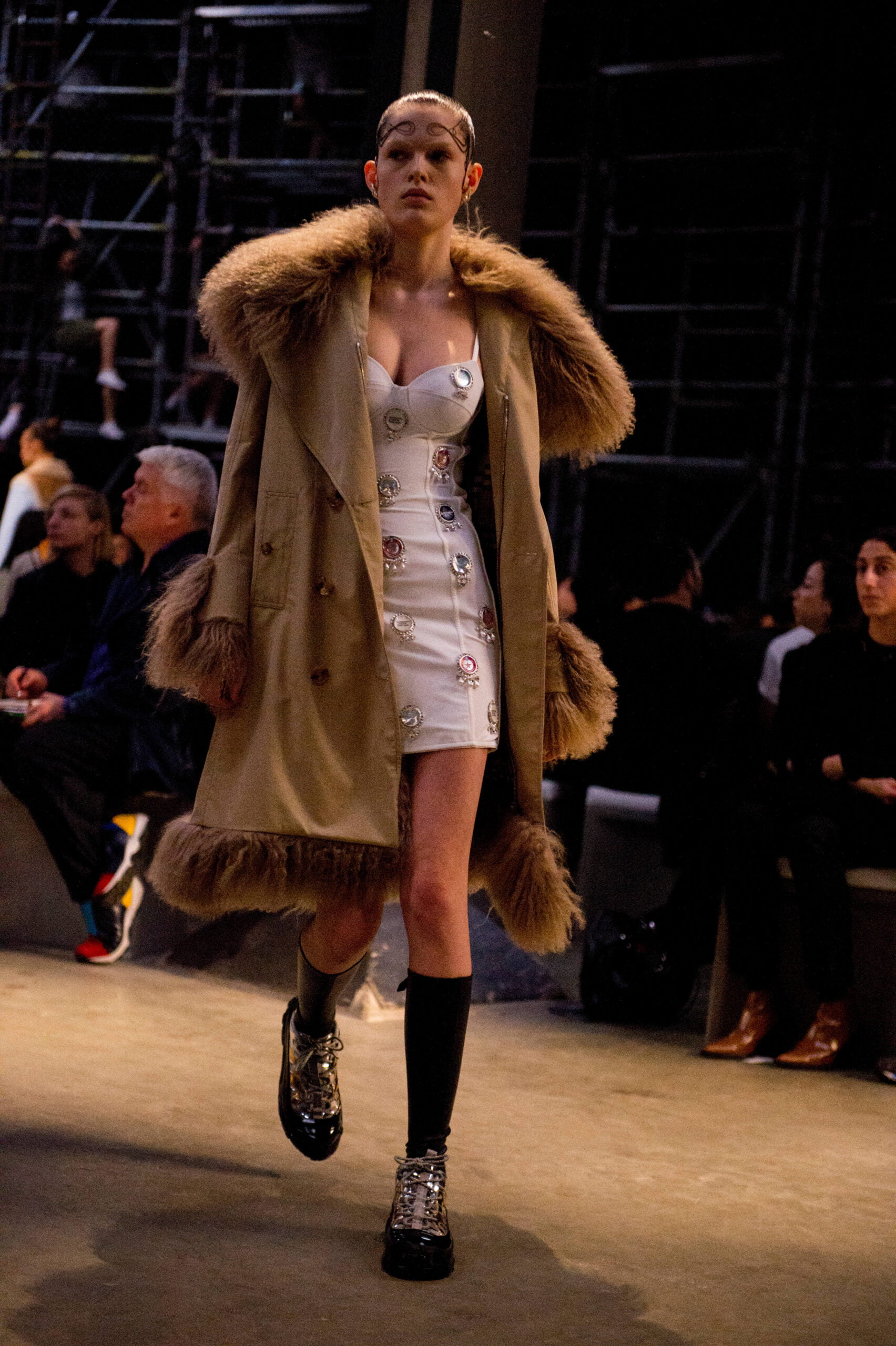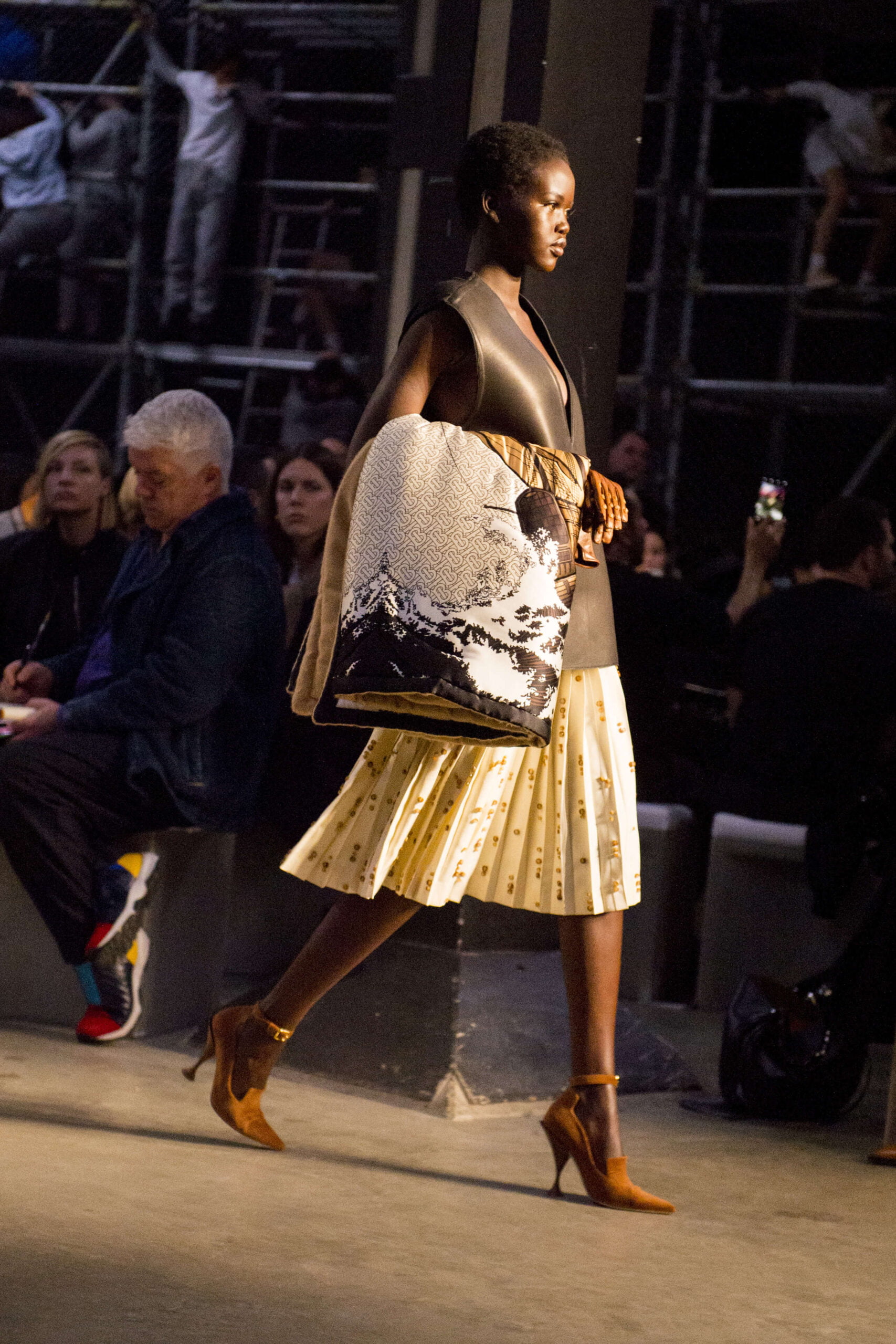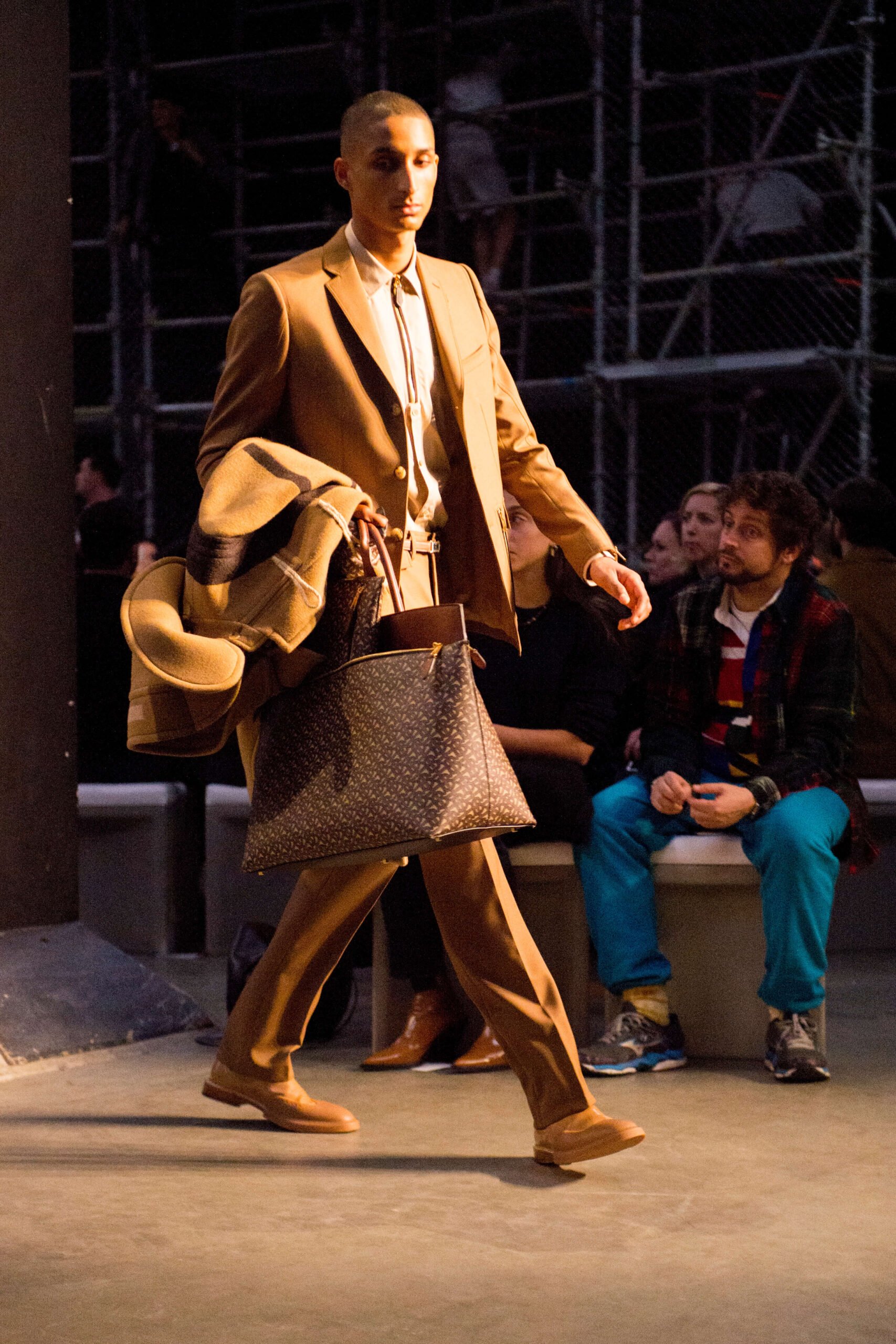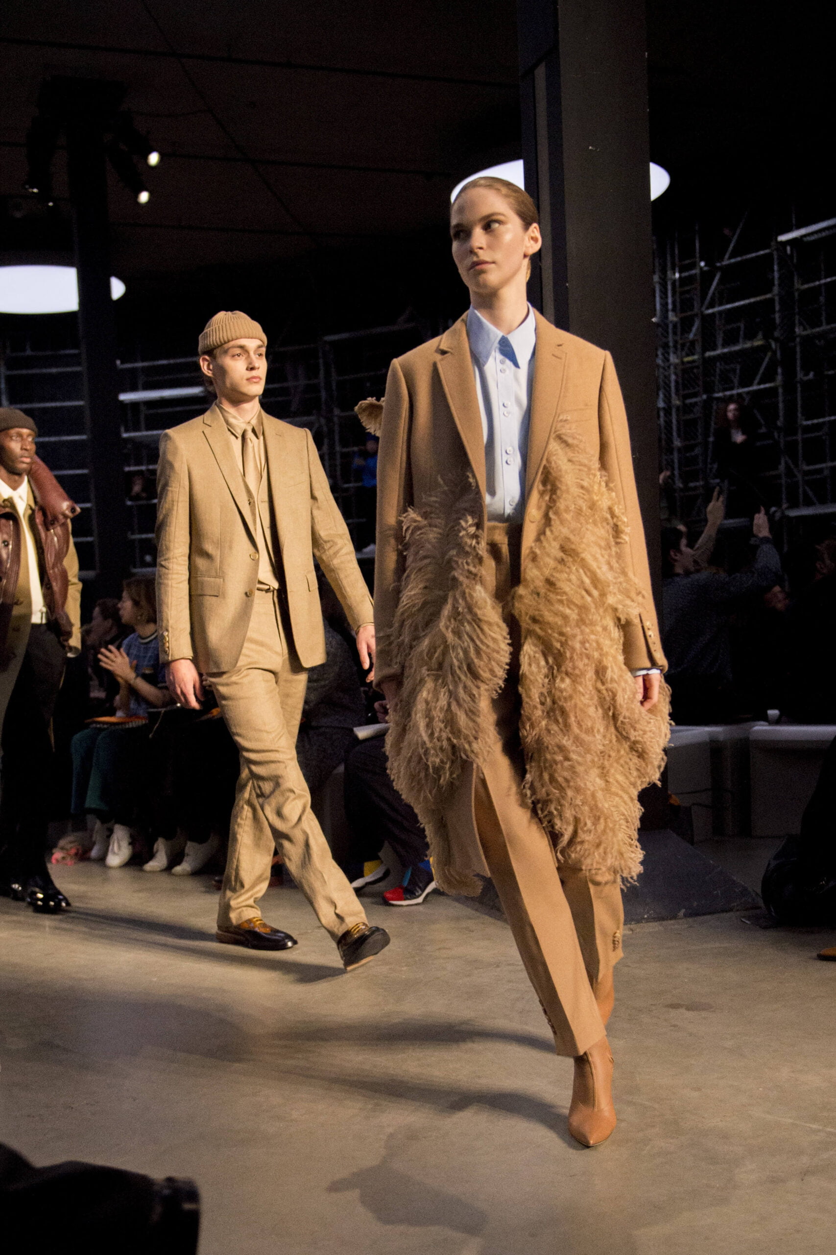 Tisci played up the British duality of bourgeois and rebel by showing the same collection in two opposing rooms, with two bespoke soundtracks by M.I.A. One room was formal and wood panelled, the other, lined with scaffolding over which youths in non-branded grey marl tracksuits and hoodies swarmed, watching the proceedings below like the crowd in Mad Max Beyond Thunderdome. At the end of the show their cheers raised the roof. Burberry gets the youth vote.