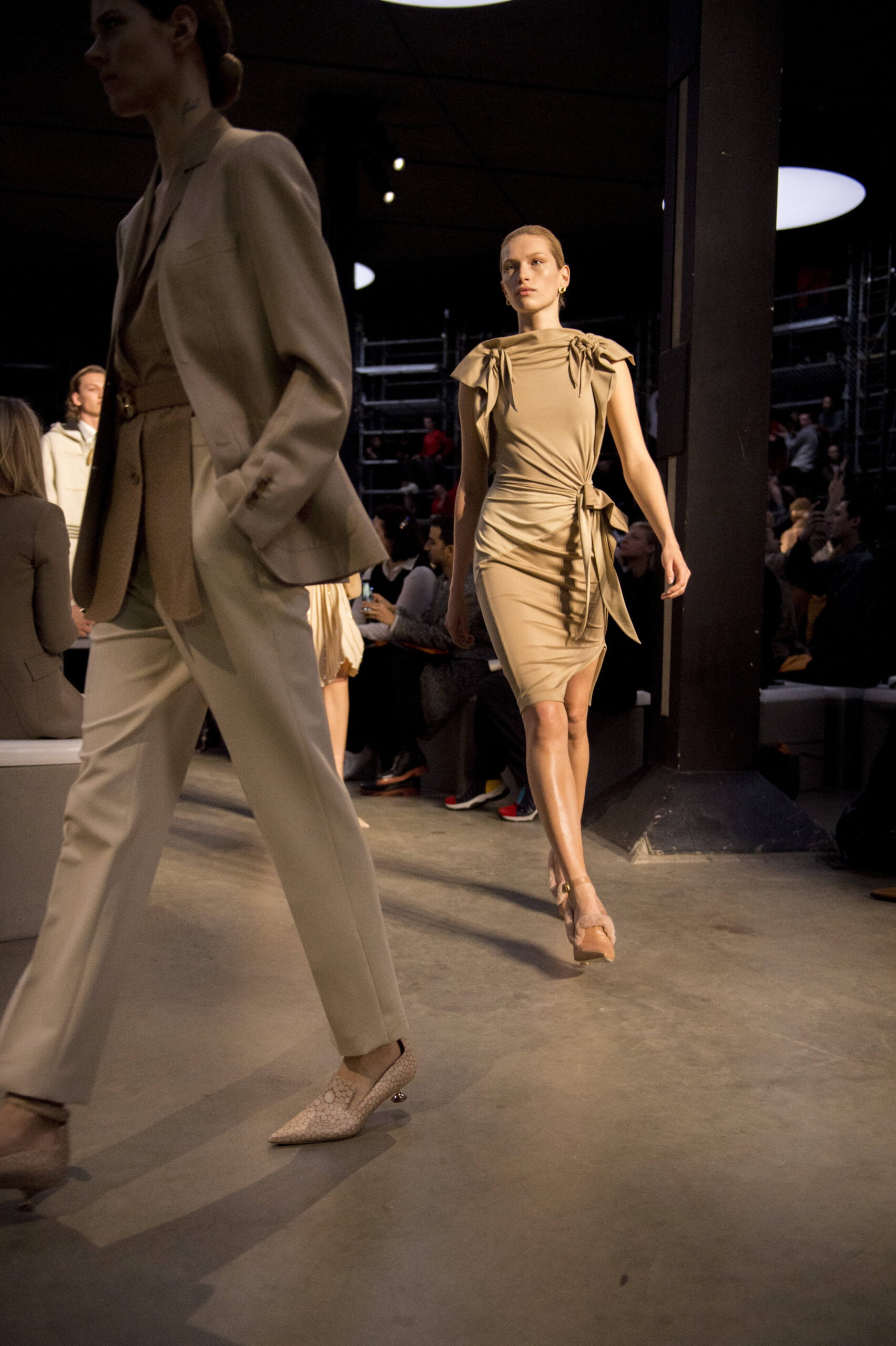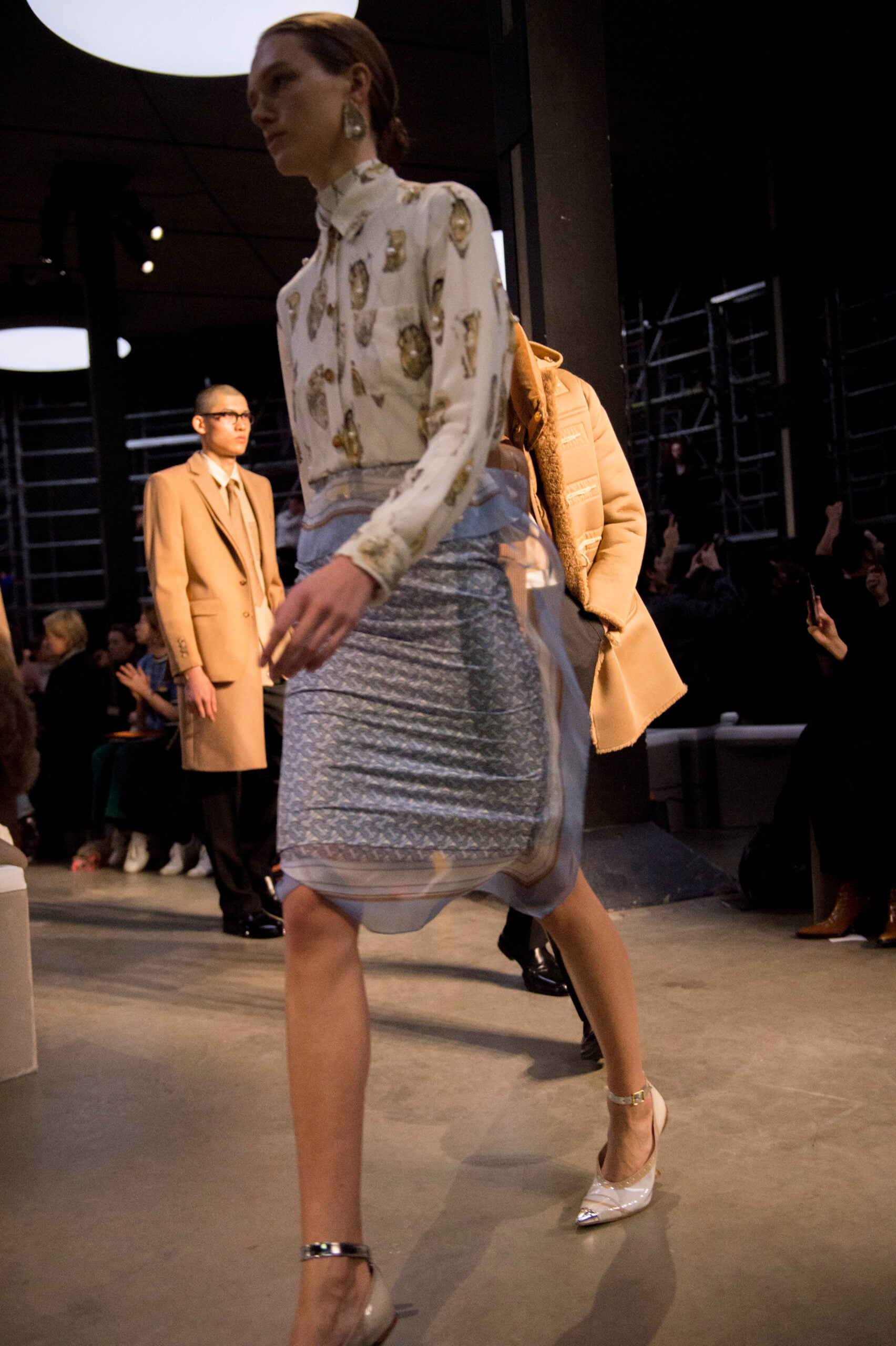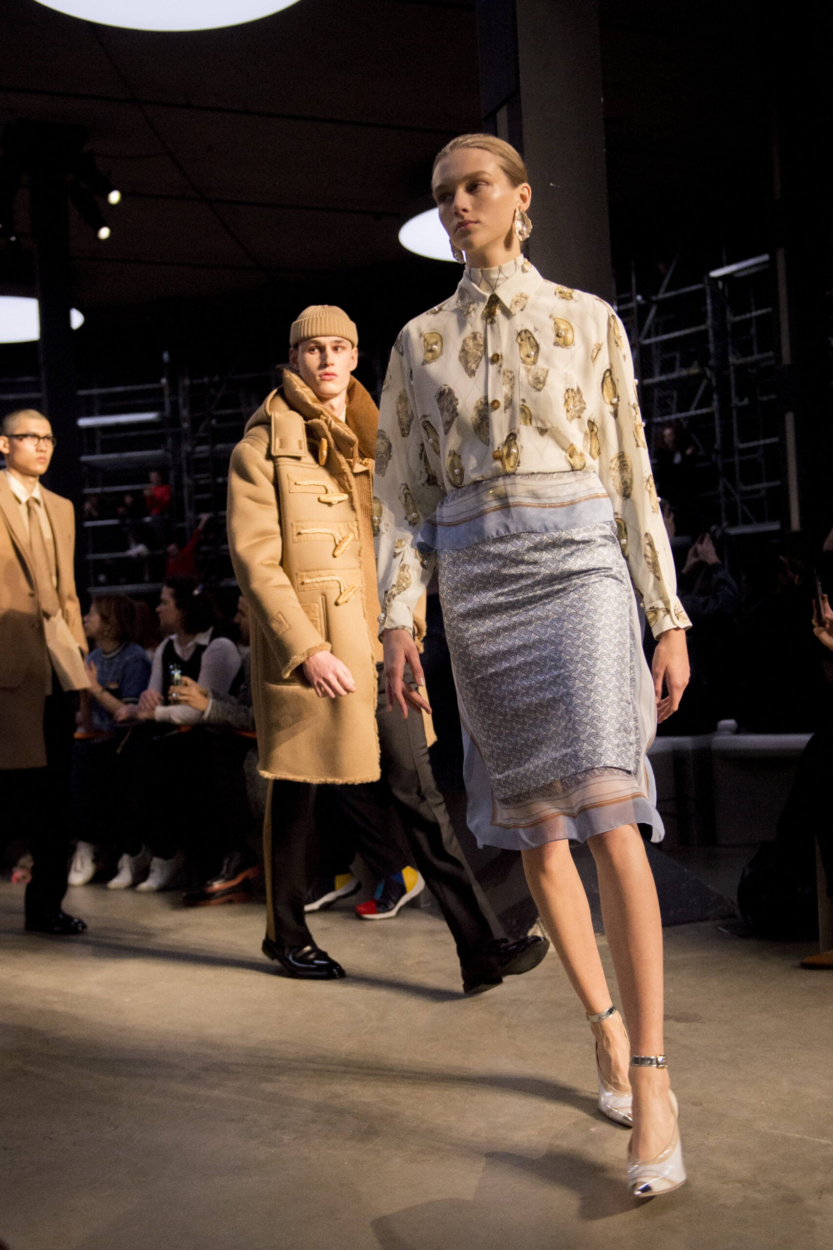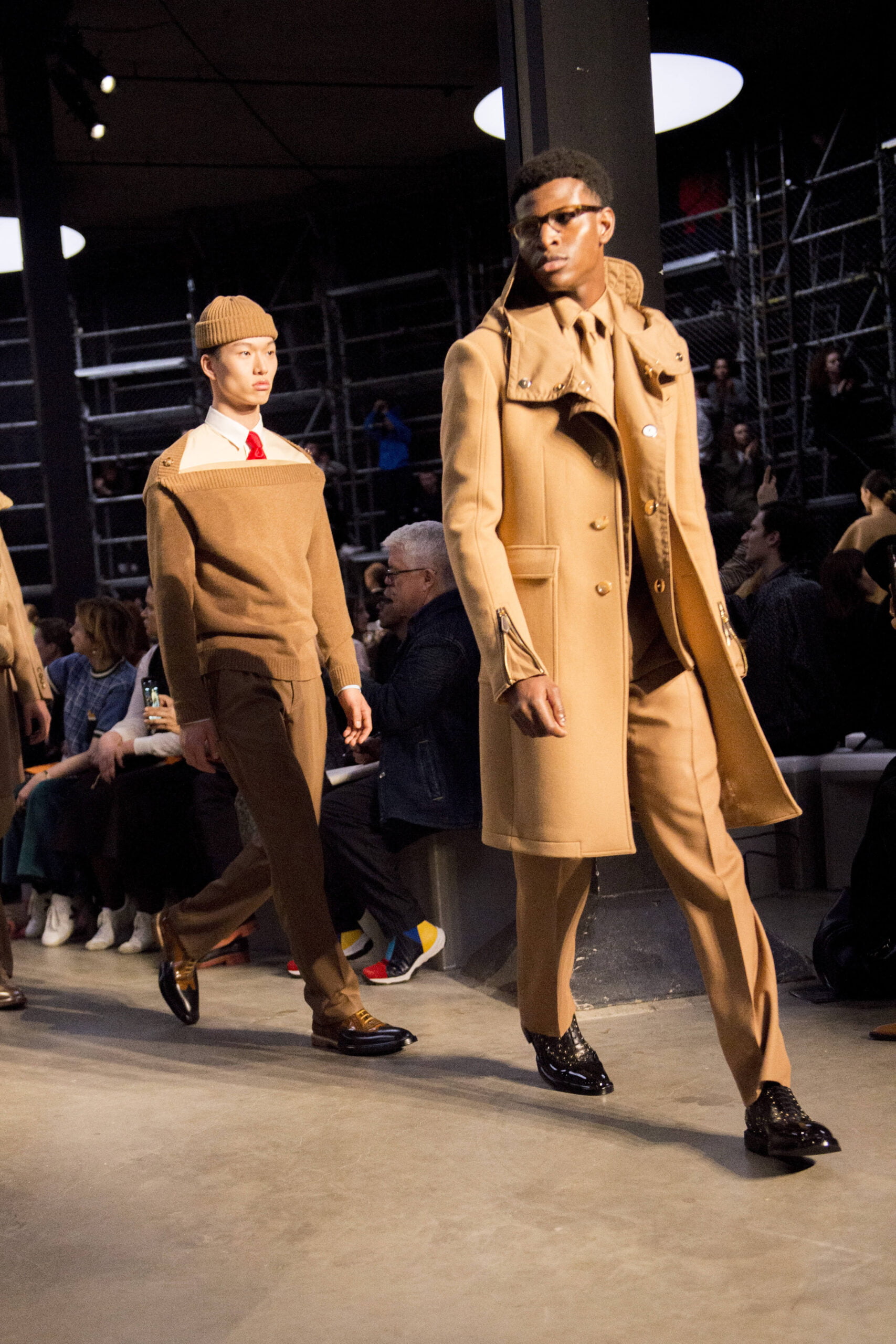 Tisci played up the British duality of bourgeois and rebel by showing the same collection in two opposing rooms, with two bespoke soundtracks by M.I.A. One room was formal and wood panelled, the other, lined with scaffolding over which youths in non-branded grey marl tracksuits and hoodies swarmed, watching the proceedings below like the crowd in Mad Max Beyond Thunderdome. At the end of the show their cheers raised the roof. Burberry gets the youth vote.