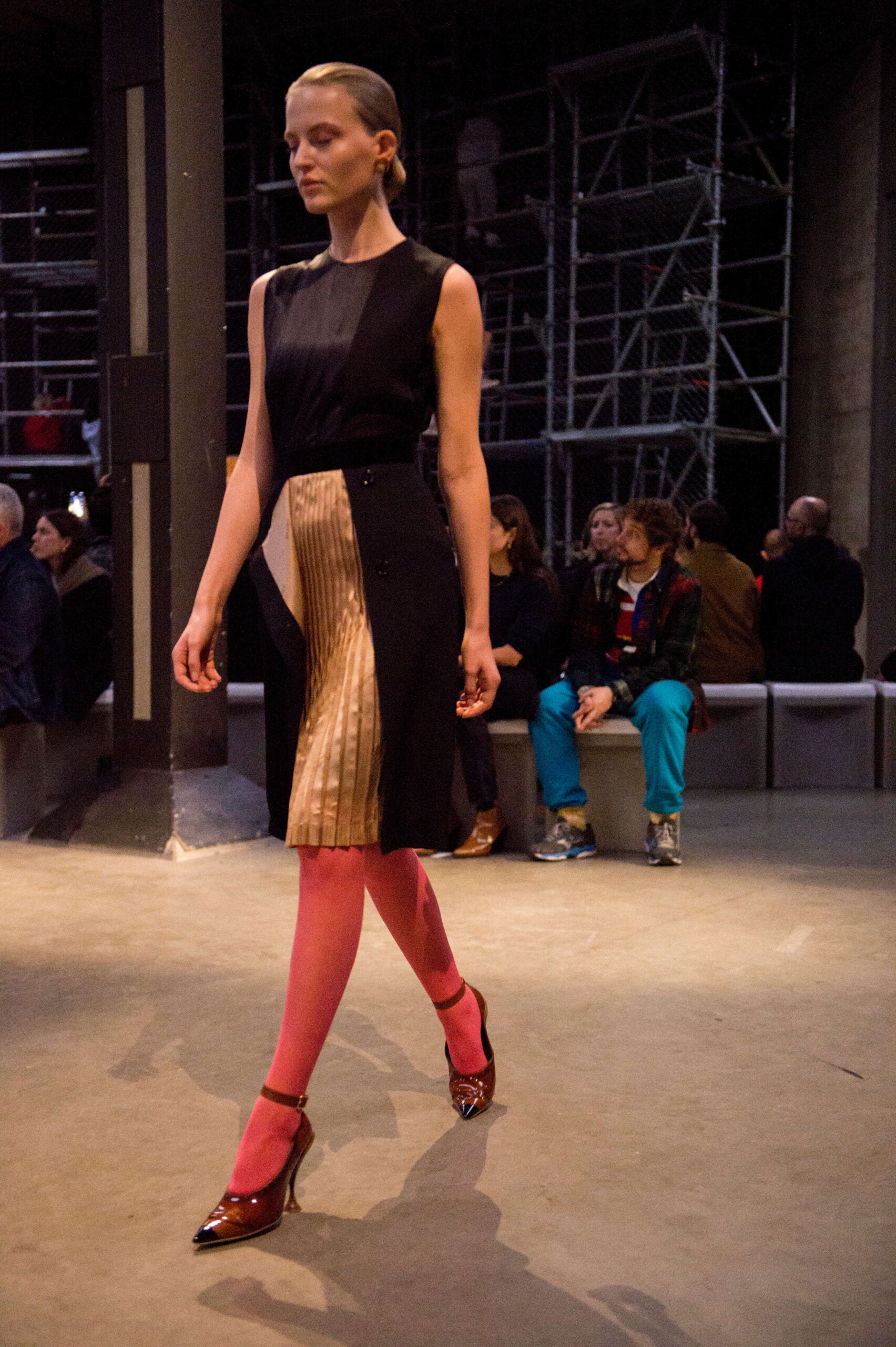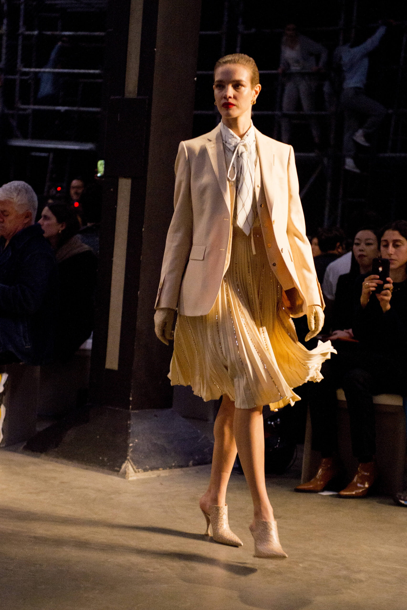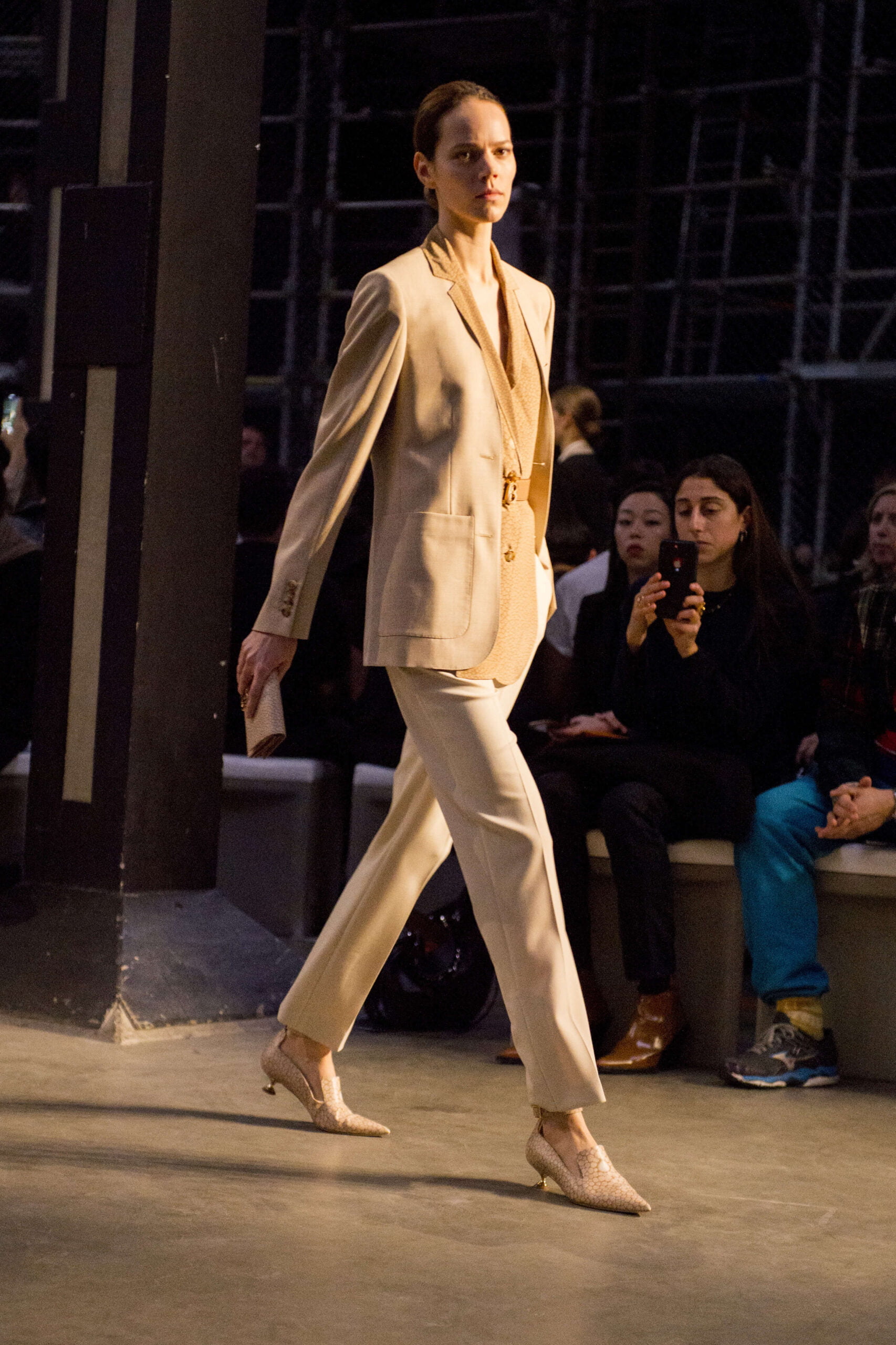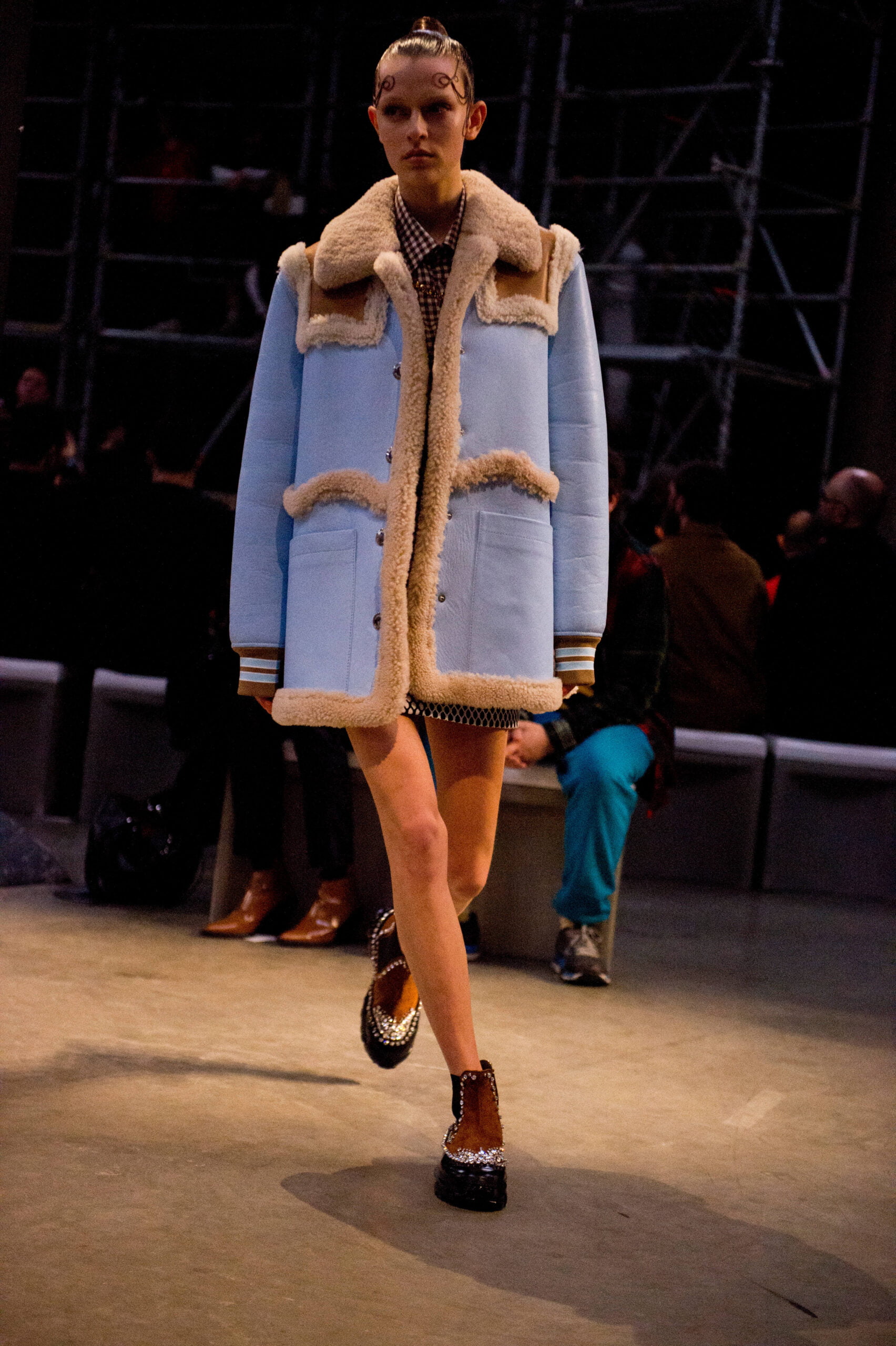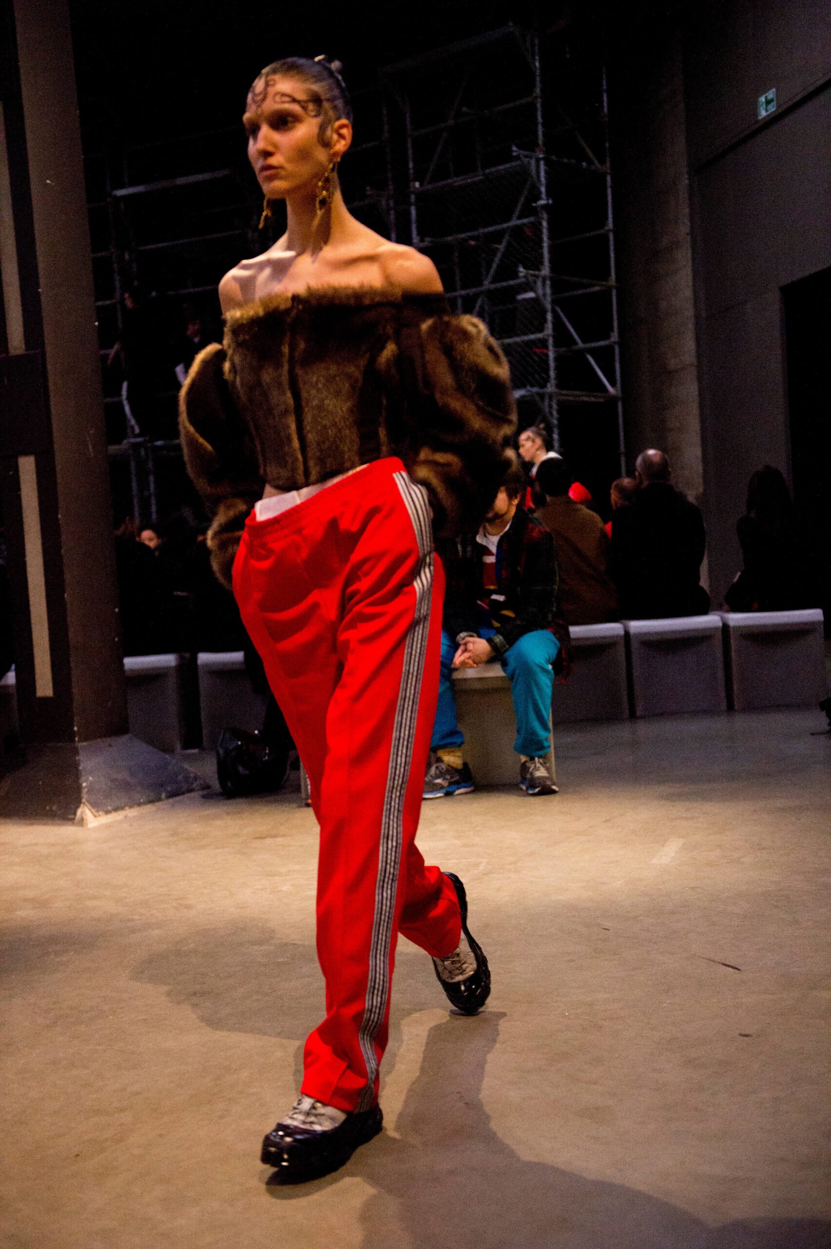 Tisci played up the British duality of bourgeois and rebel by showing the same collection in two opposing rooms, with two bespoke soundtracks by M.I.A. One room was formal and wood panelled, the other, lined with scaffolding over which youths in non-branded grey marl tracksuits and hoodies swarmed, watching the proceedings below like the crowd in Mad Max Beyond Thunderdome. At the end of the show their cheers raised the roof. Burberry gets the youth vote.
