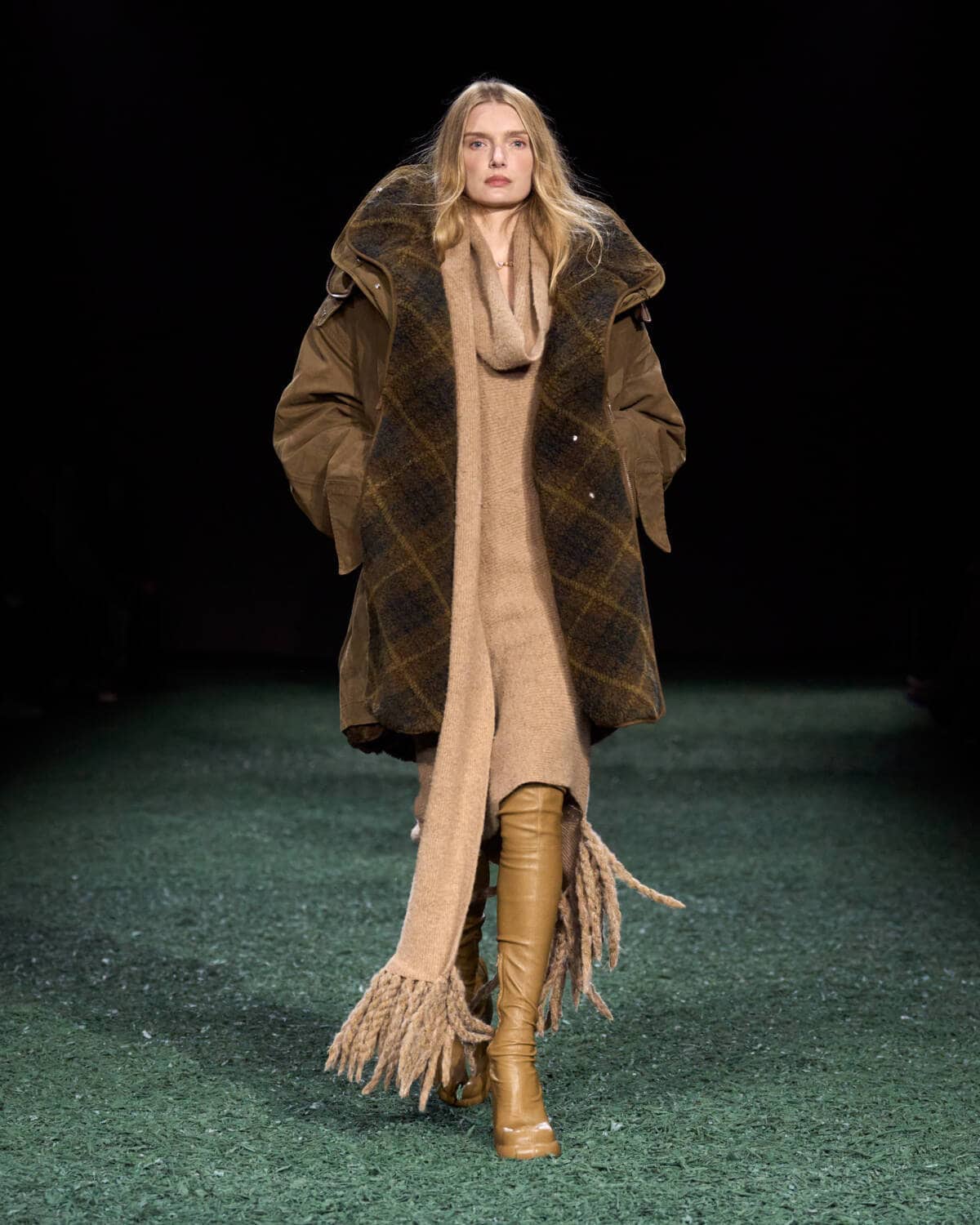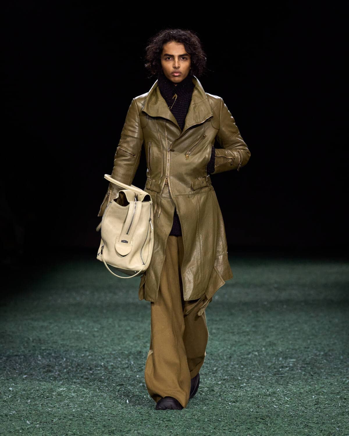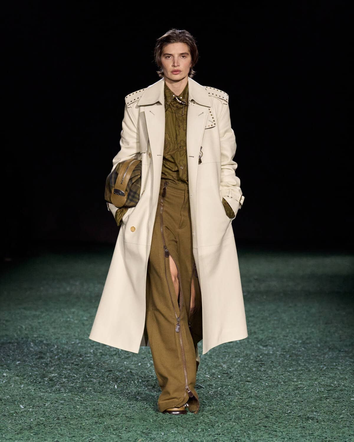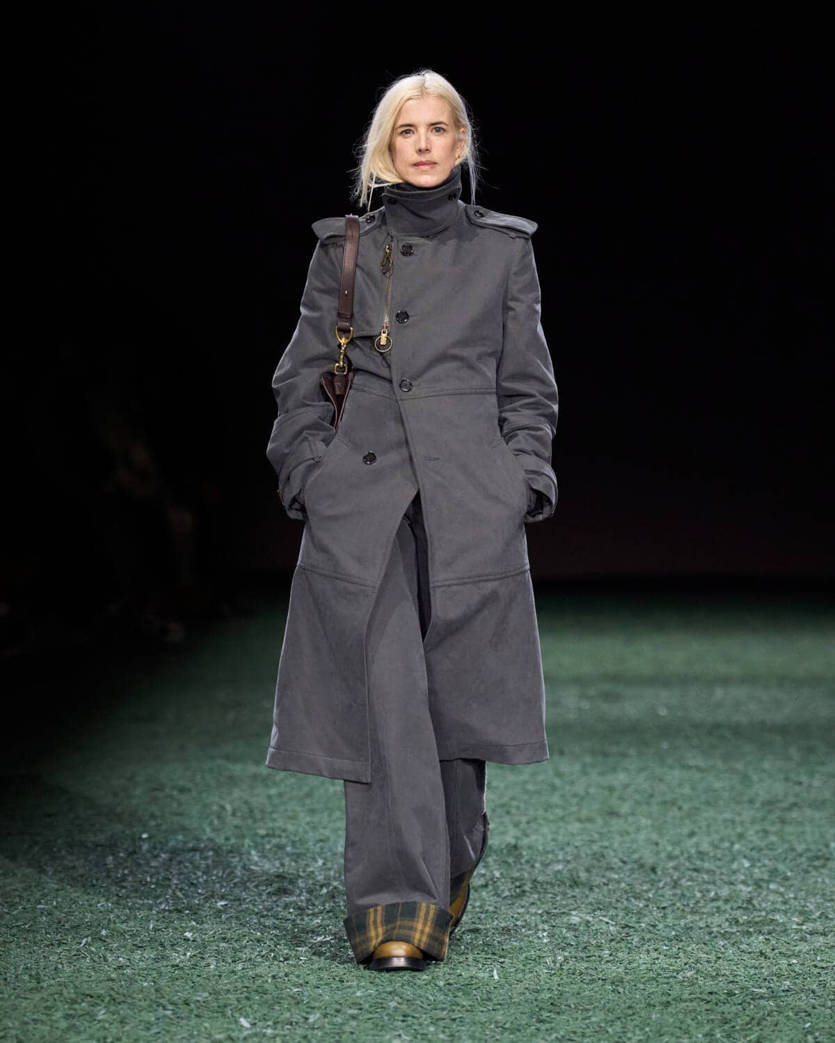 Are coats the new bags? Burberry’s Daniel Lee sent out a symphony of terrific outerwear that had you wishing for cold weather, rain and the pleasure of a long walk. The show was held in a vast tent in East London’s Victoria Park. From the outside it looked like a supersized medieval jousting arena, inside it was carpeted with a moss-and-mulch catwalk, setting the tone for a show that leaned hard into outdoorsy elegance. There were trench coats galore in buttery leather and classic waxed cotton worn with matching trousers, archival check and Donegal tweed. Adorned with an array of practical flaps and fastenings, they came with a sense of rugged purpose. This is the sweet spot that Daniel Lee is steering Burberry into with pieces that thrill with real-life appeal – built to last with lifelong wearability.