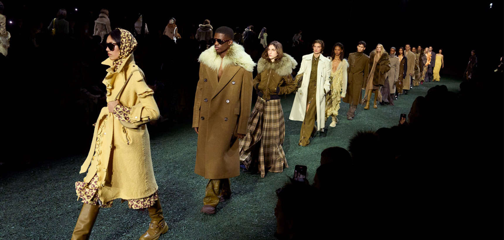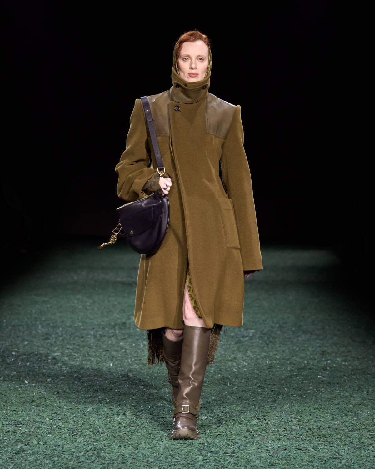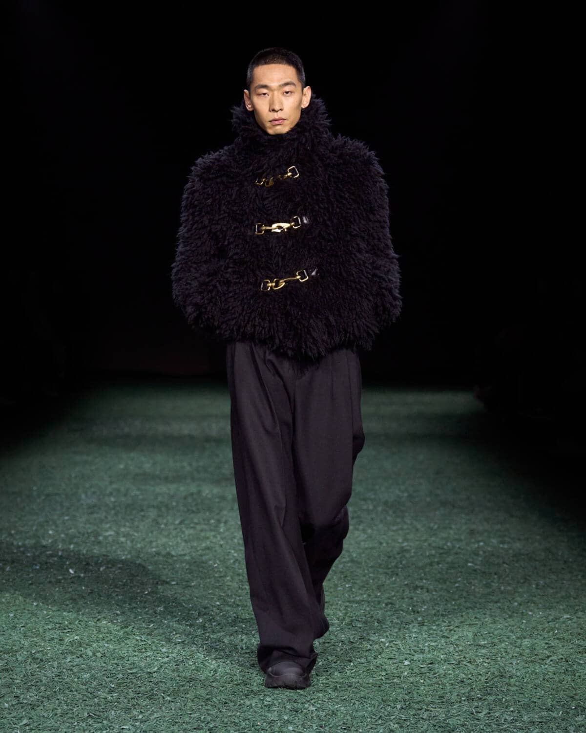 Are coats the new bags? Burberry’s Daniel Lee sent out a symphony of terrific outerwear that had you wishing for cold weather, rain and the pleasure of a long walk. The show was held in a vast tent in East London’s Victoria Park. From the outside it looked like a supersized medieval jousting arena, inside it was carpeted with a moss-and-mulch catwalk, setting the tone for a show that leaned hard into outdoorsy elegance. There were trench coats galore in buttery leather and classic waxed cotton worn with matching trousers, archival check and Donegal tweed. Adorned with an array of practical flaps and fastenings, they came with a sense of rugged purpose. This is the sweet spot that Daniel Lee is steering Burberry into with pieces that thrill with real-life appeal – built to last with lifelong wearability.