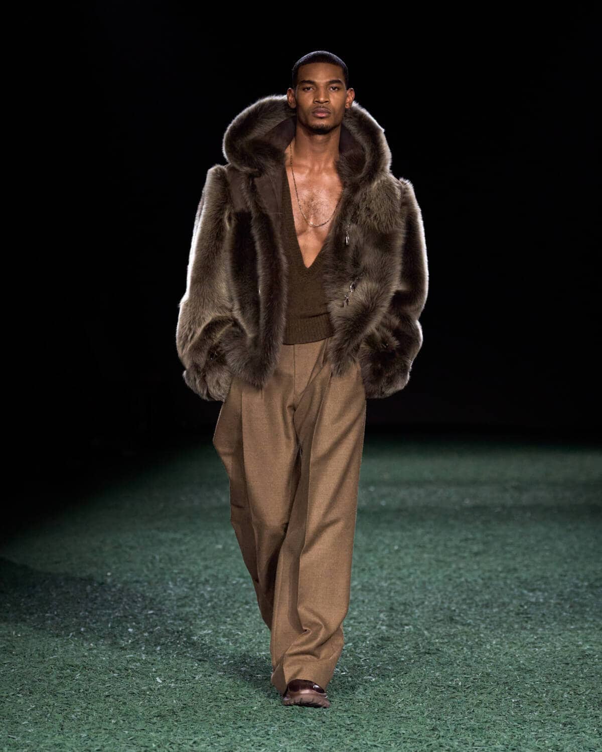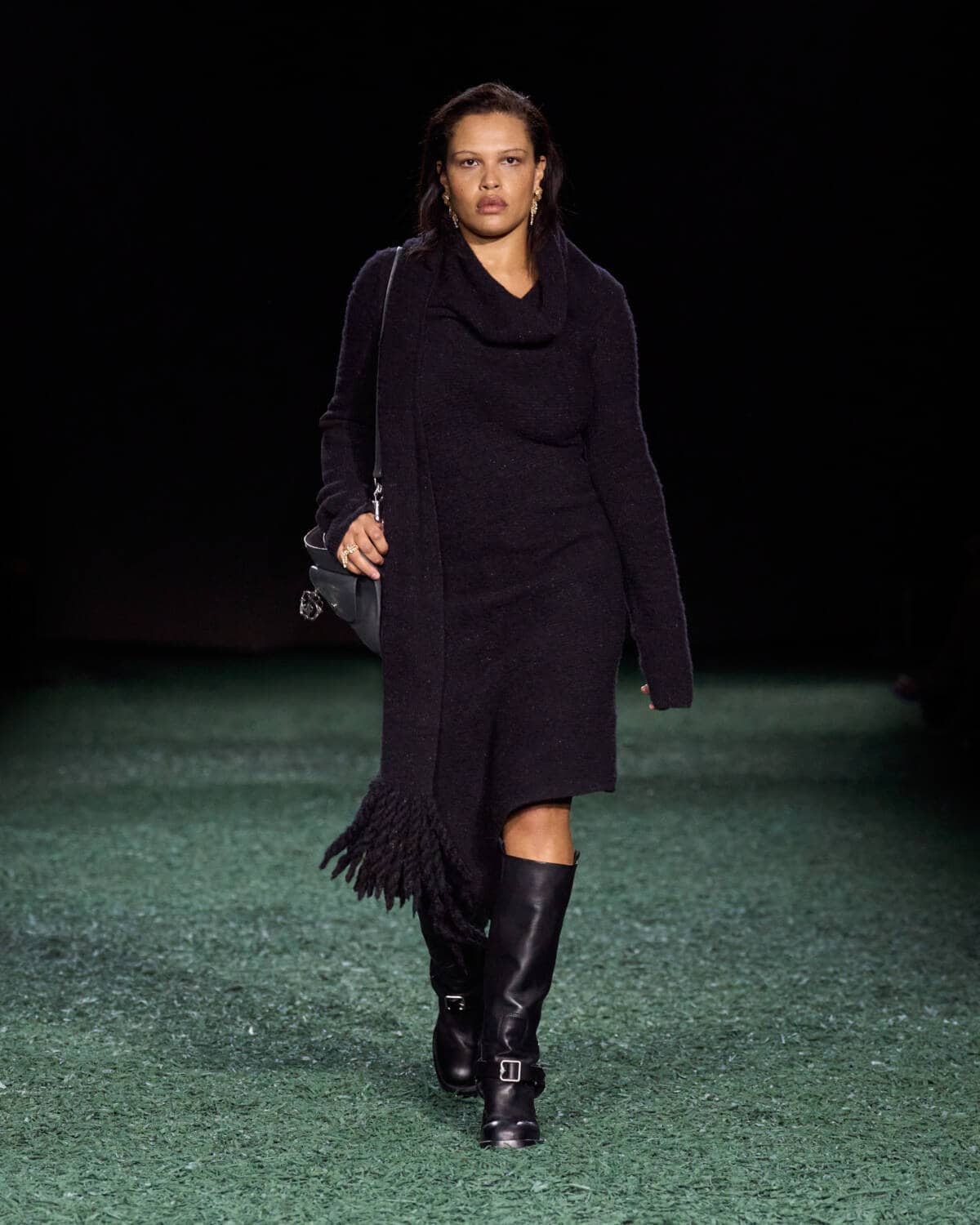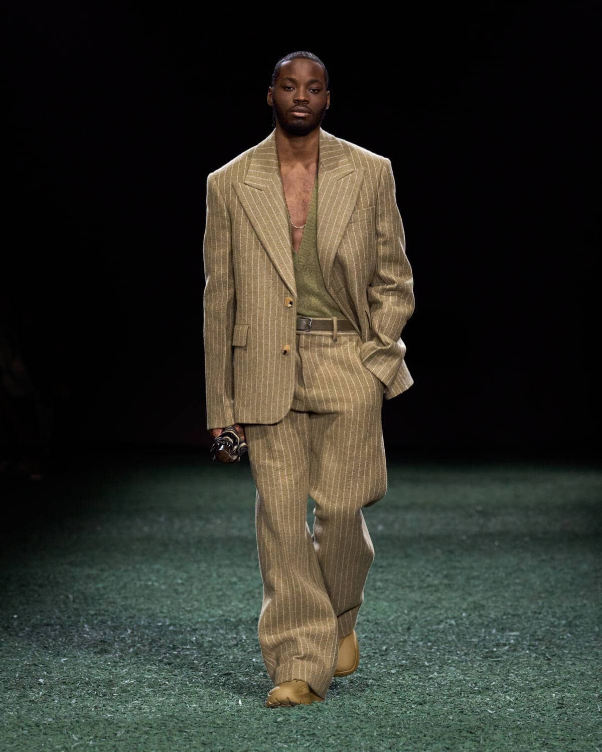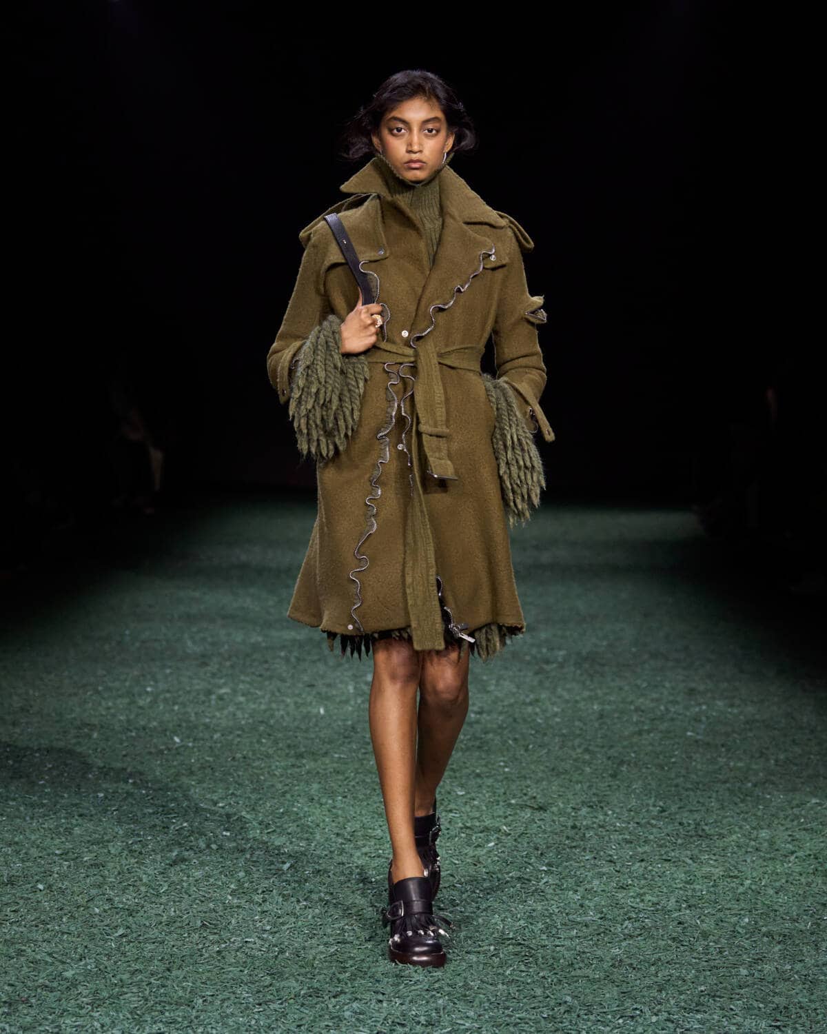 Are coats the new bags? Burberry’s Daniel Lee sent out a symphony of terrific outerwear that had you wishing for cold weather, rain and the pleasure of a long walk. The show was held in a vast tent in East London’s Victoria Park. From the outside it looked like a supersized medieval jousting arena, inside it was carpeted with a moss-and-mulch catwalk, setting the tone for a show that leaned hard into outdoorsy elegance. There were trench coats galore in buttery leather and classic waxed cotton worn with matching trousers, archival check and Donegal tweed. Adorned with an array of practical flaps and fastenings, they came with a sense of rugged purpose. This is the sweet spot that Daniel Lee is steering Burberry into with pieces that thrill with real-life appeal – built to last with lifelong wearability.