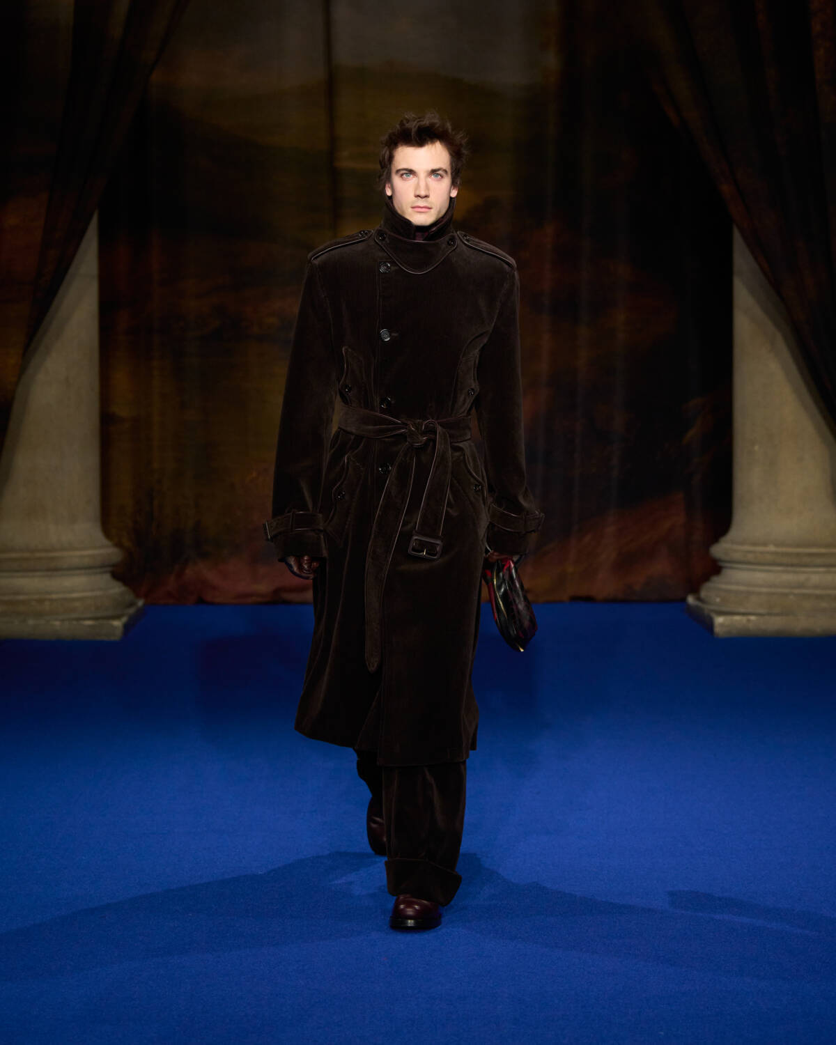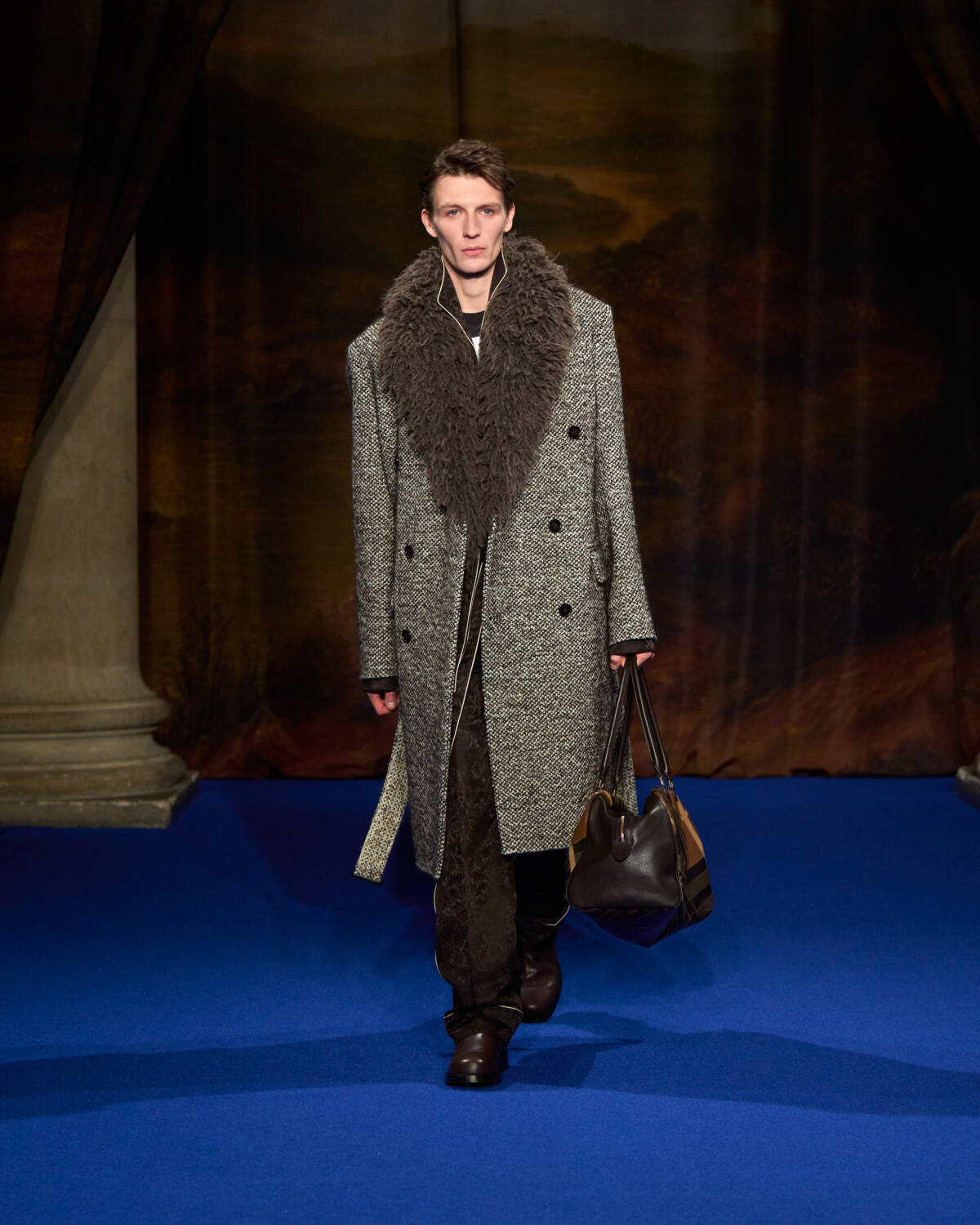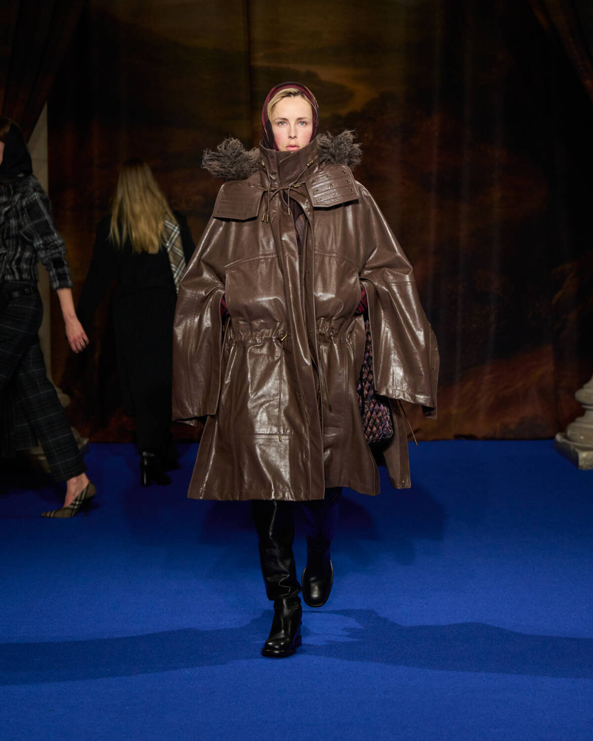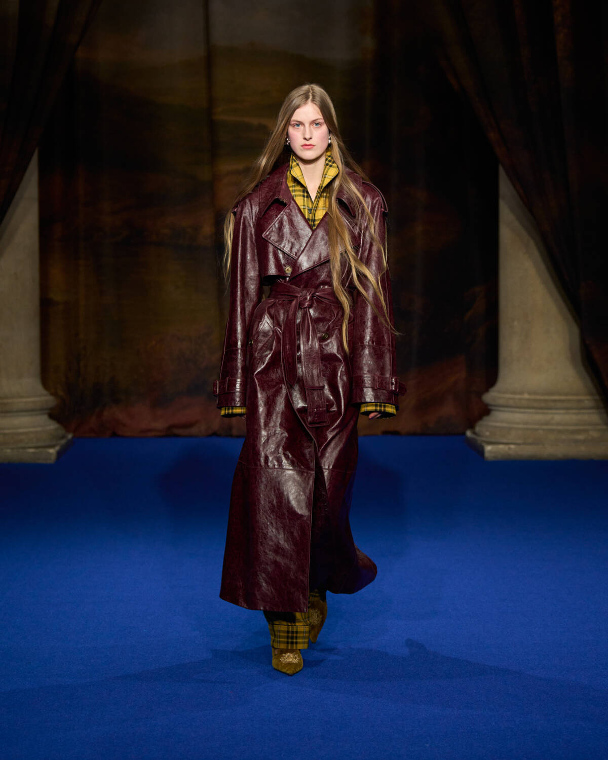 “I was struck by the craftsmanship and those lavish fabrics and swatches of hand-painted wallpapers and of all the furnishing fabrics, handmade carpets and sumptuous, somewhat faded tapestry,” said the designer who added plenty of crafty flourishes of his own, from the cape backed, leather mini trenches with hand-tooled decoration, to Burberry check rendered in patchwork shearling for capes.
