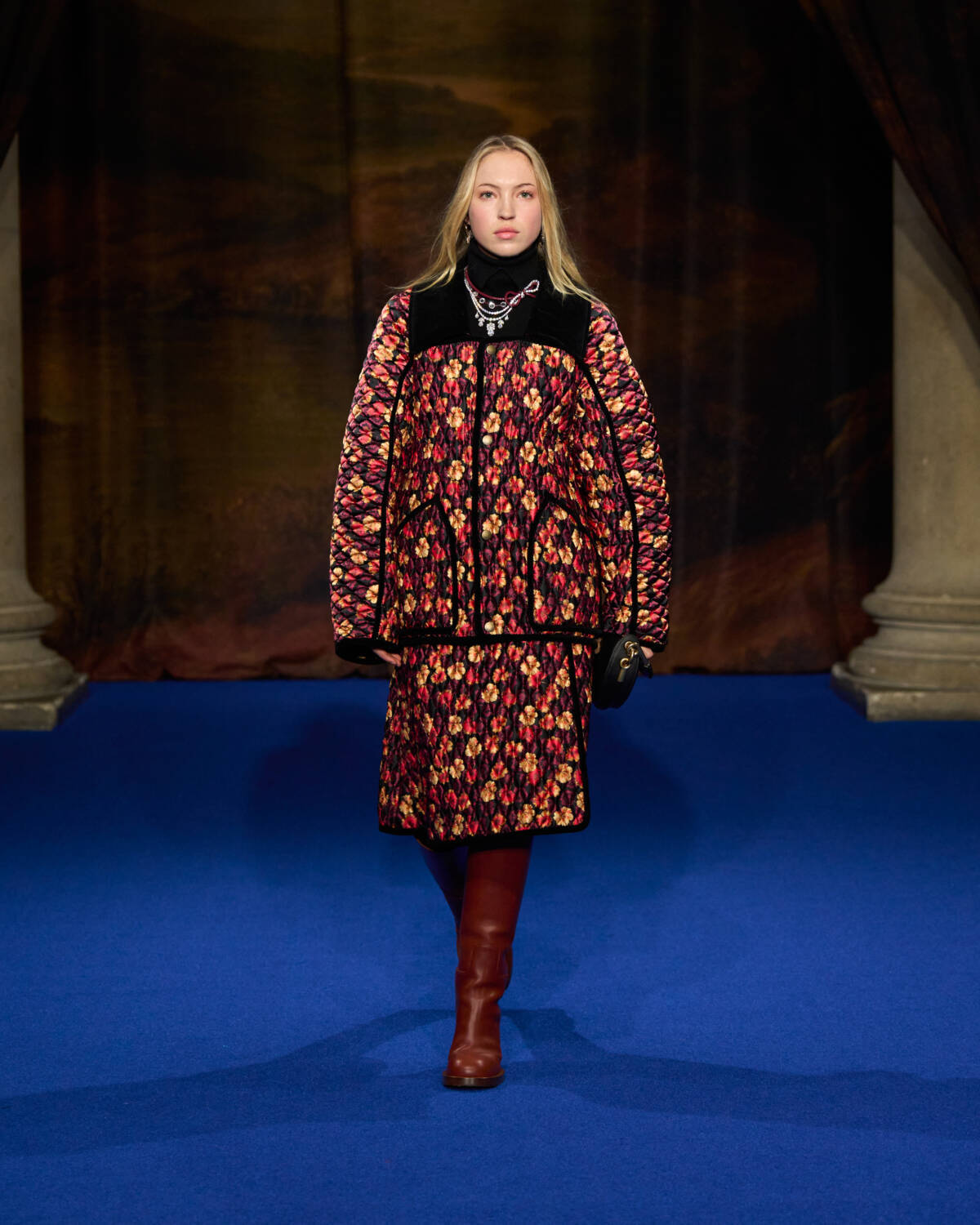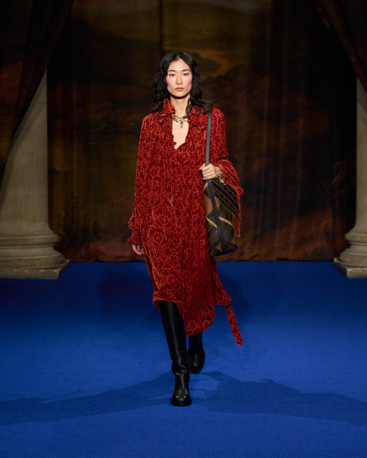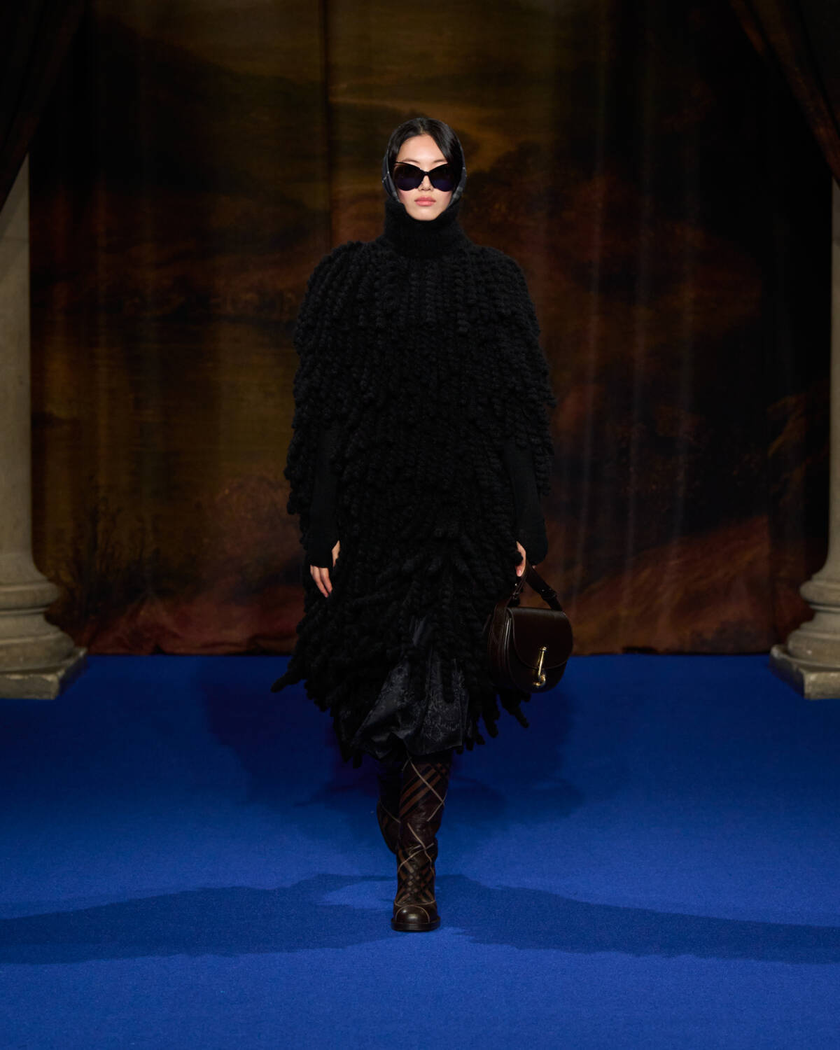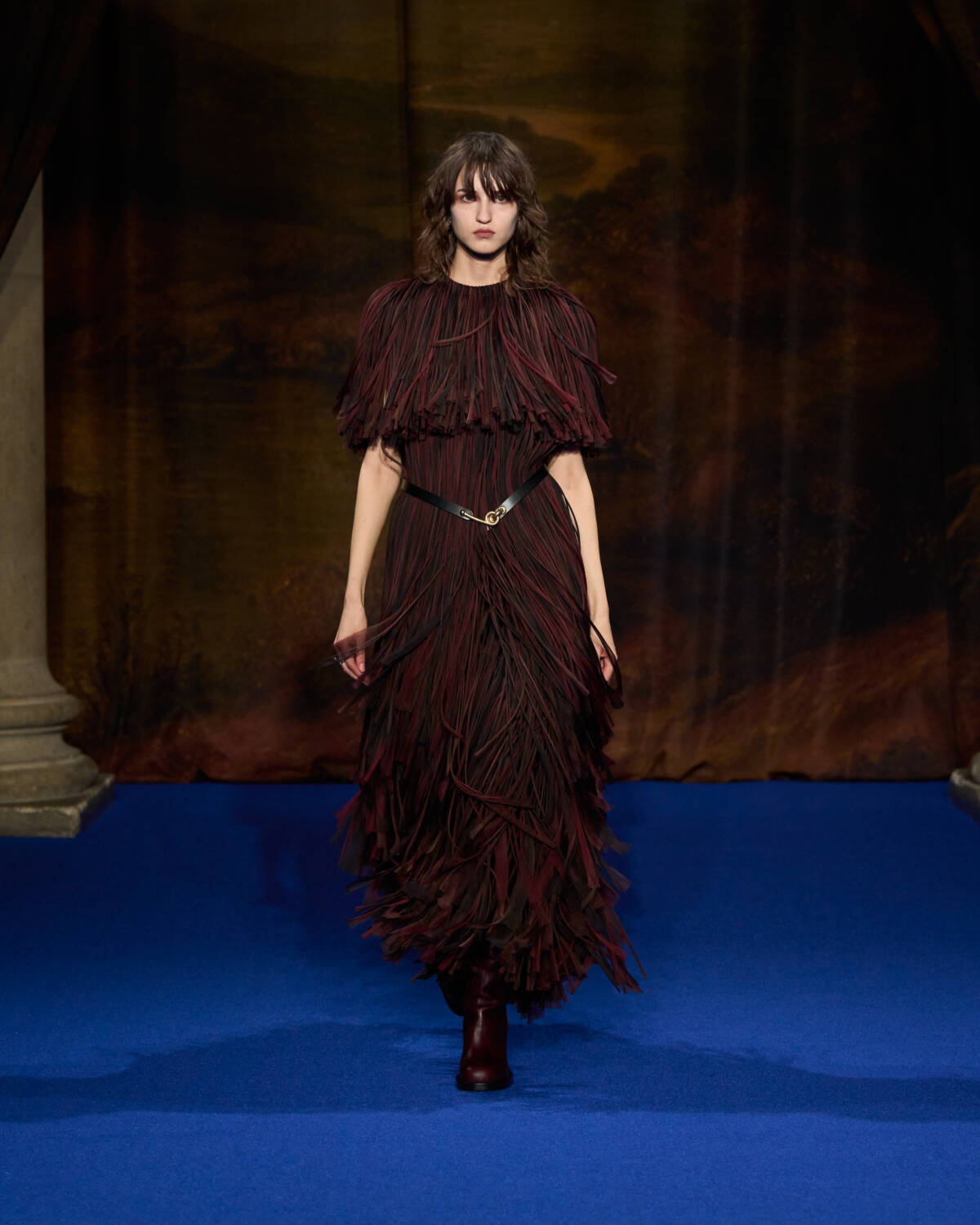 “I was struck by the craftsmanship and those lavish fabrics and swatches of hand-painted wallpapers and of all the furnishing fabrics, handmade carpets and sumptuous, somewhat faded tapestry,” said the designer who added plenty of crafty flourishes of his own, from the cape backed, leather mini trenches with hand-tooled decoration, to Burberry check rendered in patchwork shearling for capes.