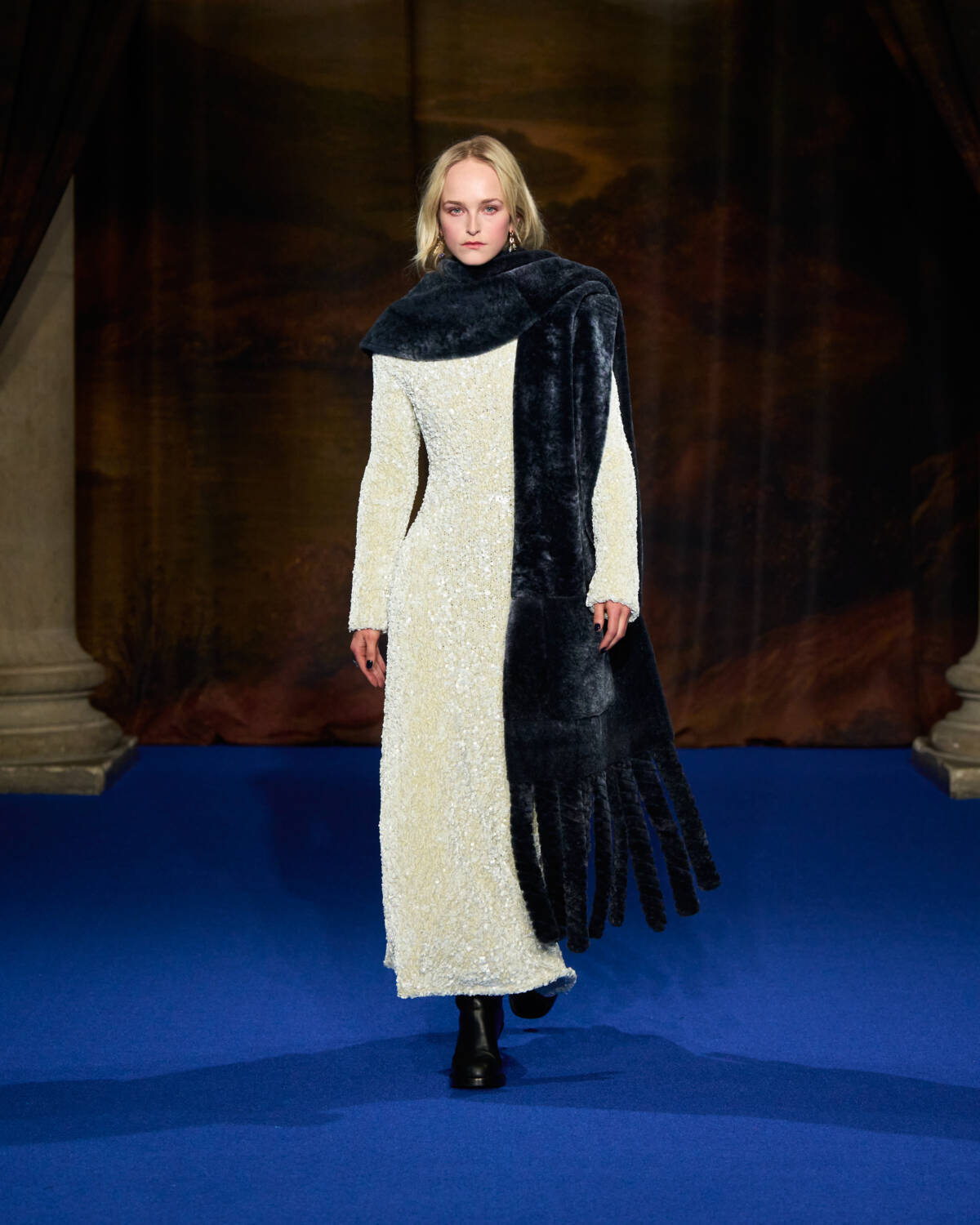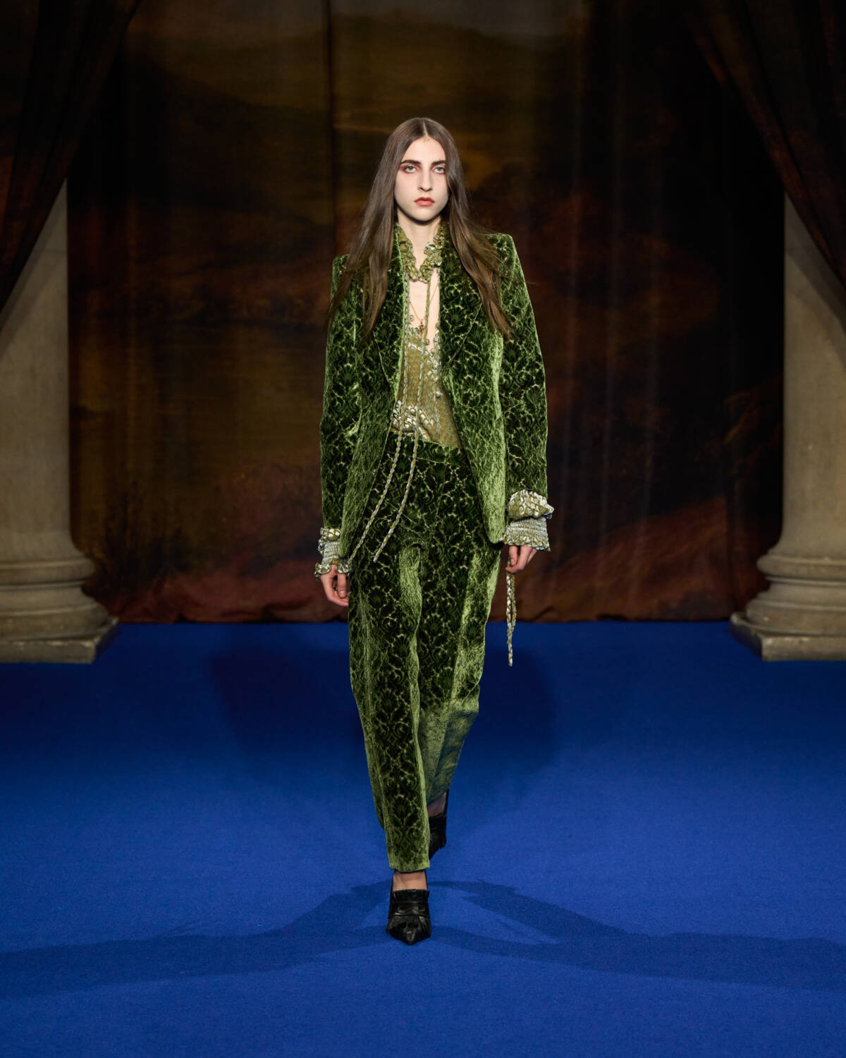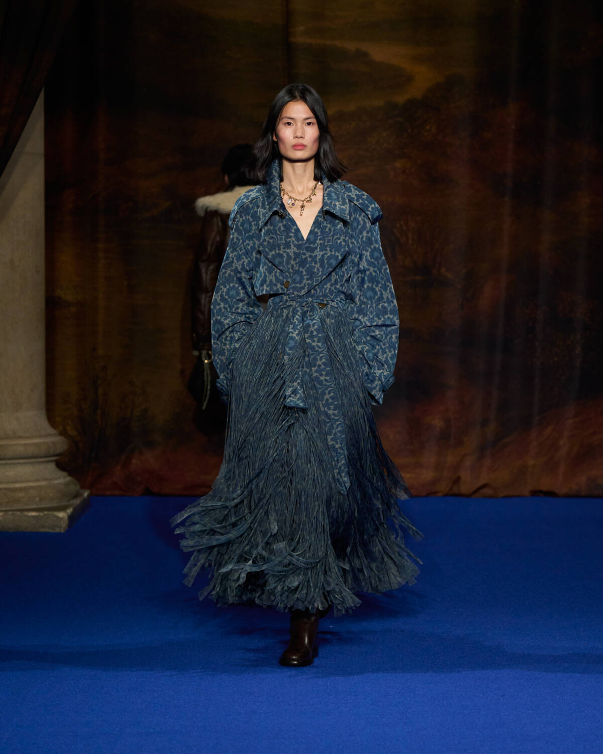 Coats (finally) played a starring role, inspired by the designer’s wintry walks in his native Yorkshire, where the brand also has a tench coat factory. Excellent great coats, leather trenches, dressing gown coats, shaggy little shearlings, billowing parkas and quilted jackets all came in earthy shades of brown, burgundy and green. They were worn with punkish tartan trousers, with kilts buckled to the front, silk pyjamas, ribbed knit co-ords or jodhpurs and thigh high riding boots. “We folded country house interiors into contemporary dress codes; and fused weather-shielding fabrics with elaborate wall-hangings,” said Lee who transposed flocked wallpaper and furniture fabric onto his ready-to-wear. Old chesterfields were the inspiration for weathered leather trenches in autumnal shades, smock dresses and suiting came in vivid flocked velvet whilst the heavily fringed trench coats (one worn by Naomi Campbell) were inspired by curtain tassels.