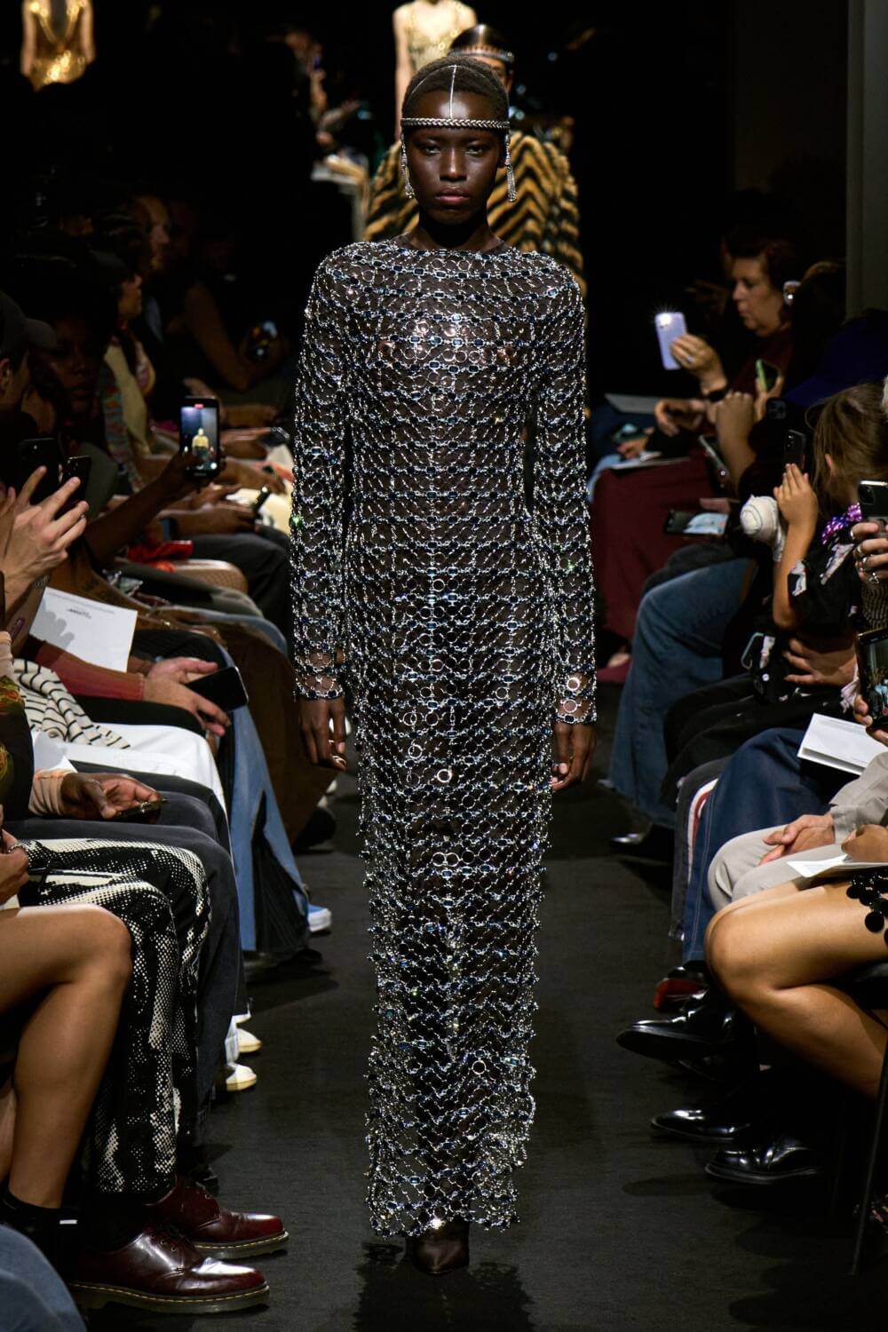 Over at Rabanne’s SS23 showcase, Julien Dossena preferred a day to ‘knight’ look, mining mediaeval cataphract dress for its space-age potential and in turn morphing metal mesh with sanguine latex to create glittering gowns akin to armour. Babushka-style headscarves were studded with metal grommets and draped over the sequin sheathed scale armour garb in a kind of new-age Rococo way.