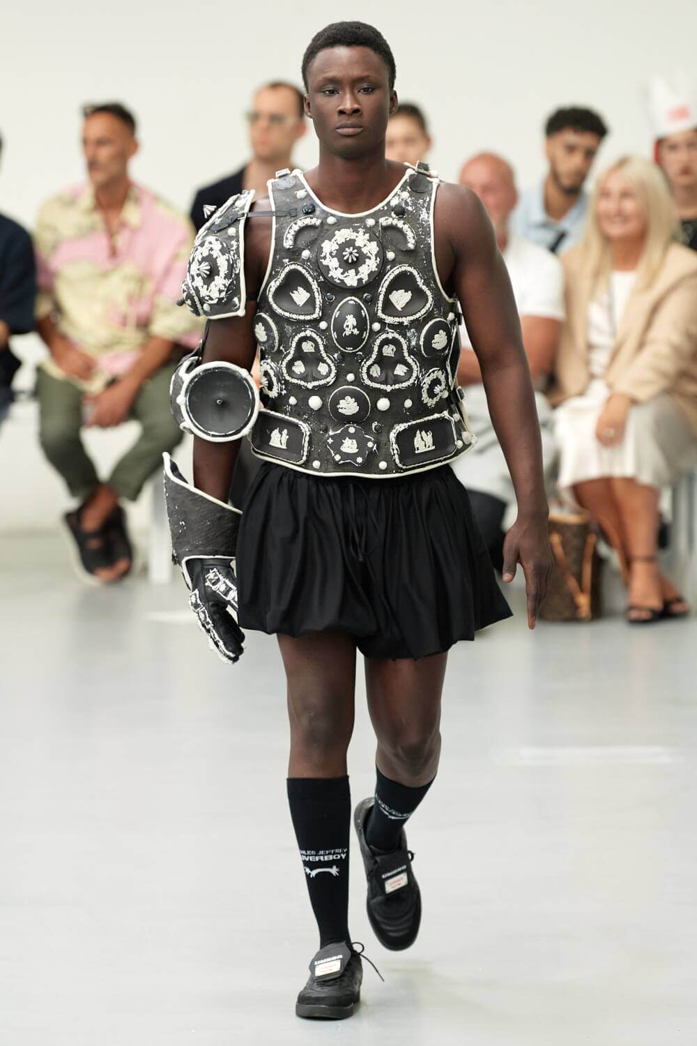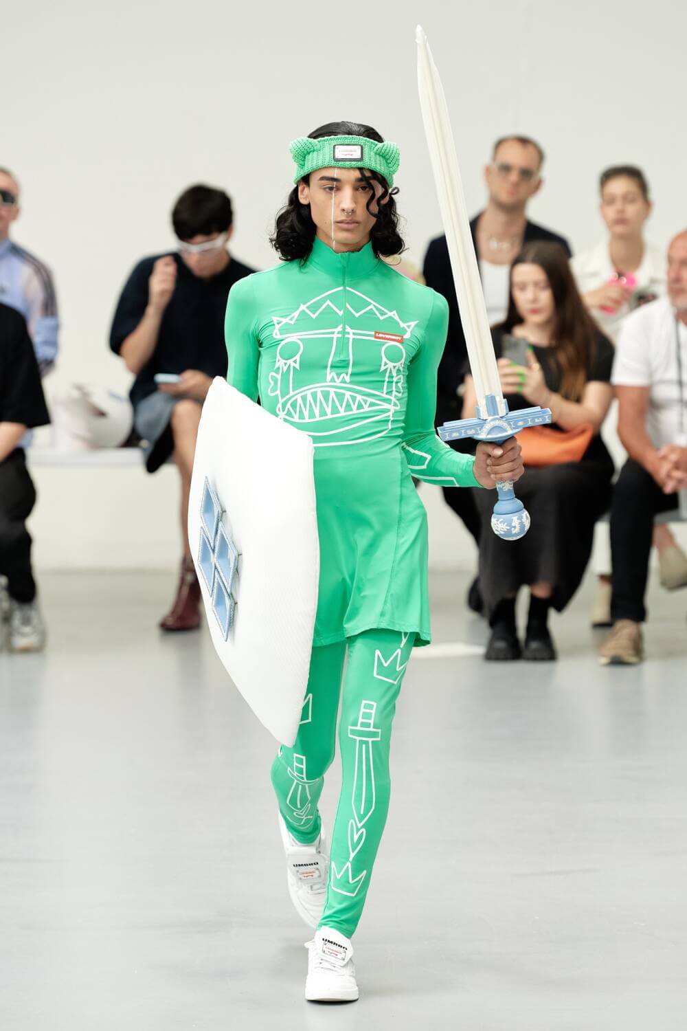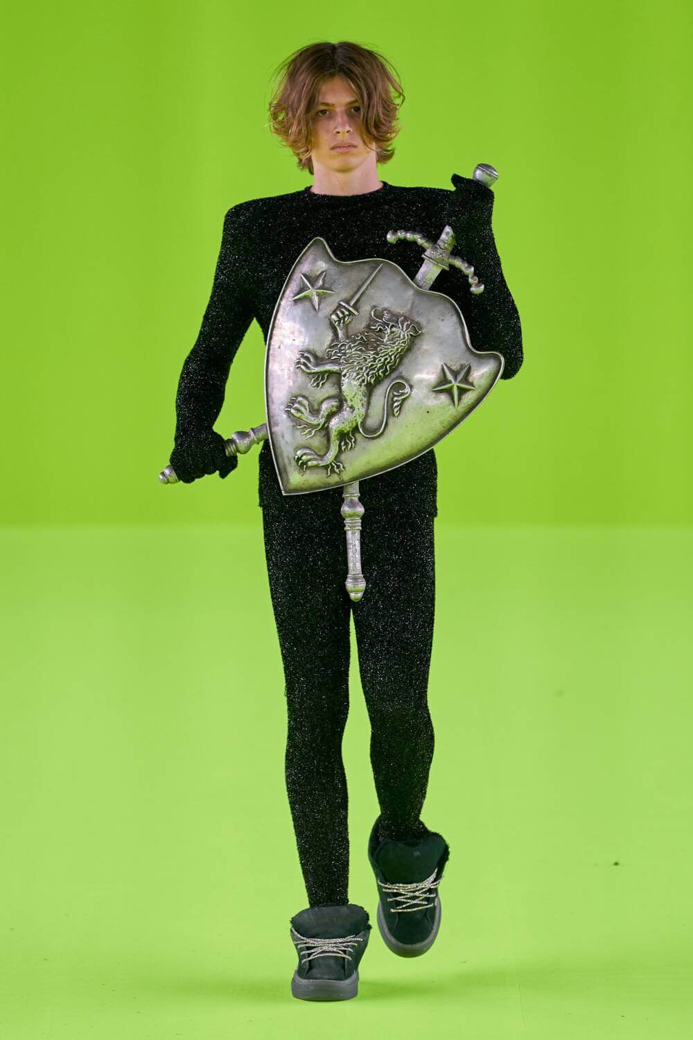 Inspired by the styles of 17th-century soldiers of the Swedish army during the reigns of Kings Charles XI and Charles XII of Sweden, 1680 specifically, Charles Jeffrey Loverboy’s SS24 menswear collection reimagined modern UK citizens, under the reign of King Charles III, as new Caroleans themselves. The Scottsman reimagine what the new King’s coronation might have looked like in a more Elysian parallel, “in which everyone gets to wear a crown”, combining traditional garb worn by Caroleans during the Restoration of 1660 with high-tech sportswear and warped graphics. The modern militia sported green garments adorned by graphic swords, crowns and hearts, with of course, a trusty sword and shield in hand. Other knights wore decorative armoured breastplates and sturdy gauntlets sculpted from upcycled Wedgwood jasperware. The battle continued with Jeffrey’s knights meeting their match with a ferocious lion-like look. Peering out from behind the fangs of a full dragon mask, the model held a vicious expression. His look was complemented by lion claw boots and gauntlets.