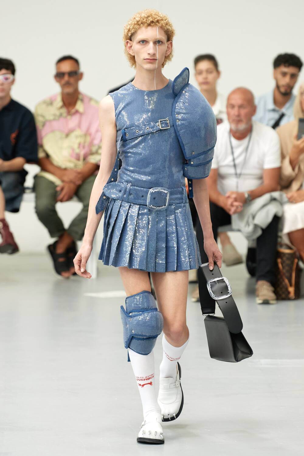 Take it from Eli Russel Linnetz’ ERL, whose SS24 show at Pitti Uomo manifested metallic armour in the most literal way. A model sauntered down the runway in a sparkling jet black set, sword and shield in hand. Titled Make Believe, the collection would have fit like a jigsaw puzzle into a period piece – perhaps this was a nod to Linnetz’ cinematic background – all the sharp shoulders, silver sequin trousers and munitions considered.