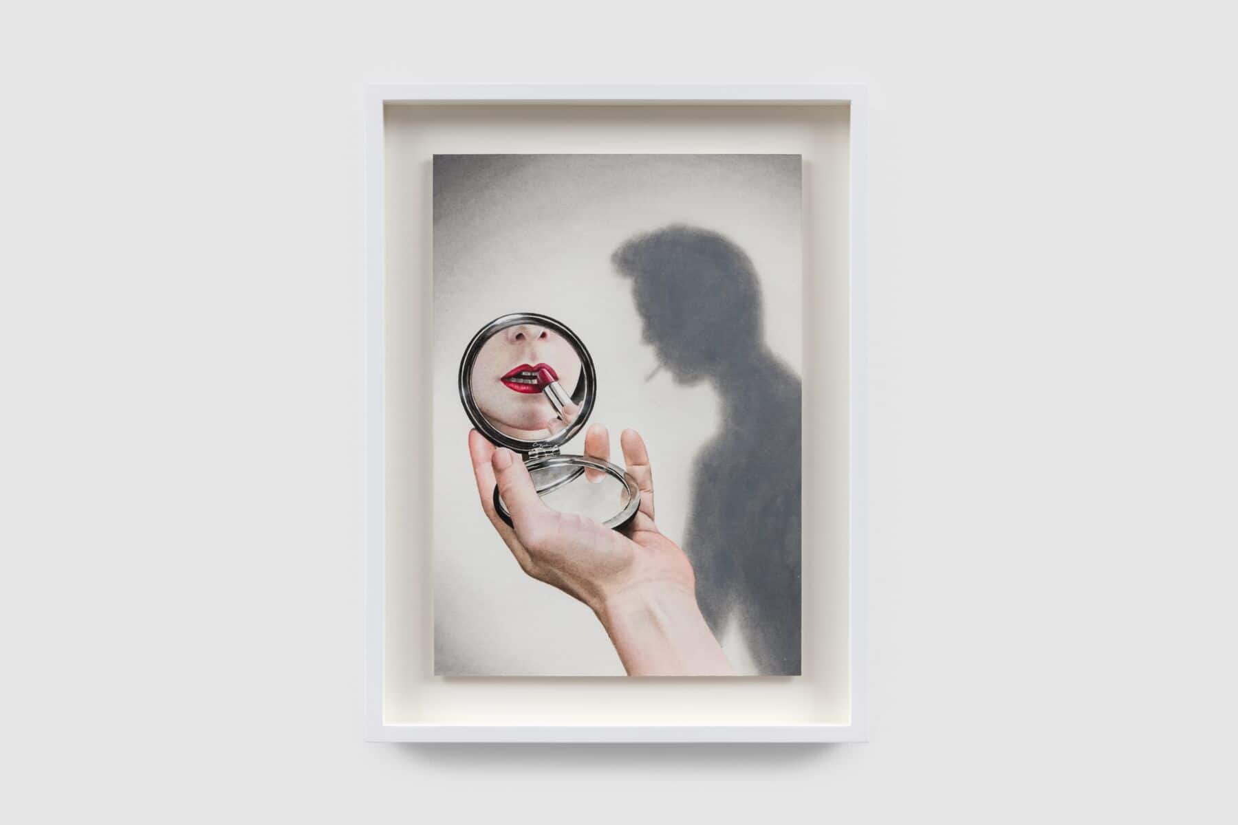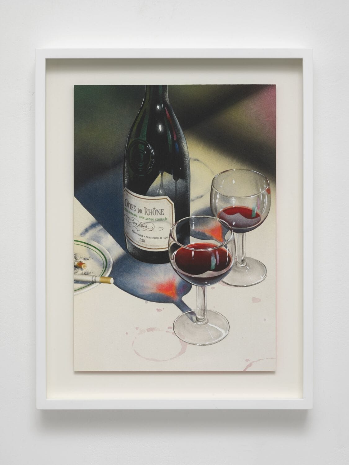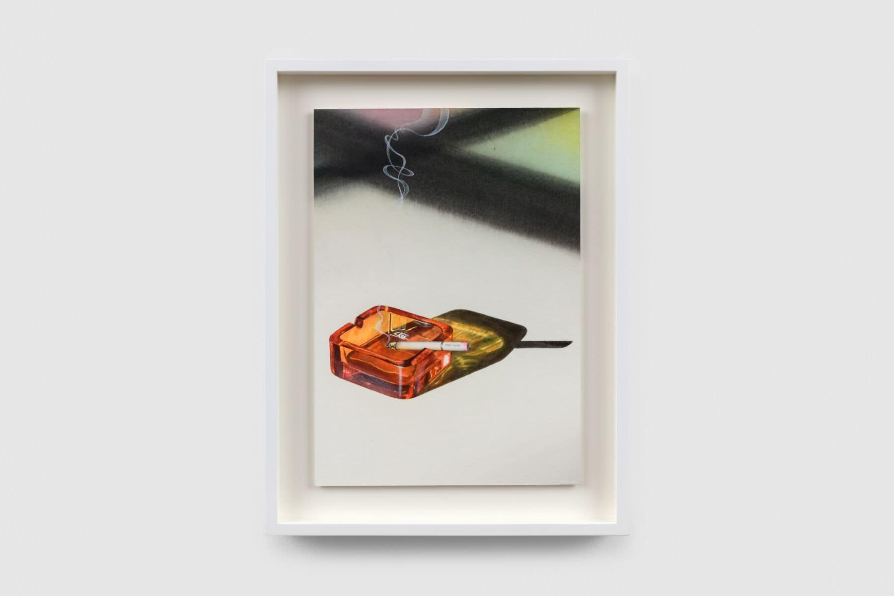 Everyday objects take centre stage beneath dimly lit skies and shadowed backdrops: toothbrushes angled in private choreography, a lipstick-stained cigarette kissed warm with implication. The works are intimate, cinematic and deliberately restrained. Where earlier drawings leaned into parody and hyper-sexualised humour, this new series trades the punchline for tenderness, painting some of Kwok’s most romantic works to date.