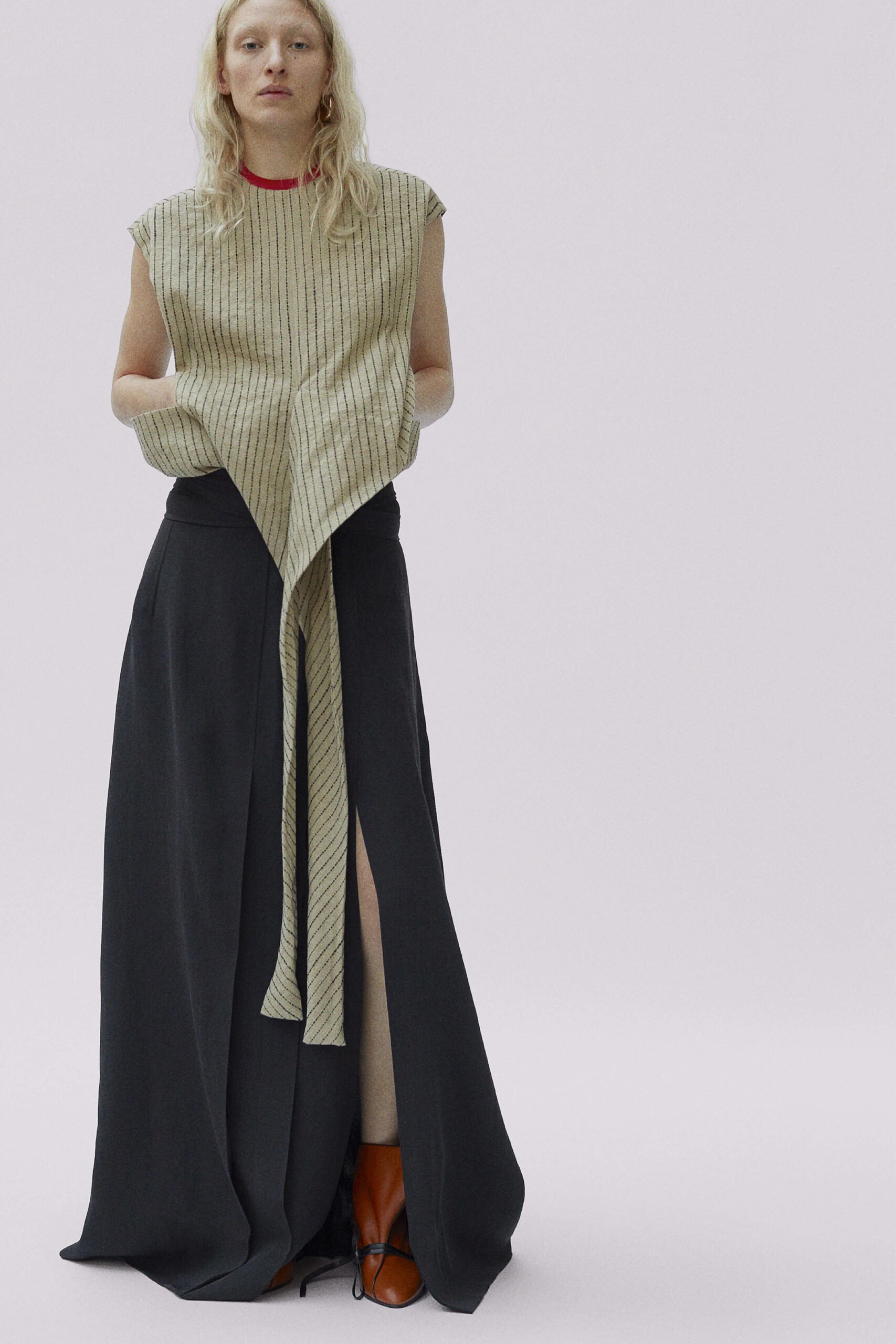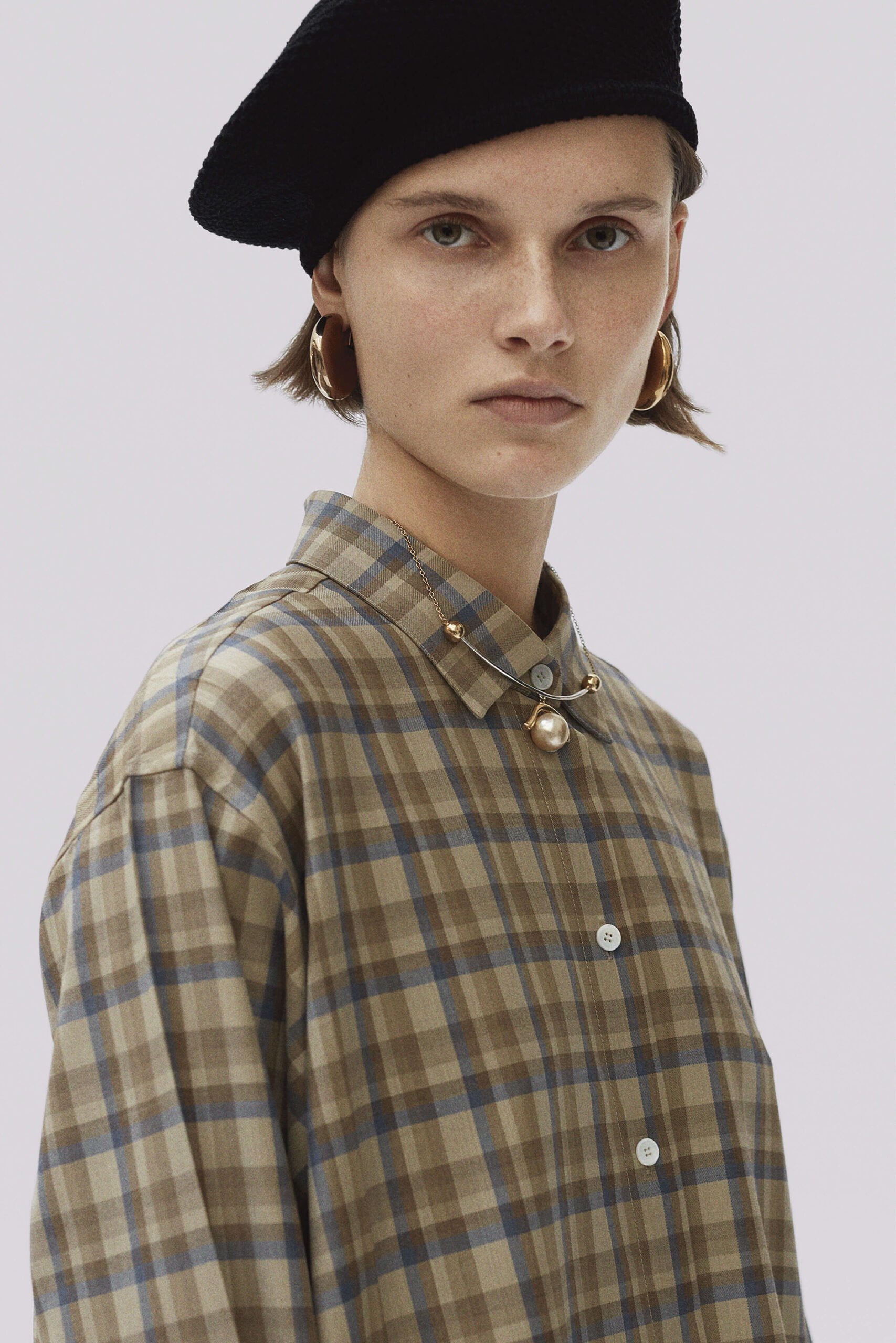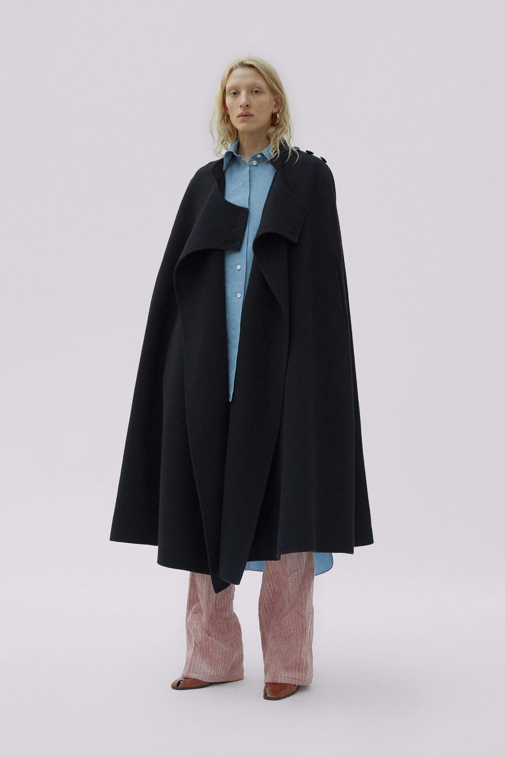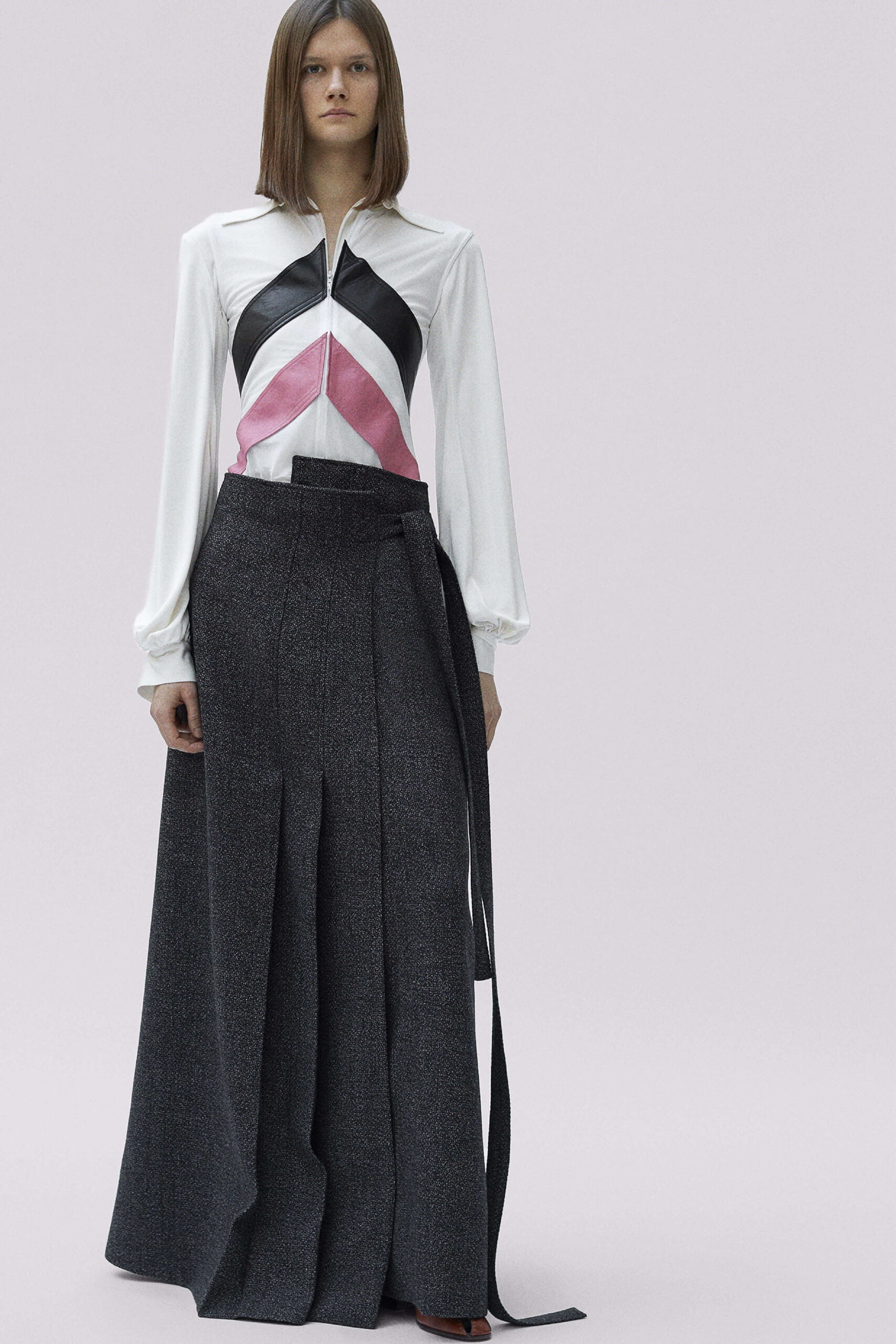 I often say that the two qualifications for enjoying Phoebe Philo’s work at the house of Céline are 1) being a woman and 2) having a pulse. However, I would like to add that, certainly amongst Ten Towers at least, there are a number of fashionistos (that’s the boy version) who also are partial to Ms Philo’s clothing and, as I plan to be buried in full-look Céline, who needs a pulse either? It’s really easy to wax lyrical about a Céline collection, mainly because they are always very very good, but on receipt of these images last week (embargoed until today) I must say that we’re extra partial to this latest offering – Philo’s Fall 2017 (a Céline-ism for Pre-Fall) collection for the house. There’s something hearty about this. A kilt says hearty, especially when it’s floor-length, and there are six of them here, pointing to this fullness of fabric throughout – heavy mannish overcoats or roomy shirts, some checkered, or those trousers that rise up far beyond the waist and fasten with an extra-long fly. But Philo’s vision at Céline has long taken the hard with the soft and here, that heaviness is offset with a strong femininity, a sense of womanliness. It’s found in the way that ties of silk loosely cinch the waist and fabrics gently drape on the body, subtly pointing to the female form beneath or in those flashes of red, on the clothes and slashed across the model’s lips. Because yes, Céline may be intellectual but that doesn’t mean it’s sexless – there’s a fluidity to it, a languid sensuality. Philo really does know how women woman to dress – design without agenda or suggestion – just beautiful, intelligent clothes.