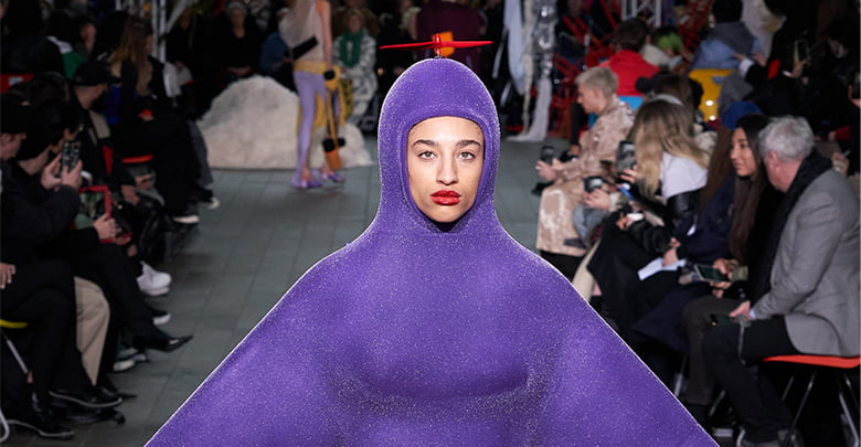 Elsewhere, James Walsh turned miscellaneous objects into crampy fashions, be it an aeroplane mini dress with an automatic propeller or a chihuahua toy baguette bag, and Charlie Constantinou made puffer fabric look like melting lava. The elevated men’s staples of Aaron Esh looked instantly shoppable, walking alongside the torn-up party garb of Shakila Thebe and the queered couture of Joe Pearson’s boys, with elegant bundles of fabric covering his models’ bits and bobs in all the right places.