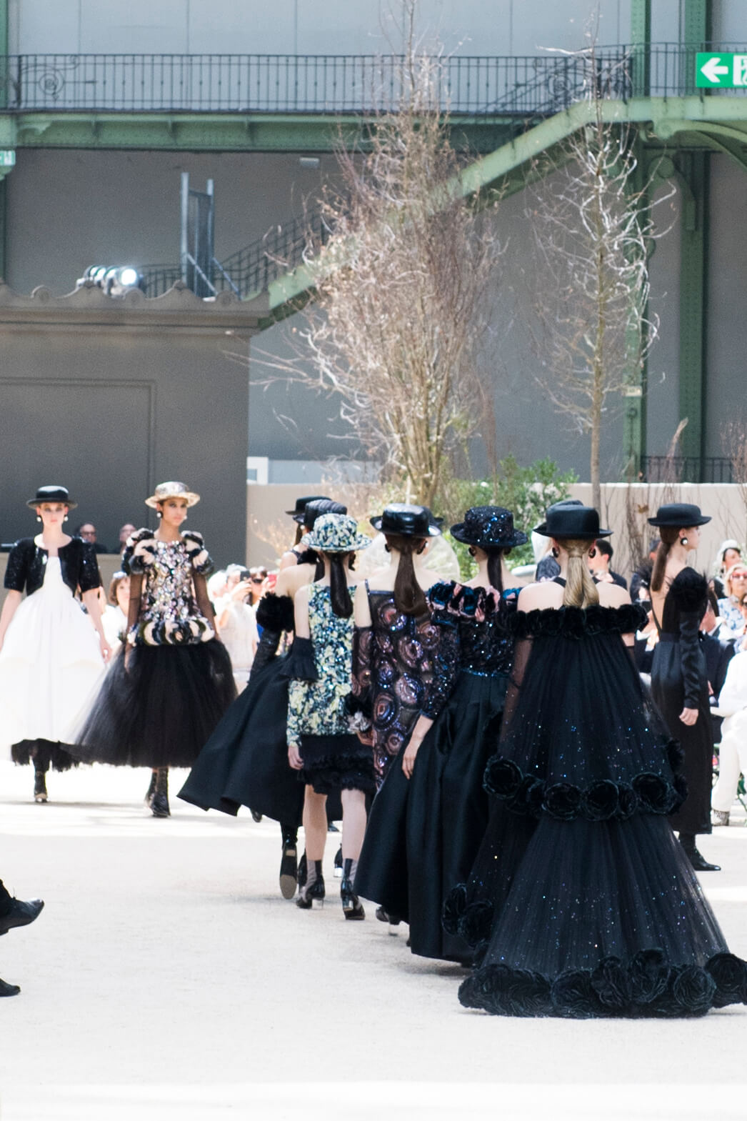 Bows and rolls of fabric at the arms and waist added to that sense of excess – the generosity of couture in fabric and detail. And there was something amplified about it, a feeling that ran throughout – all the way to the frocks – embellished column gowns, which played on his last couture offering, this time alongside incredible layered baby-doll gowns, generously proportioned but light as air, or dresses that flared at the hemline, 1950s-style. We aways finish here with a bride – her gown also baby doll in shape, finished with twirls of tulle that almost floated above the ground. Nobody quite does couture like Karl Lagerfeld – clothing for the most wealthy and fabulously dressed women – and for the rest of us to just look on in awe.