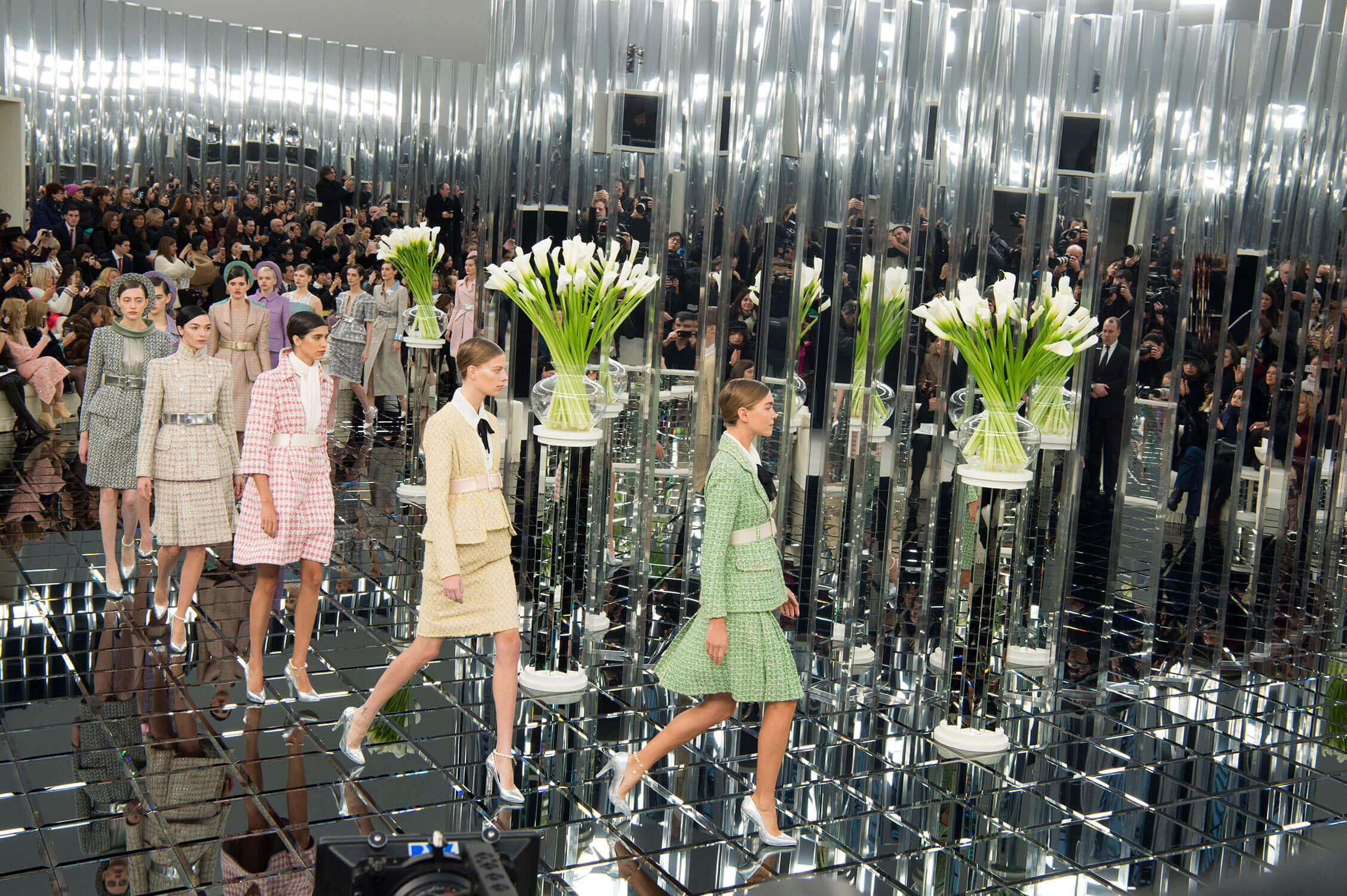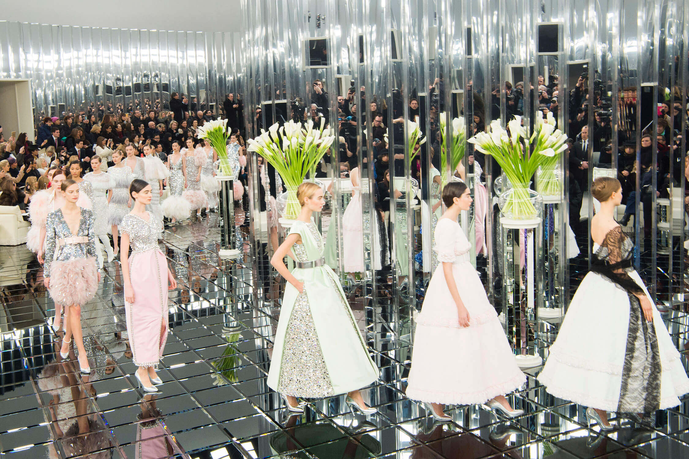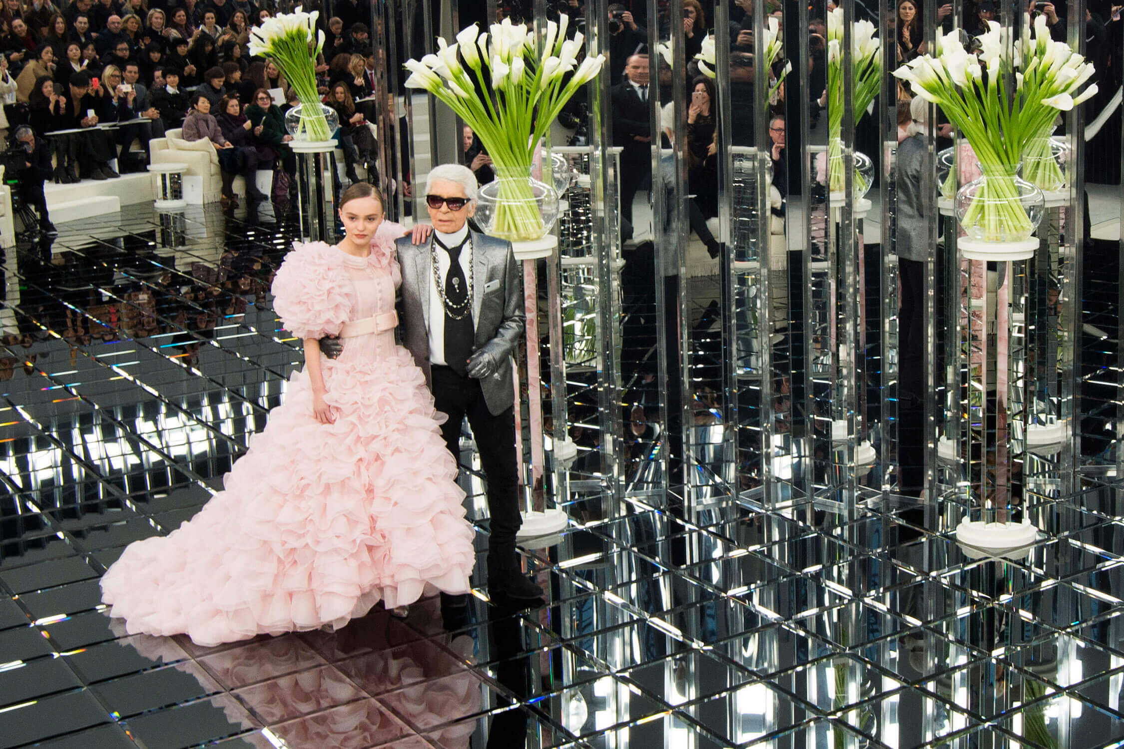 Today’s Chanel Haute Couture show took place in what one could rightly describe as a very fancy front room. However, since we are in Paris, and this is Haute Couture, we shall call it a salon. Which naturally meant op-u-lence – white couches for the FROW, plinths with vases of calla lilies atop and, as you might have already seen, a shiny, shiny mirrored floor and walls, echoing the spiral staircase in Coco Chanel’s legendary Rue Cambon apartment. A setting which made it, once again, the most photo-opped fash moment since, well, the last Chanel show. I mean, put a crowd of fashion people in a room full of mirrors and we’ll be amused for hours. This shininess wove through the collection (everybody knows that a lady should always match her outfit to the floor), Karl providing a lesson in shimmering eleganza – the Chanel tweed two-set, here cinched with a silver belt and sequinned at the collar and cuffs, a fully-embellished metallic pant suit, glittering knee-high boots. The colour palette? Let’s call it sugared almond – pale pistachio, blush pink, silver. There were gowns to ooh-and-ahh at too, of course, which had a sort of art deco-feel – dresses that at the hem and sleeves fell away into large puffs of feathers, the same 1920s-tinge also felt in elegant, softly-draped column dresses. From there, a movement towards a fifties-style, A-line silhouette – pouffy, fantasy creations that look set to adorn the bodies of many a young starlet this Oscar season. And talking of them (young starlets, that is) it was Chanel poster-girl Lily Rose-Depp who was this season’s bride, looking just lovely in an breathtaking blush pink ruffled number. A dress so good it looked edible. Another breathtaking show from the grand master of Haute Couture – showing once again that Mr Lagerfeld’s infinite imagination knows no bounds.