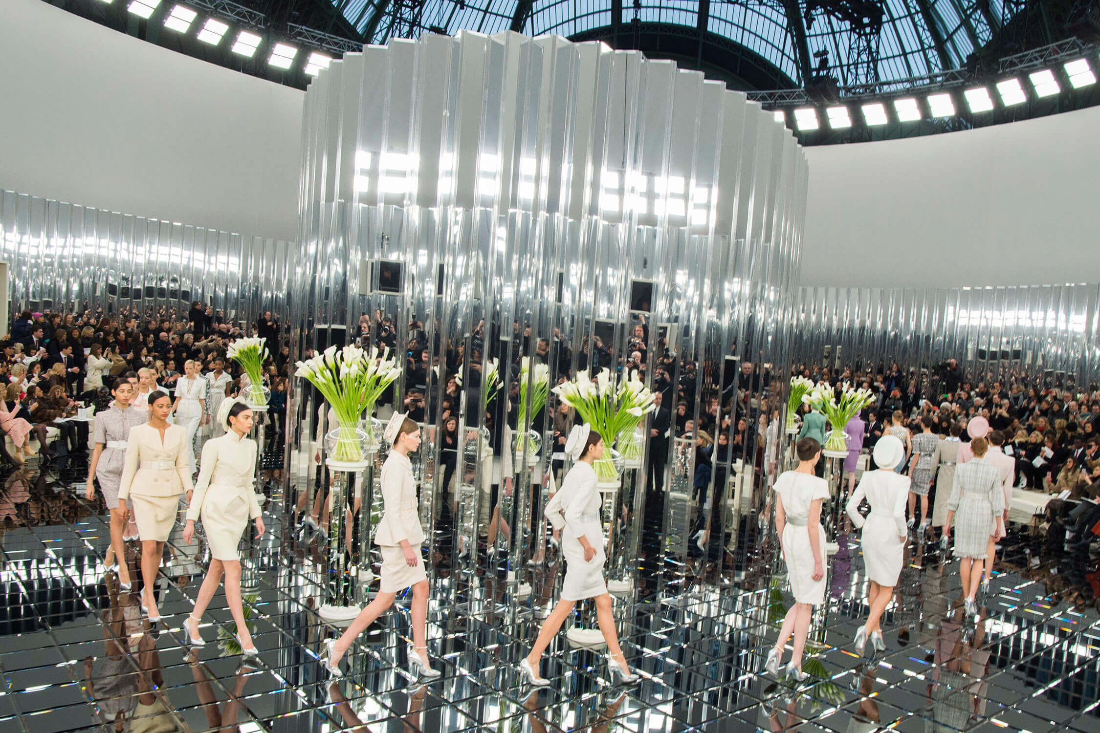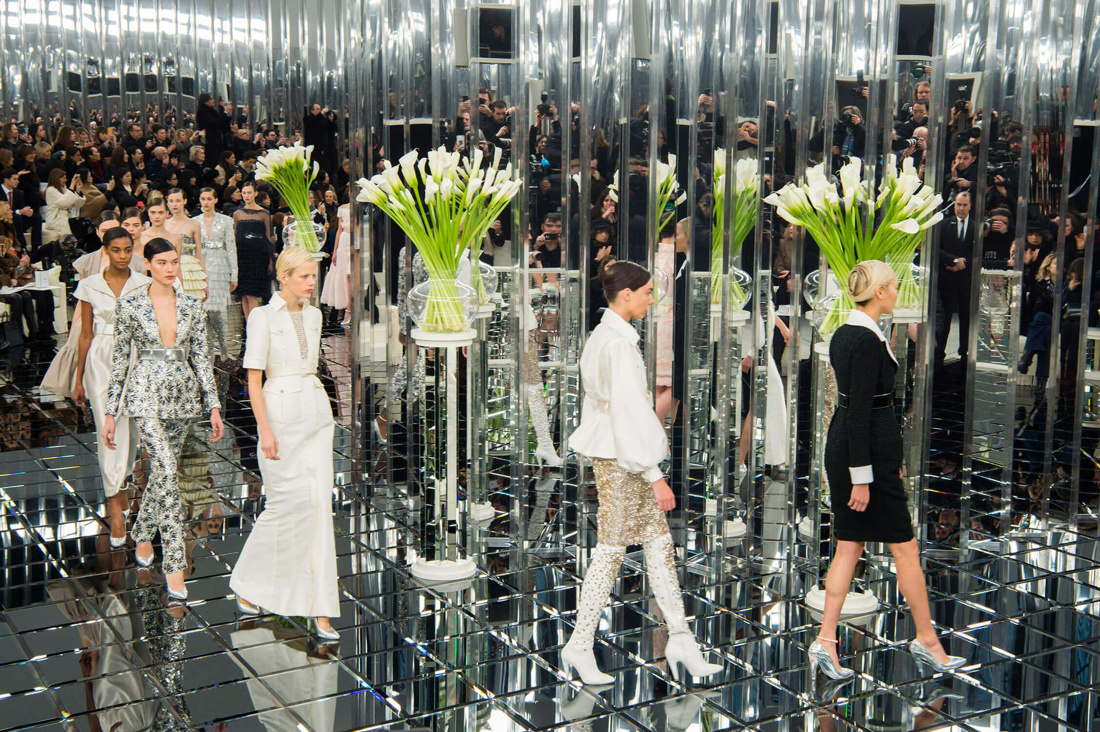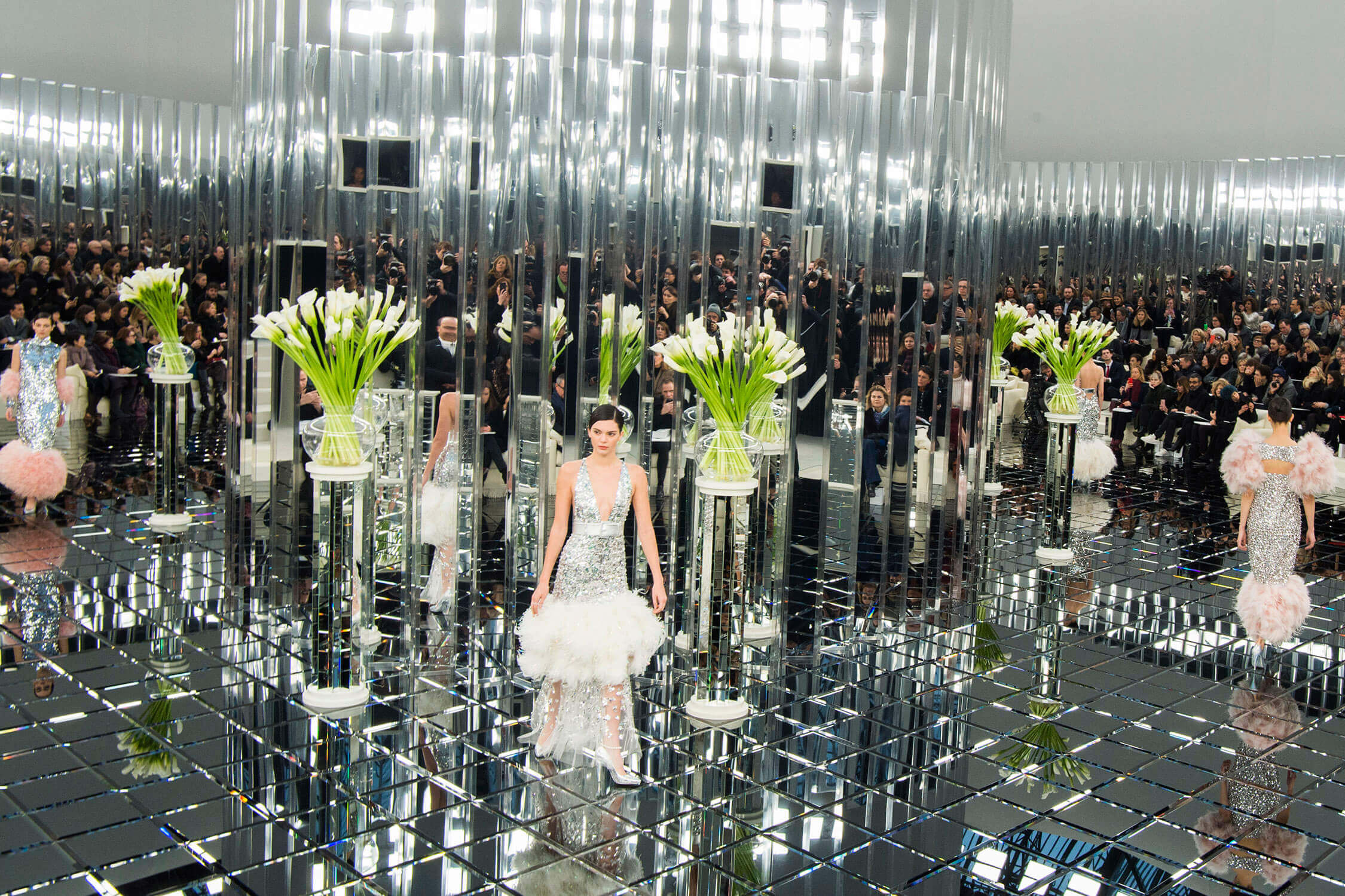 Today’s Chanel Haute Couture show took place in what one could rightly describe as a very fancy front room. However, since we are in Paris, and this is Haute Couture, we shall call it a salon. Which naturally meant op-u-lence – white couches for the FROW, plinths with vases of calla lilies atop and, as you might have already seen, a shiny, shiny mirrored floor and walls, echoing the spiral staircase in Coco Chanel’s legendary Rue Cambon apartment. A setting which made it, once again, the most photo-opped fash moment since, well, the last Chanel show. I mean, put a crowd of fashion people in a room full of mirrors and we’ll be amused for hours. This shininess wove through the collection (everybody knows that a lady should always match her outfit to the floor), Karl providing a lesson in shimmering eleganza – the Chanel tweed two-set, here cinched with a silver belt and sequinned at the collar and cuffs, a fully-embellished metallic pant suit, glittering knee-high boots. The colour palette? Let’s call it sugared almond – pale pistachio, blush pink, silver. There were gowns to ooh-and-ahh at too, of course, which had a sort of art deco-feel – dresses that at the hem and sleeves fell away into large puffs of feathers, the same 1920s-tinge also felt in elegant, softly-draped column dresses. From there, a movement towards a fifties-style, A-line silhouette – pouffy, fantasy creations that look set to adorn the bodies of many a young starlet this Oscar season. And talking of them (young starlets, that is) it was Chanel poster-girl Lily Rose-Depp who was this season’s bride, looking just lovely in an breathtaking blush pink ruffled number. A dress so good it looked edible. Another breathtaking show from the grand master of Haute Couture – showing once again that Mr Lagerfeld’s infinite imagination knows no bounds.