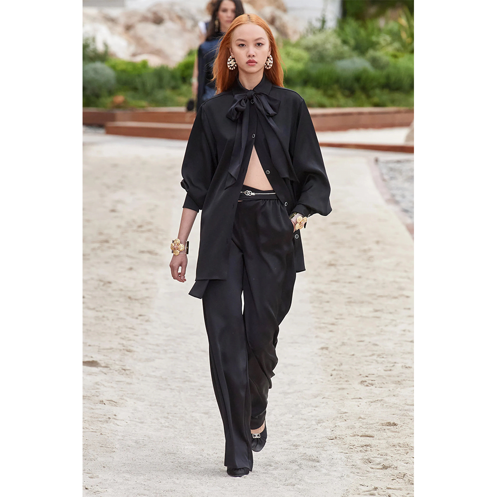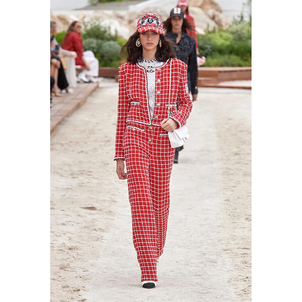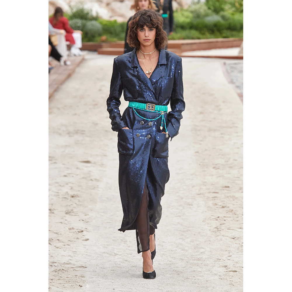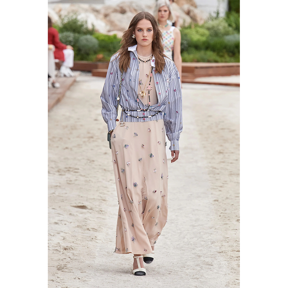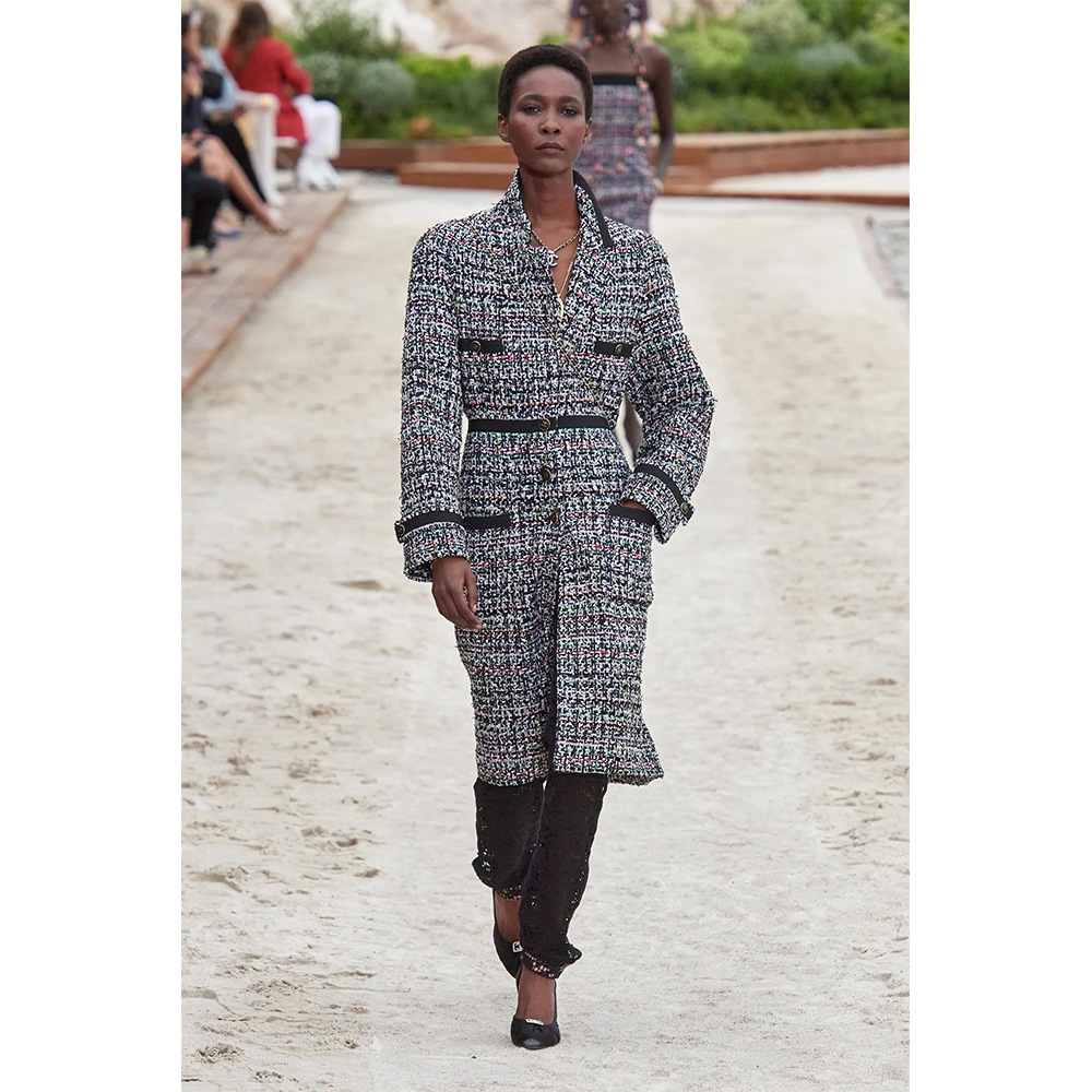 Viard also paid homage to the glamour of Monaco’s royals, particularly Caroline and her daughter Charlotte who have a close relationship with the house. “The first time I saw Caroline was on the beach in Monaco. She was wearing a draped black dress, very thin tights and heels,” recalled Viard, who paid tribute to the rebellious royal with abbreviated cocktail looks worn with tights. She even sent out models wearing sheer black tights and swimsuits – a reference to Helmut Newton’s racy Monaco aesthetic. This is a place where high glamour and high rollers are baked in the DNA, but it also has that breezy, riviera sense of ease, which is extra appealing in these anxious times. Viard’s Chanel girls know the score. Nonchalance 5, nerves nil.