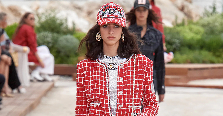 Her collection paid homage to Monegasque style, opening with models wearing racing driver onesies in the red and white of the principality’s flag. They came in glittering tweeds and sequins and were worn with No5 baseball caps adorned with the black and white checks of the finish-line flag. The sporty theme continued with tennis looks complete with covetable leather racquet holders and trainers, whilst a fruit machine chain bag winked at sport of a different nature – the principality’s casino culture.