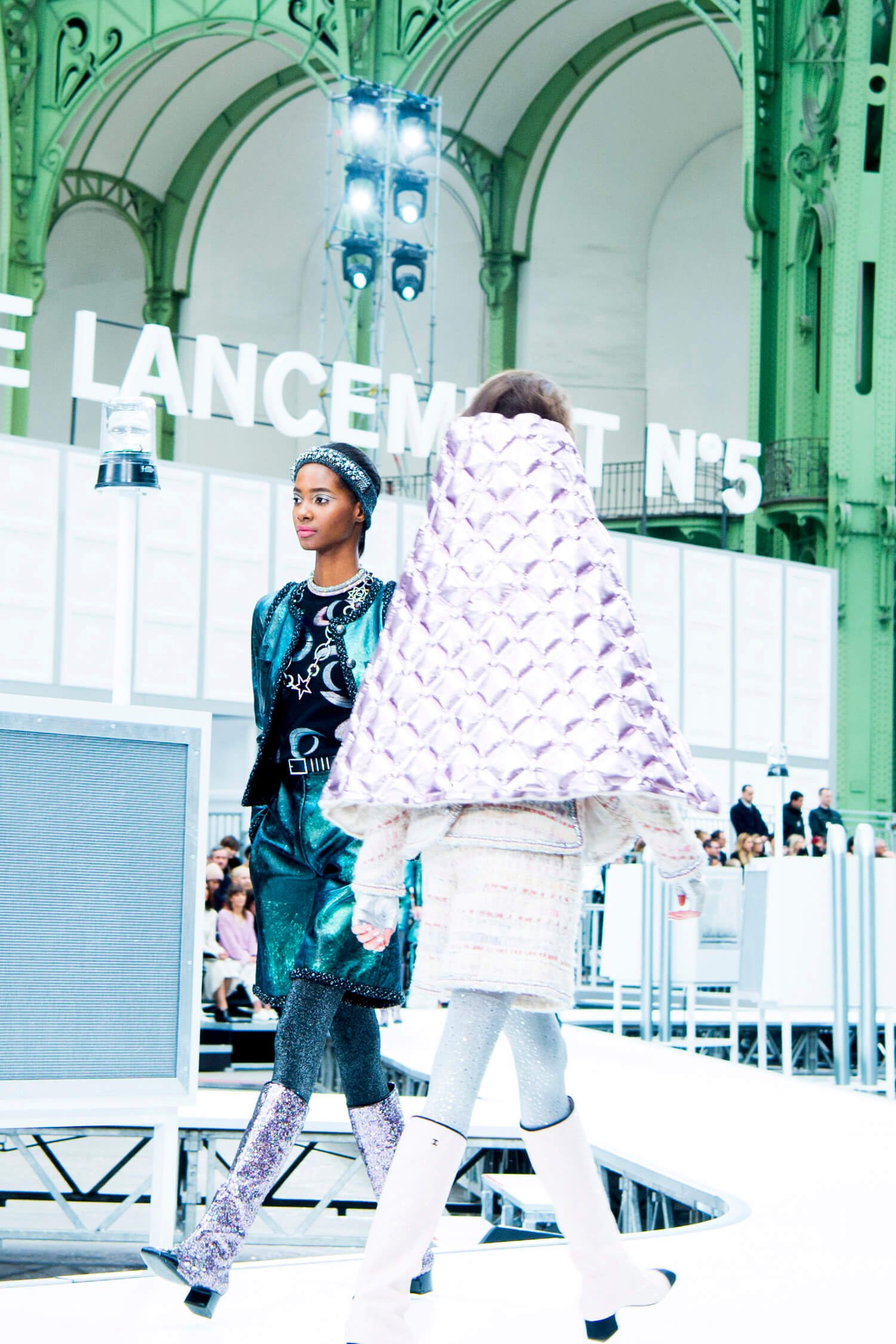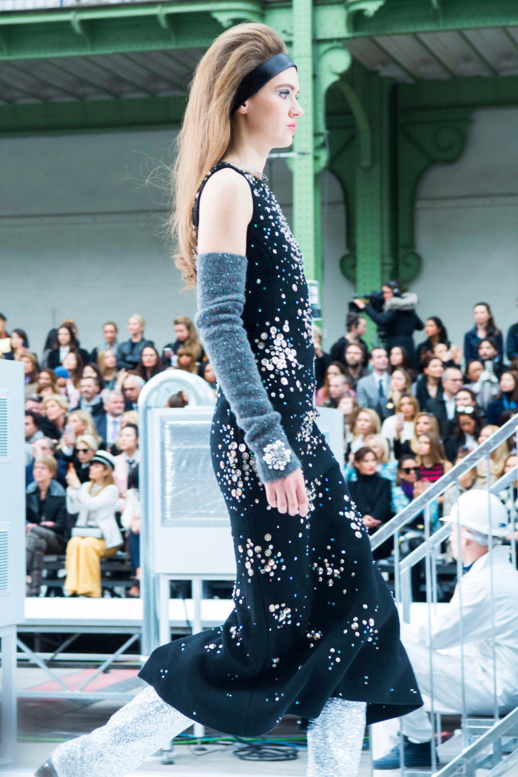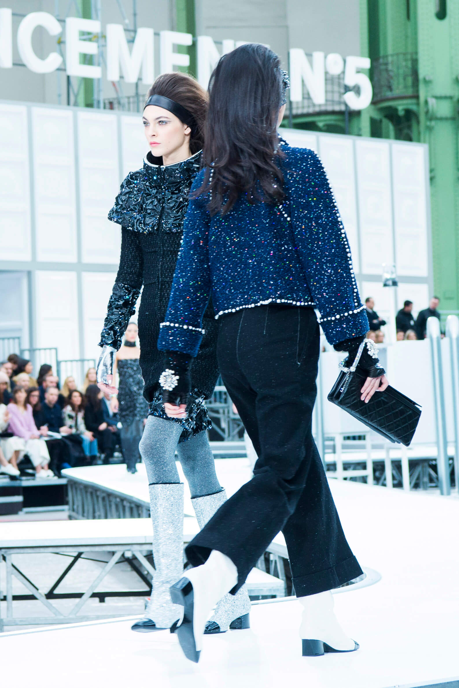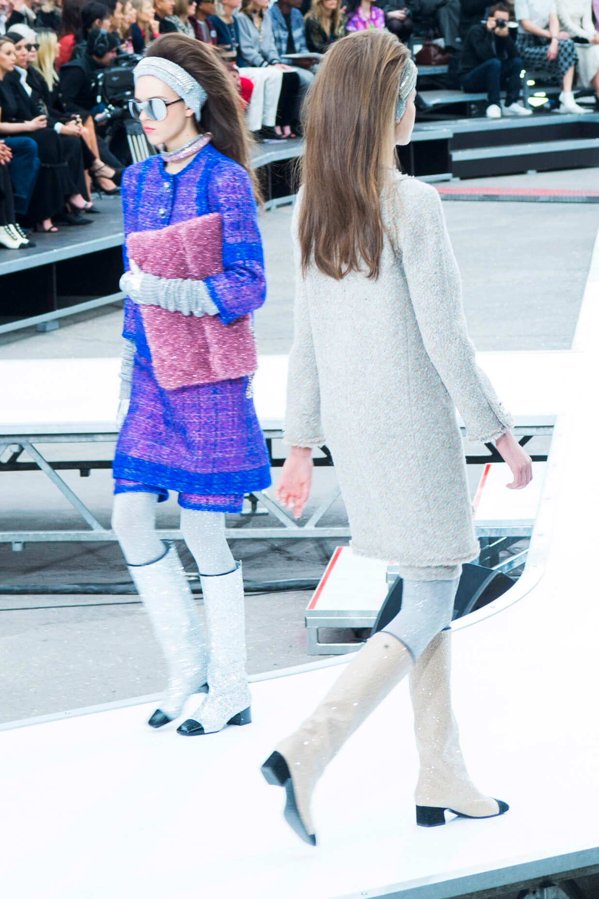 Cor, those Chanel girls don’t half get about do they? Under the sea, atop a polar ice cap, inside a super computer, down the supermarket… how do they get the holiday days? And now, they’re only going intergalactic. Well, a colossal rocket supplanted in the middle of the Grand Palais, as we found this morning, would suggest travel of the outer space variety. But where, exactly, are they going? The galaxy is a big place, you see. The moon? Through a wormhole to alter the space-time continuum? Or, perhaps, to communicate with alien life to stop them from blowing us to smithereens? Let’s assume the latter. Because what better ambassador to send than a beautiful lady clad entirely in Chanel? In Karl’s world such things as a space suit (pssh) are not necessary. No, these astronauts wear tweed, obviously – here, the Chanel two-set was refigured to include this high funnel neckline, a bit Trekkie, or made from this this soft, fluffy baby pink wool. Which looked quite warm. Because space is cold, presumably. Hence also those shiny blankets that sat around the models necks, like a puffy version of what you get after a marathon. And, on the subject of shiny – there was plenty of that, because what says space travel more than something shiny? – glittering tights tucked into equally glittering stargazer boots, shearling jackets shot through with panels of metallic fabric, crystal intergalactic-alien-queen headbands, giant silver backpacks. Oh, and on a more practical note, there were shorts, some of which that sat beneath matching tweed skirts – because in anti-gravity situations, no lady wishes to expose themselves, do they? At the end of the show, the rocket literally took off. Of course it did. Bravo Karl on another truly magical Chanel experience!