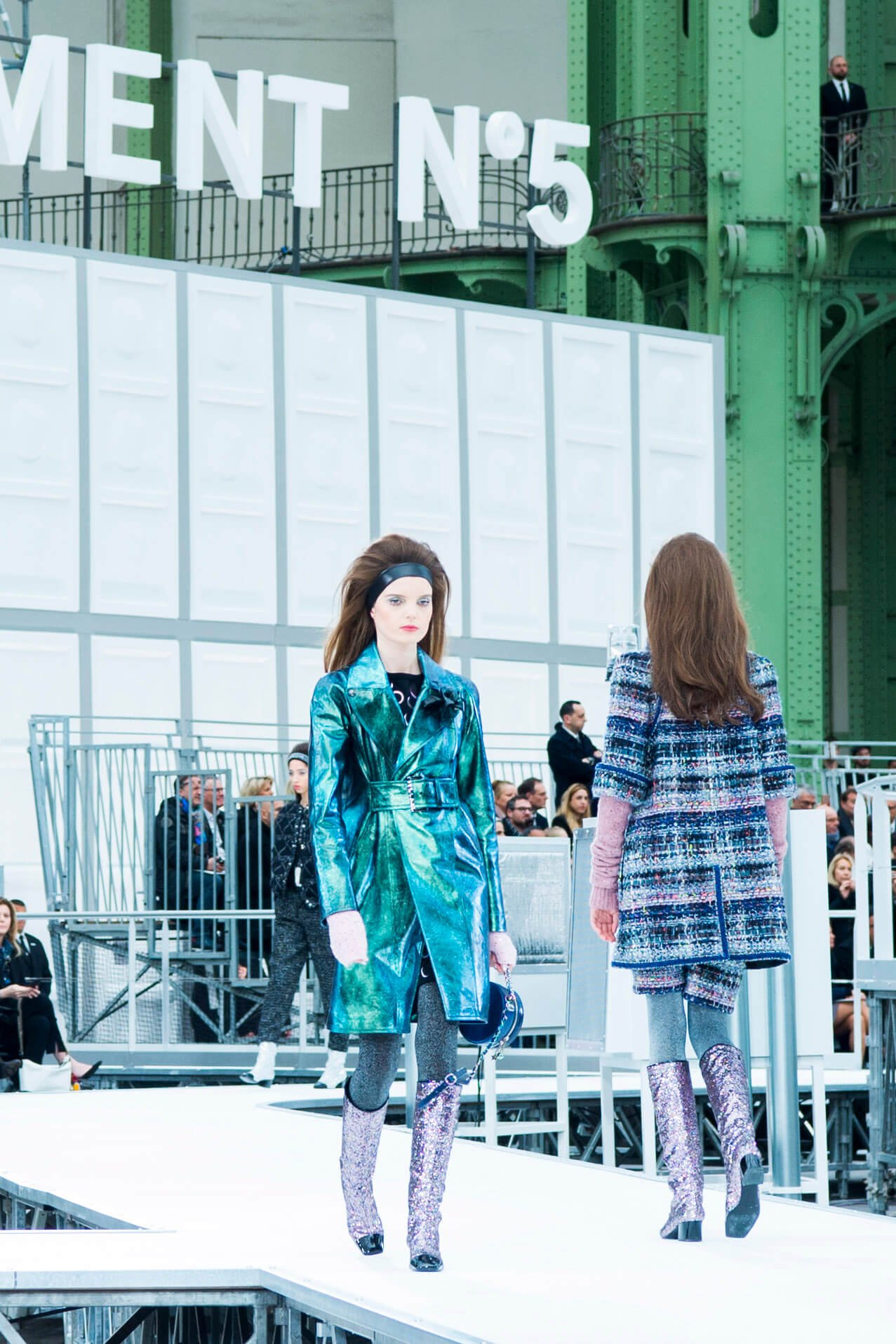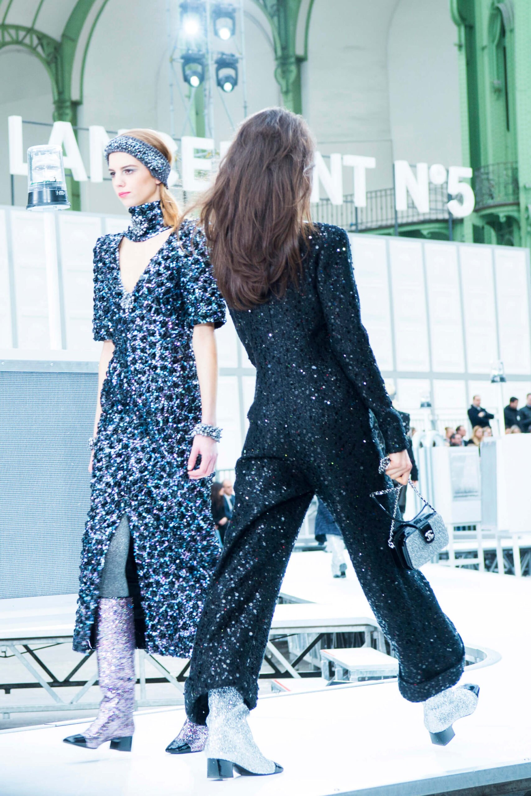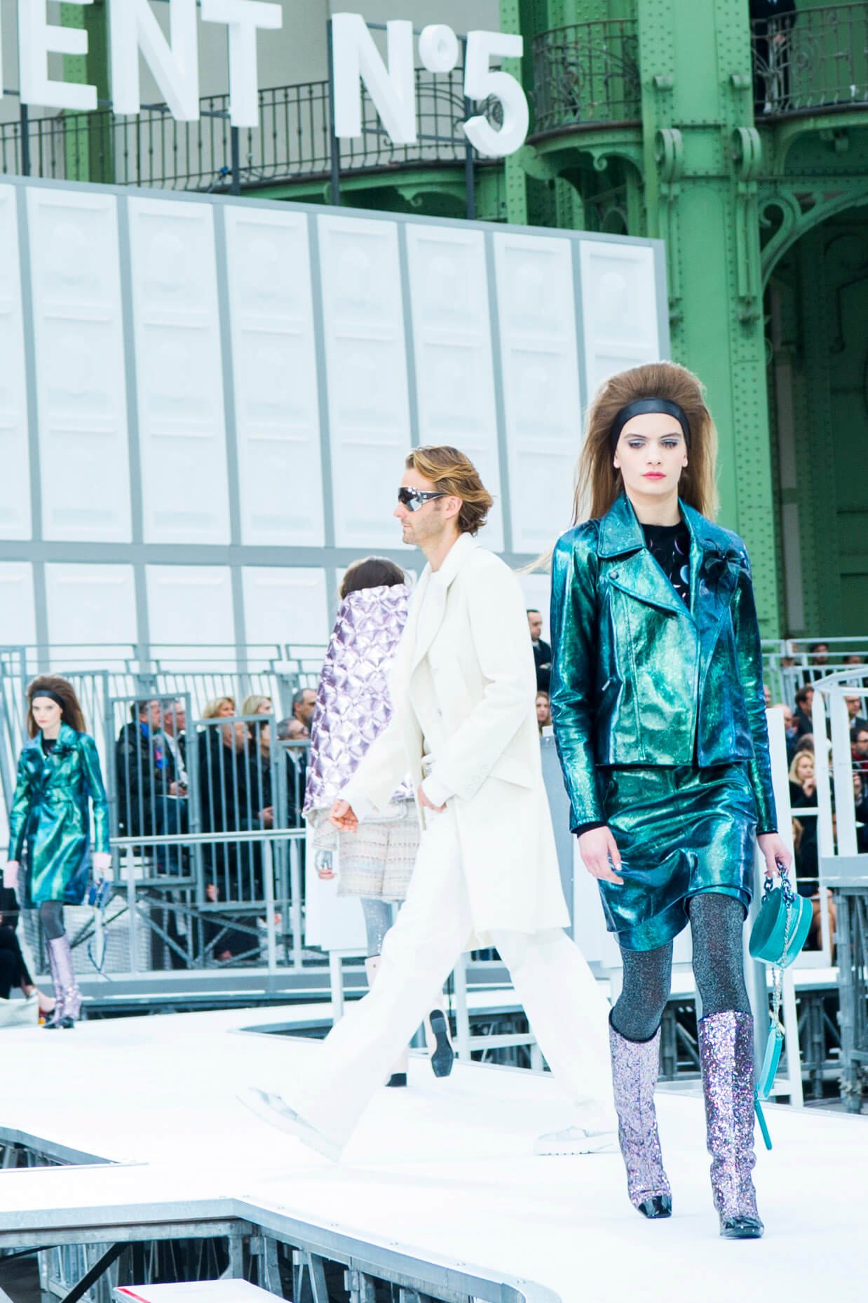 Cor, those Chanel girls don’t half get about do they? Under the sea, atop a polar ice cap, inside a super computer, down the supermarket… how do they get the holiday days? And now, they’re only going intergalactic. Well, a colossal rocket supplanted in the middle of the Grand Palais, as we found this morning, would suggest travel of the outer space variety. But where, exactly, are they going? The galaxy is a big place, you see. The moon? Through a wormhole to alter the space-time continuum? Or, perhaps, to communicate with alien life to stop them from blowing us to smithereens? Let’s assume the latter. Because what better ambassador to send than a beautiful lady clad entirely in Chanel? In Karl’s world such things as a space suit (pssh) are not necessary. No, these astronauts wear tweed, obviously – here, the Chanel two-set was refigured to include this high funnel neckline, a bit Trekkie, or made from this this soft, fluffy baby pink wool. Which looked quite warm. Because space is cold, presumably. Hence also those shiny blankets that sat around the models necks, like a puffy version of what you get after a marathon. And, on the subject of shiny – there was plenty of that, because what says space travel more than something shiny? – glittering tights tucked into equally glittering stargazer boots, shearling jackets shot through with panels of metallic fabric, crystal intergalactic-alien-queen headbands, giant silver backpacks. Oh, and on a more practical note, there were shorts, some of which that sat beneath matching tweed skirts – because in anti-gravity situations, no lady wishes to expose themselves, do they? At the end of the show, the rocket literally took off. Of course it did. Bravo Karl on another truly magical Chanel experience!