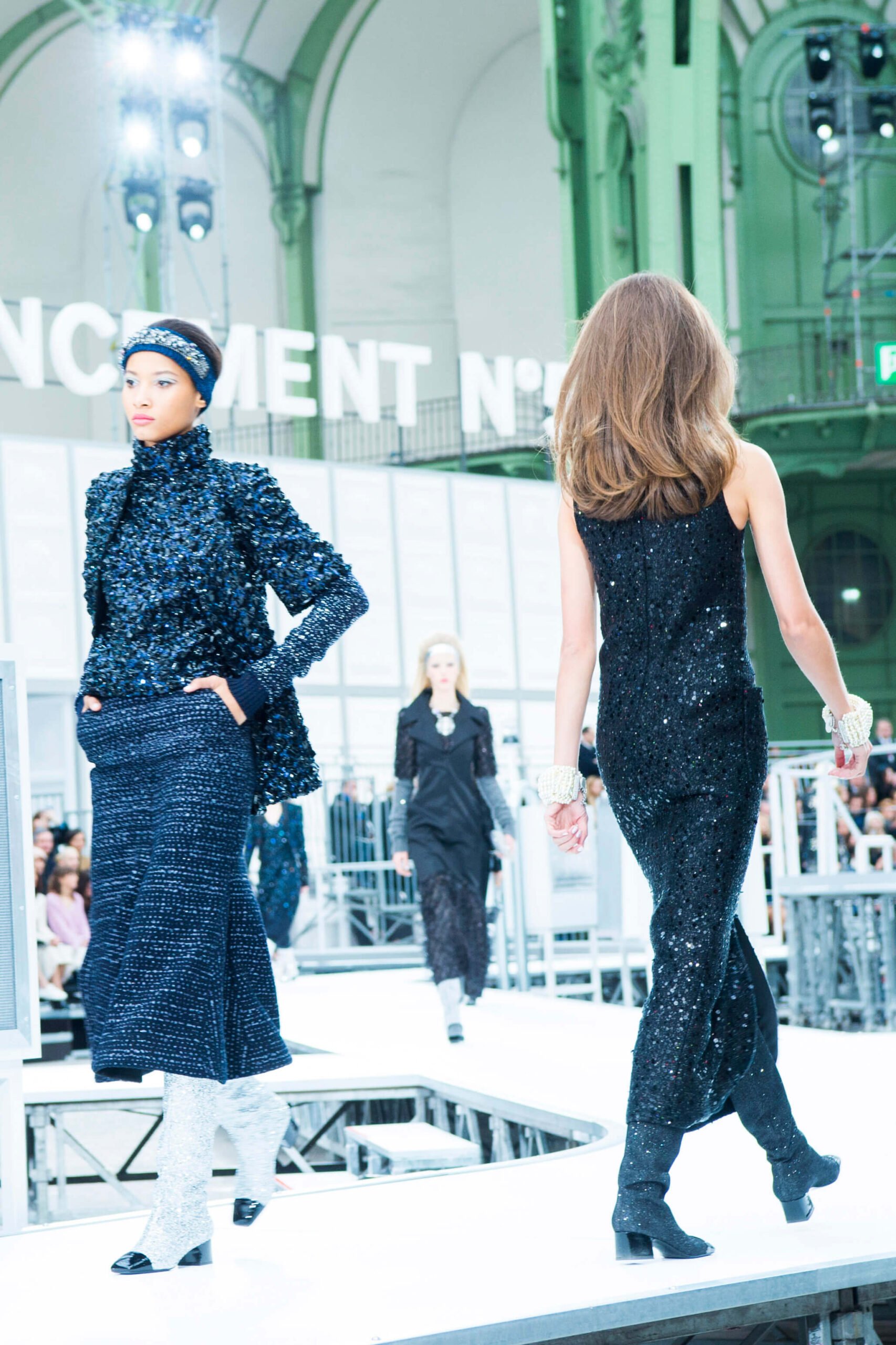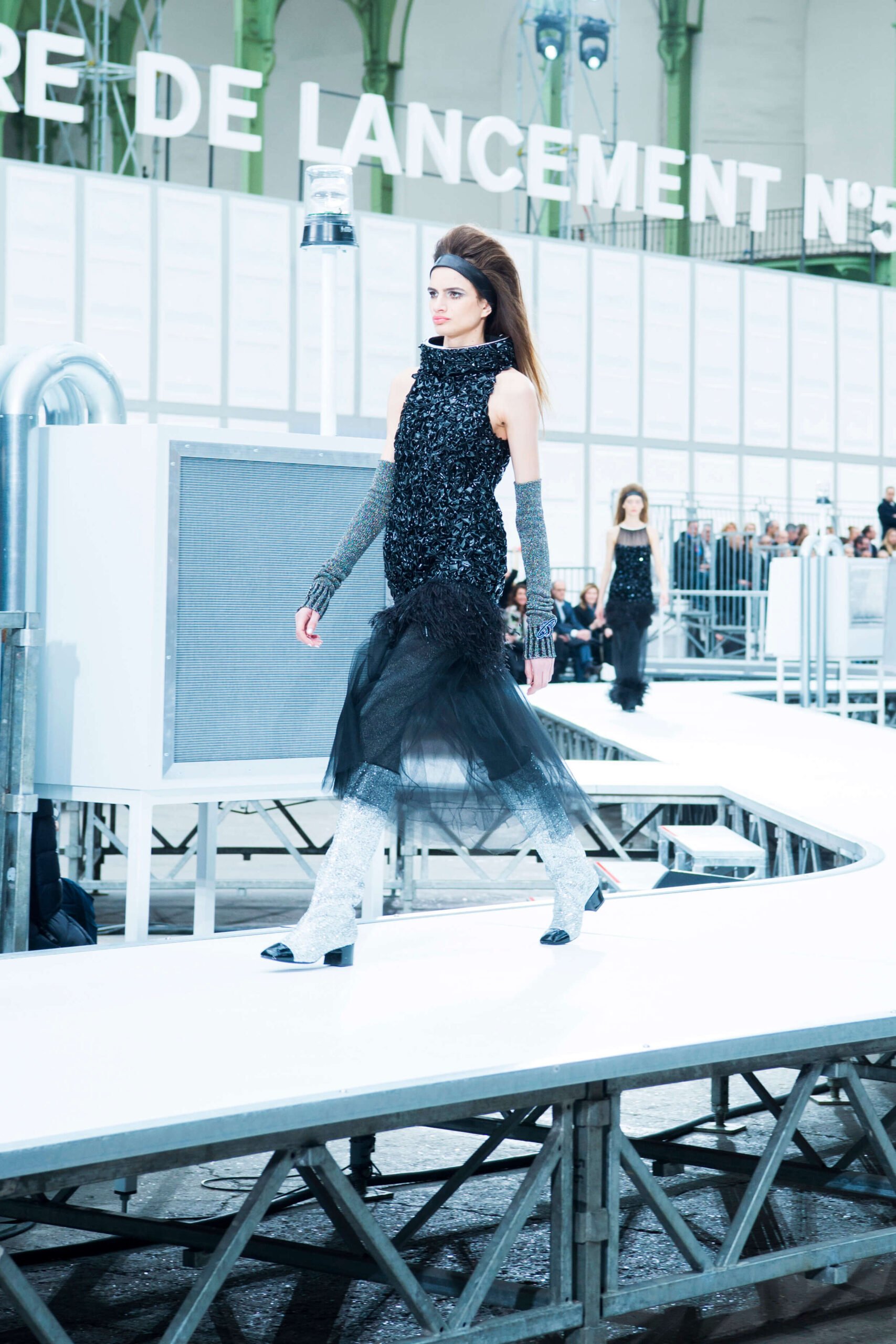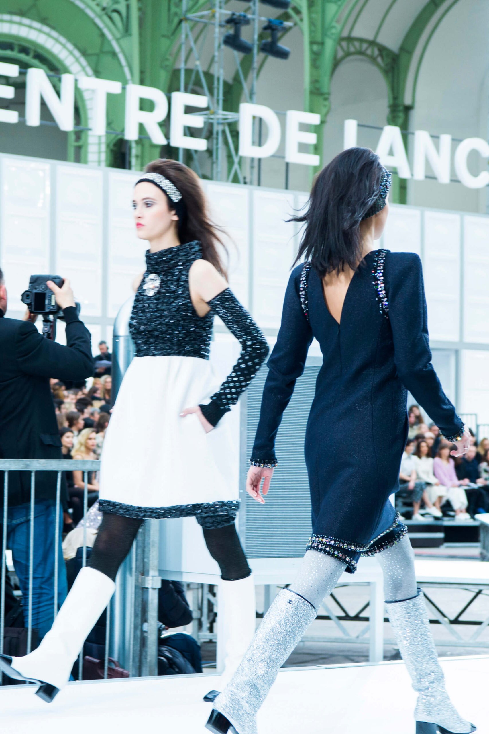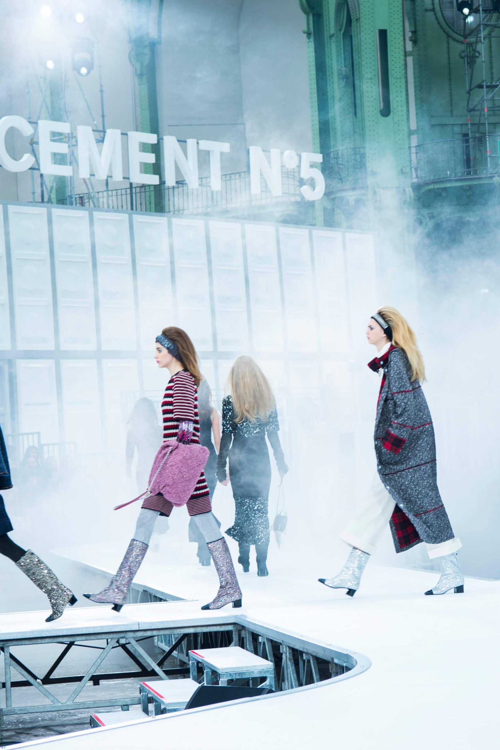Cor, those Chanel girls don’t half get about do they? Under the sea, atop a polar ice cap, inside a super computer, down the supermarket… how do they get the holiday days? And now, they’re only going intergalactic. Well, a colossal rocket supplanted in the middle of the Grand Palais, as we found this morning, would suggest travel of the outer space variety. But where, exactly, are they going? The galaxy is a big place, you see. The moon? Through a wormhole to alter the space-time continuum? Or, perhaps, to communicate with alien life to stop them from blowing us to smithereens? Let’s assume the latter. Because what better ambassador to send than a beautiful lady clad entirely in Chanel? In Karl’s world such things as a space suit (pssh) are not necessary. No, these astronauts wear tweed, obviously – here, the Chanel two-set was refigured to include this high funnel neckline, a bit Trekkie, or made from this this soft, fluffy baby pink wool. Which looked quite warm. Because space is cold, presumably. Hence also those shiny blankets that sat around the models necks, like a puffy version of what you get after a marathon. And, on the subject of shiny – there was plenty of that, because what says space travel more than something shiny? – glittering tights tucked into equally glittering stargazer boots, shearling jackets shot through with panels of metallic fabric, crystal intergalactic-alien-queen headbands, giant silver backpacks. Oh, and on a more practical note, there were shorts, some of which that sat beneath matching tweed skirts – because in anti-gravity situations, no lady wishes to expose themselves, do they? At the end of the show, the rocket literally took off. Of course it did. Bravo Karl on another truly magical Chanel experience!