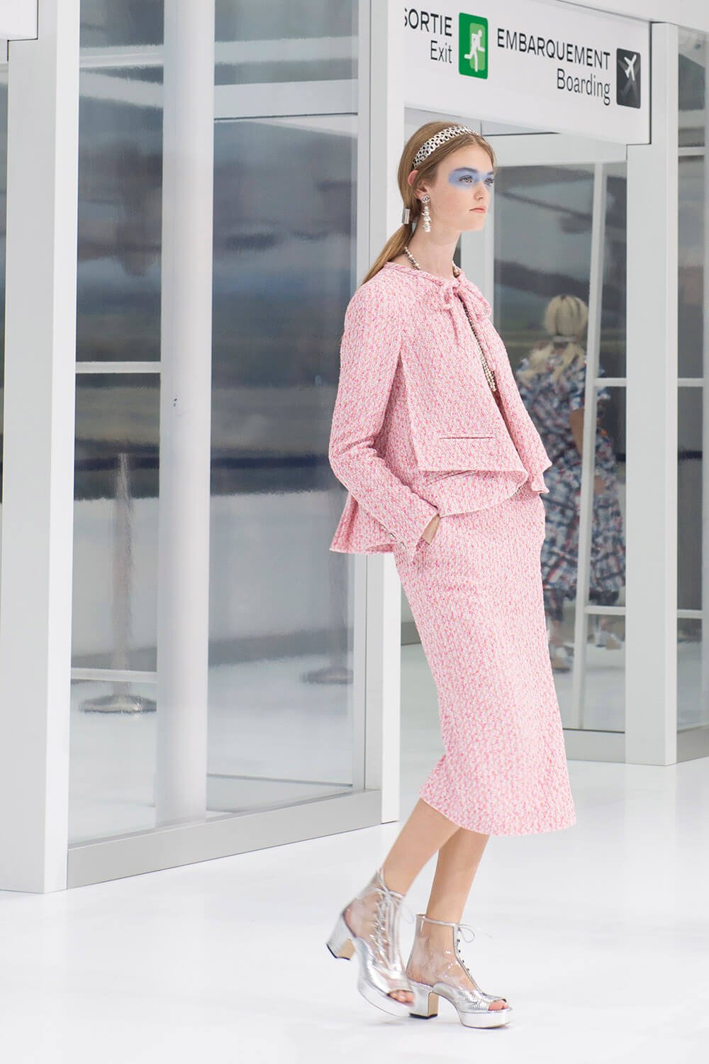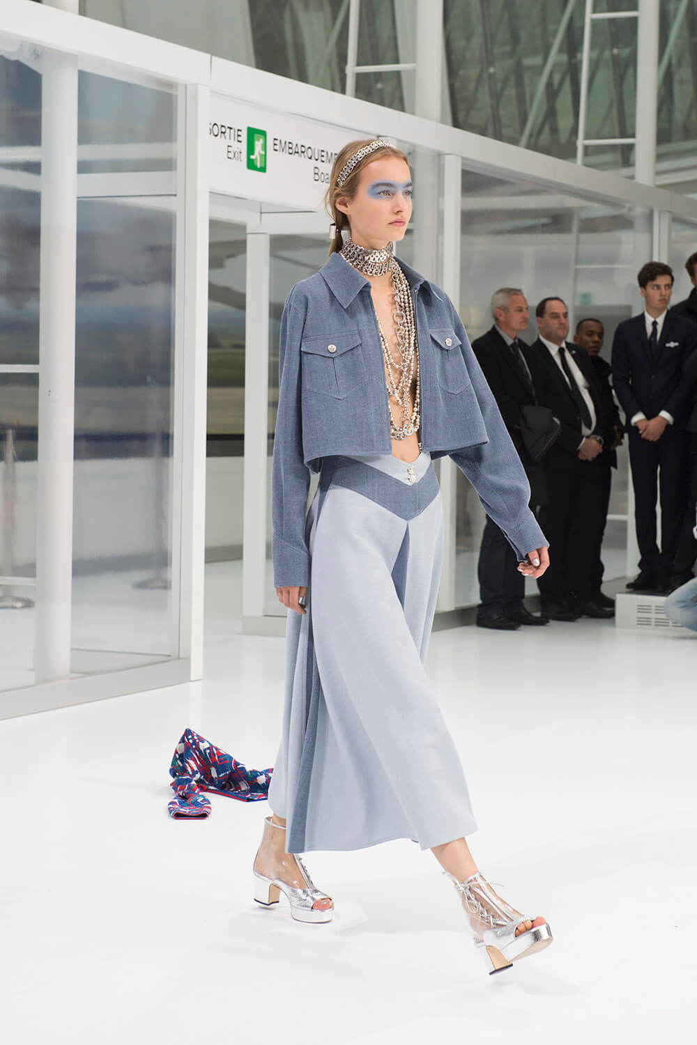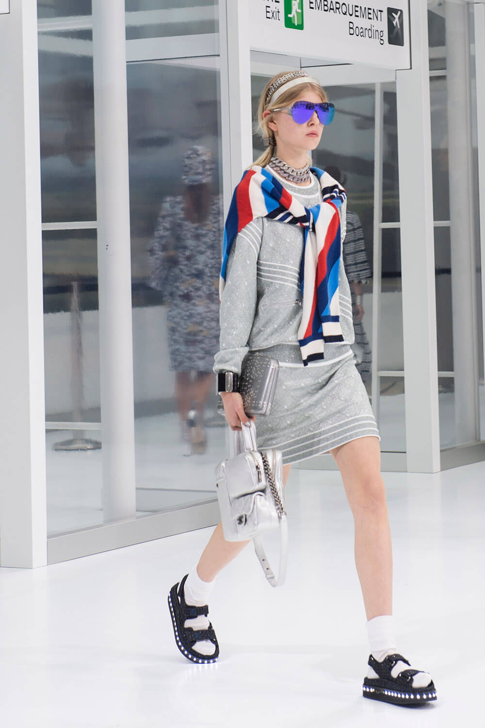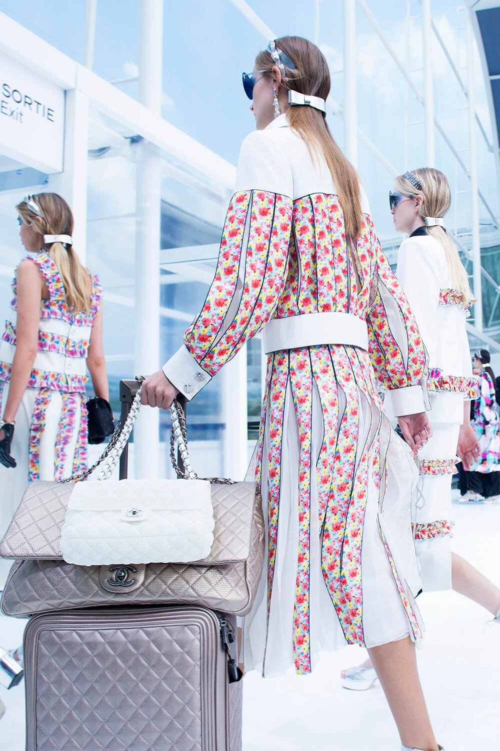 Imagine if Chanel had their own airline: curly-C’s entwined on a tail-fin, chic pilots in high-collared shirts like Kaptain Karl himself, and plenty of tweedy suits for the air stewards. Well, you don’t have to imagine anymore! Actually, you do: Chanel airlines was but a dream, a Lagerfeld fantasia for spring/summer 2016 where we, the invited guests numbering 2,555 (really: except I’m sure a few didn’t set their alarms and missed the boarding call) saw a vision of the future. Idyllic it was too. Imagine if Chanel offered sleep-suits on their red-eye flights, in fetching tricolour prints of poppy graphics, or departure-board scribbles like after-dark neons, or metallic-flecked tweeds and sequins and slick, aerodynamic evening dresses. And jumbo quilted bags as carry-on luggage? Yes please. Definitely willing to exceed our allowance for that.