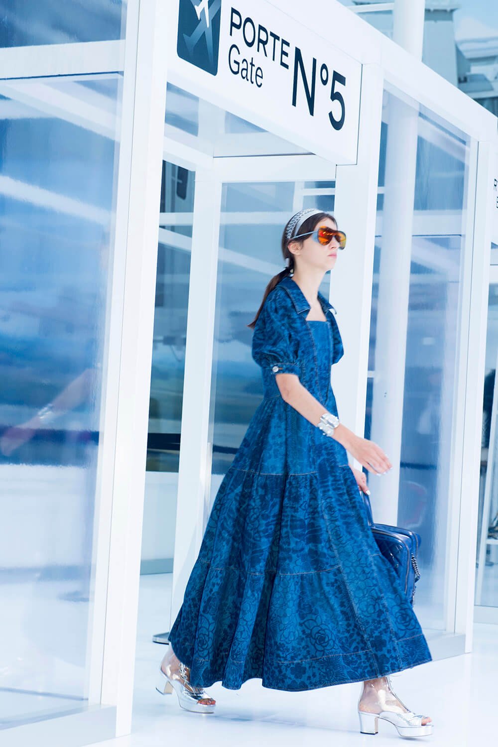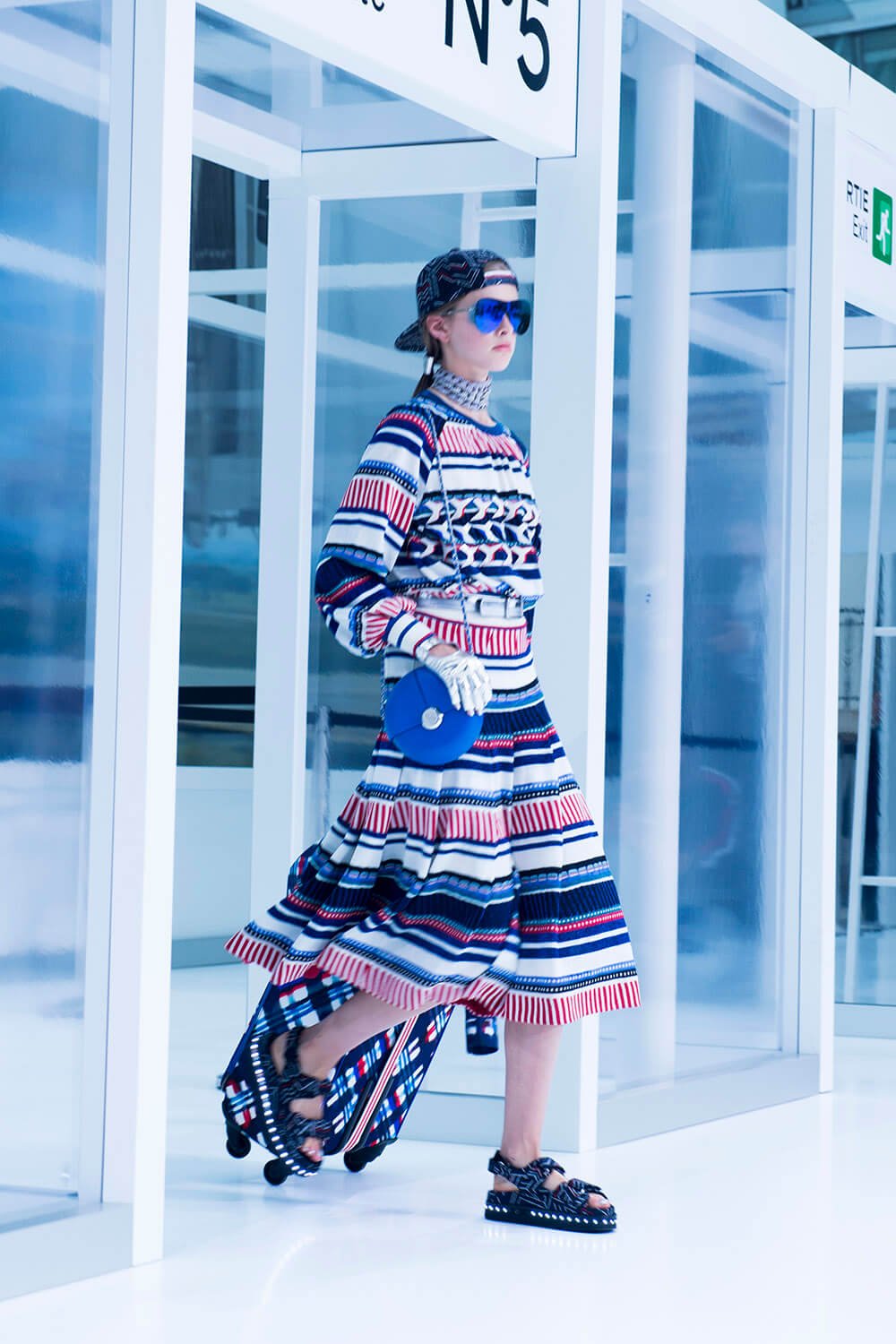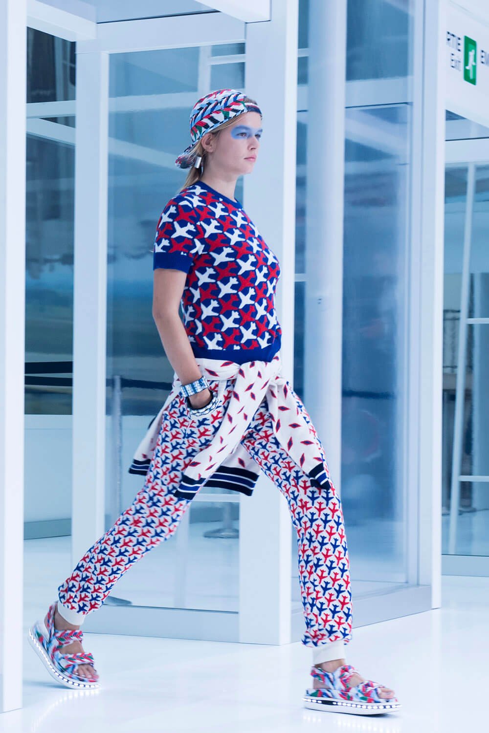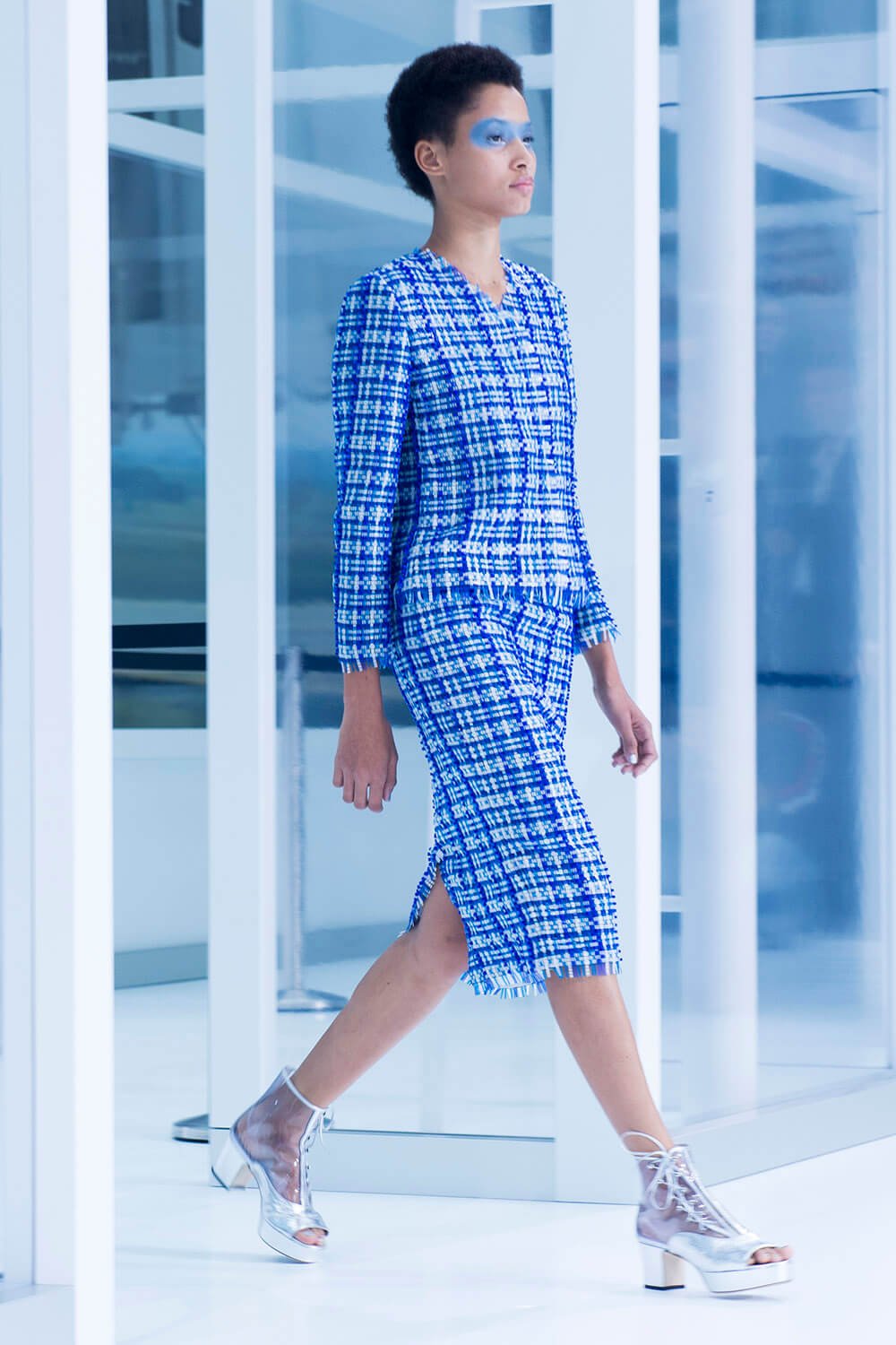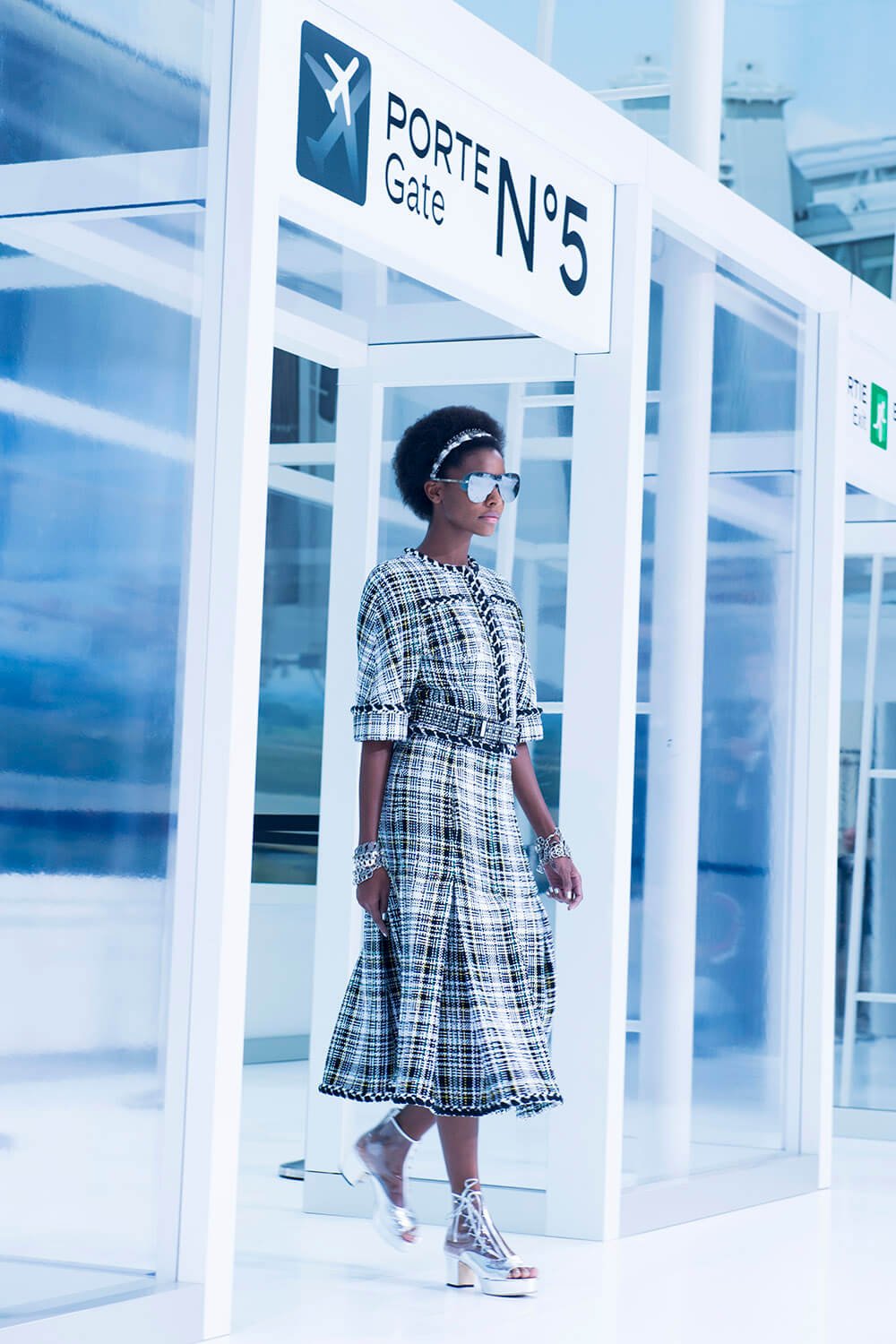 Imagine if Chanel had their own airline: curly-C’s entwined on a tail-fin, chic pilots in high-collared shirts like Kaptain Karl himself, and plenty of tweedy suits for the air stewards. Well, you don’t have to imagine anymore! Actually, you do: Chanel airlines was but a dream, a Lagerfeld fantasia for spring/summer 2016 where we, the invited guests numbering 2,555 (really: except I’m sure a few didn’t set their alarms and missed the boarding call) saw a vision of the future. Idyllic it was too. Imagine if Chanel offered sleep-suits on their red-eye flights, in fetching tricolour prints of poppy graphics, or departure-board scribbles like after-dark neons, or metallic-flecked tweeds and sequins and slick, aerodynamic evening dresses. And jumbo quilted bags as carry-on luggage? Yes please. Definitely willing to exceed our allowance for that.
