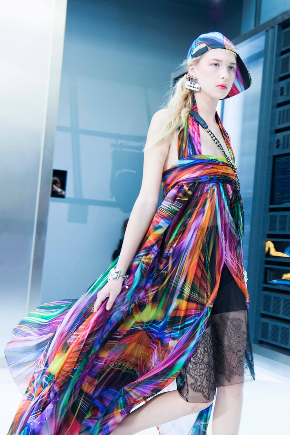 Welcome to the future. Today in the Grand Palais, we sat in Data Centre Chanel. Around us lights flickered, wires intertwined, screens rapidly downloaded codes and the sound of the future vibrated. Stranger things style. Our hearts were racing before it had begun. Maybe all that radiation. The beat pulsated fast and hard, urgently. And then the Chanel cyborgs appeared. The first, wearing Storm Trooper-esque masks. Chanel Troopers. And so they trooped in tweed suits and caps twisted to the side, hip hoppin’ through that data centre. Jackets had piped edges like all the colourful cables spewing; checks were like the inside of computer boards, optical and fresh, and liked the new shiny quilted suits as well. Light layering felt youthful as silk lace trimmed slip dresses peeking from under slit tweed skirts. It was techno cyber fabulousness. Printed multi coloured liquidity moved with ease, no confusion here like well programmed software. We are all hard wired to technology but Chanel took it one click further. Oh Karl. It seems we’ve been living on the wrong digi planet. This one is so much more us. We want to be coded, Karl style. There’s no better future than this.