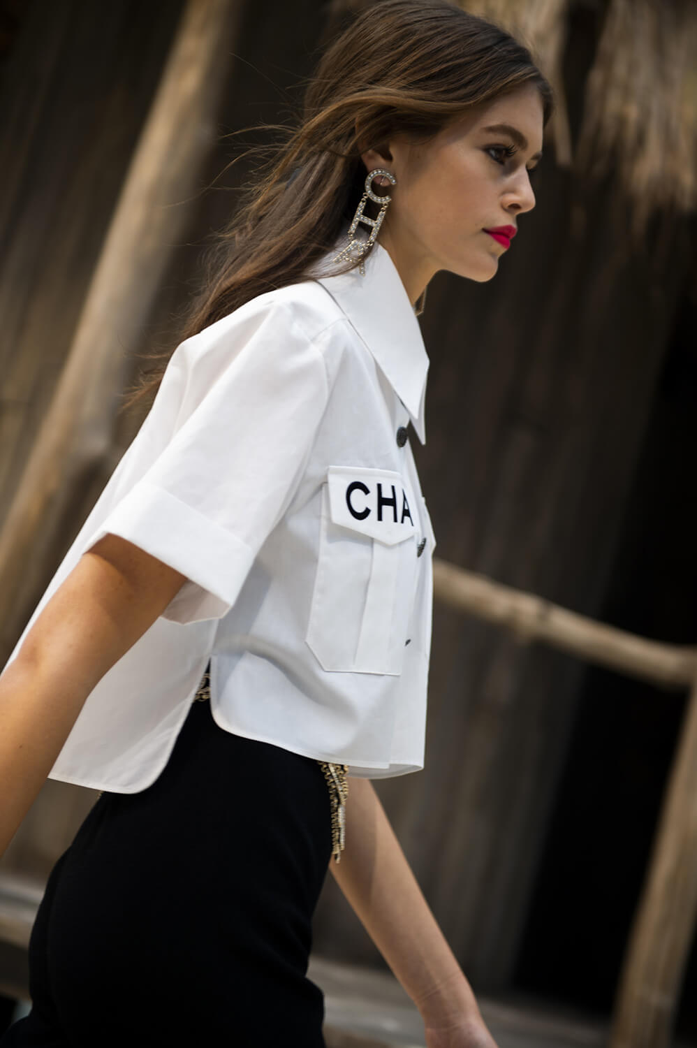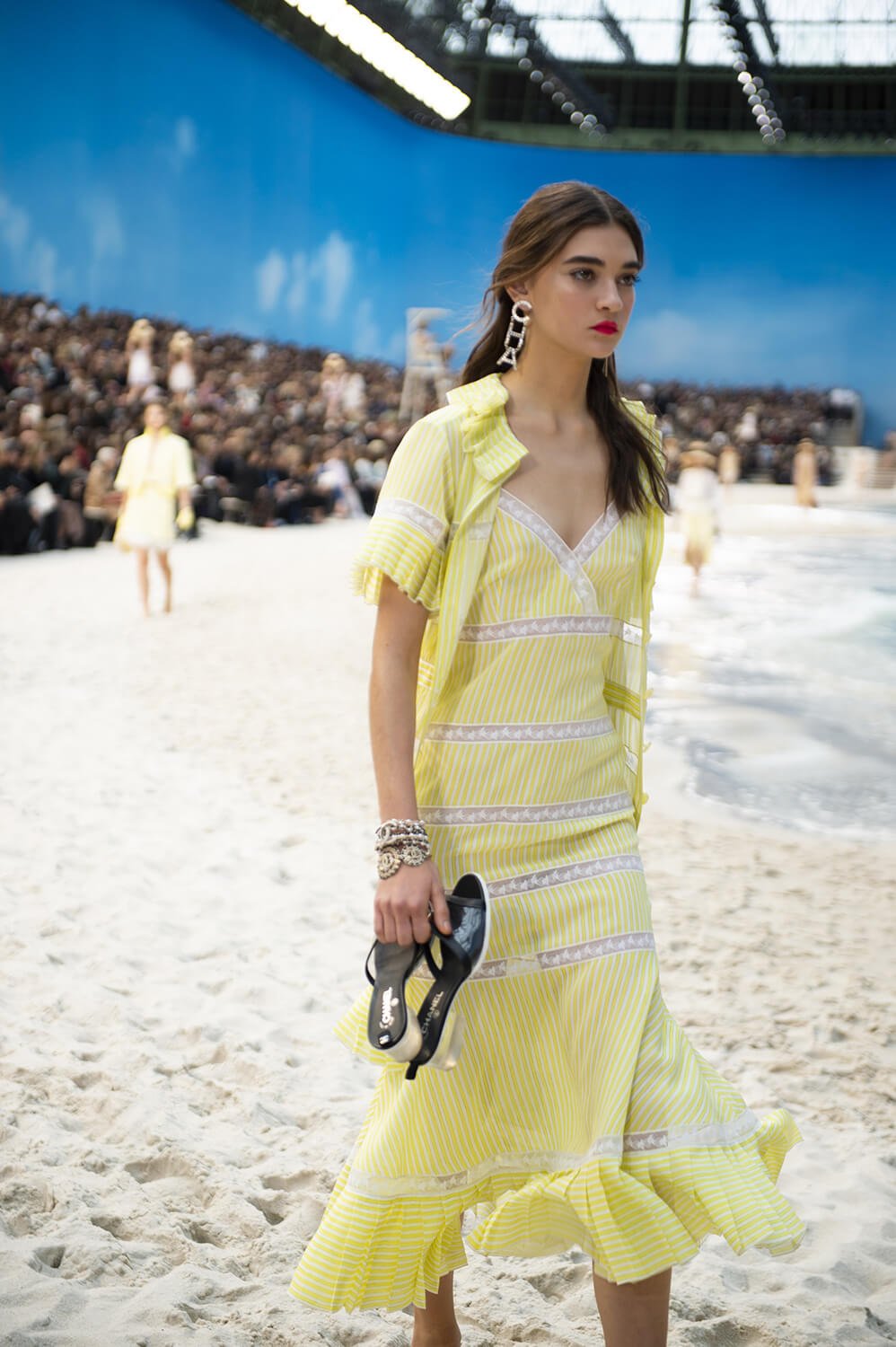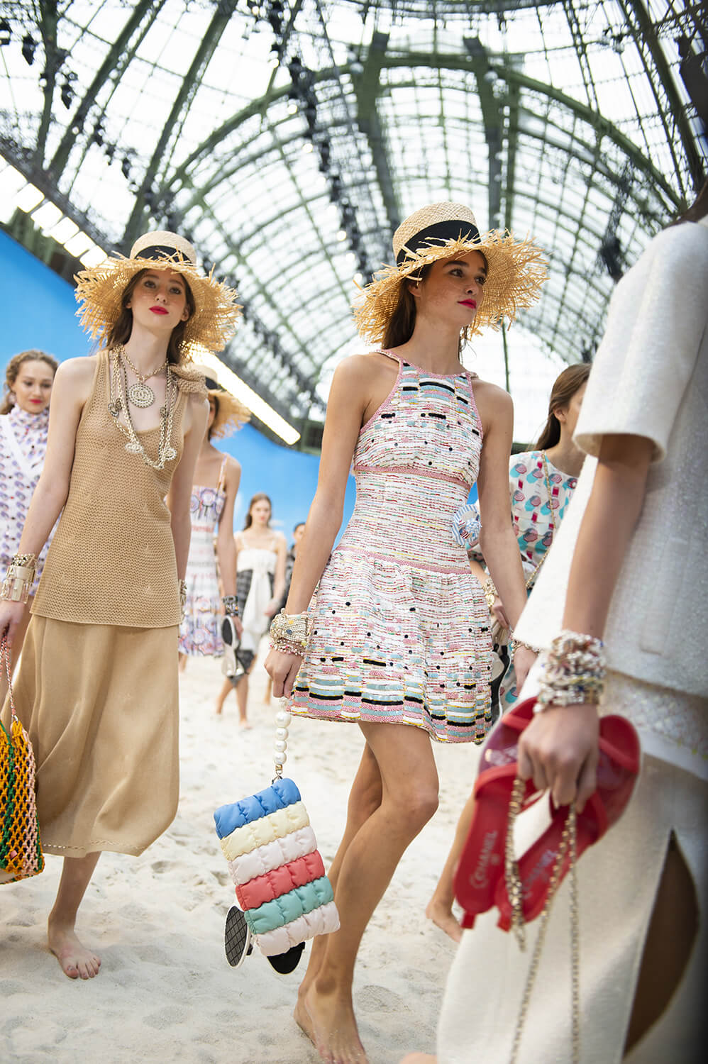 Stepping into a Chanel show is like entering a parallel universe. The real world is immediately forgotten inside the Coco dimension. This season we worm-holed to the perfect beach setting complete with a blue sky cyclorama that encircled the vast show space. A wooden boardwalk ringed the set and gentle waves (real!) lapped the golden beach (also real). Many guests ignored the advice to wear flat shoes in order to negotiate the sandy runway. The models had a better idea. They walked barefoot, splashing through the surf in boxy tweed skirt suits, carrying their sandals. In their smart, ladylike ensembles they look as if they’d escaped from a chi-chi quayside lunch for the freedom of the sea.