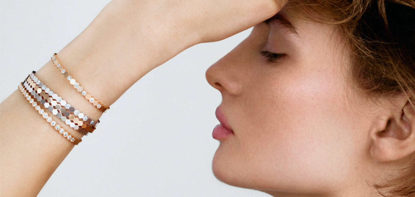 While Bee My Love draws a golden thread of continuity through the Chaumet saga, the honeycomb construction also delivers a modern message of connectivity – of time, cultures and styles, from Chaumet’s 19th-century naturalistic romanticism to rigorous architectural art deco. It’s tempting, too, to see a witty whiff of Victorian sentimentalism and wordplay in the title Bee My Love. As Leung explains, Chaumet’s design books are alive with insects, butterflies, dragonflies, beetles and spiders, hovering among effusive floral designs, and Bee My Love was a way of giving new meaning and a young, fashion-forward vibe. With edgy playfulness and effortless versatility, the new models offer inclusivity, welcoming clients into the Bee My Love community, which is particularly strong in the Middle East and Asia Pacific region. The pick-and-mix stackability of the rings, earrings, bangles and necklaces, which lend themselves to layering, appeal to Middle Eastern clients, enabling them to belong to a style tribe and show individuality in how they mix and match.