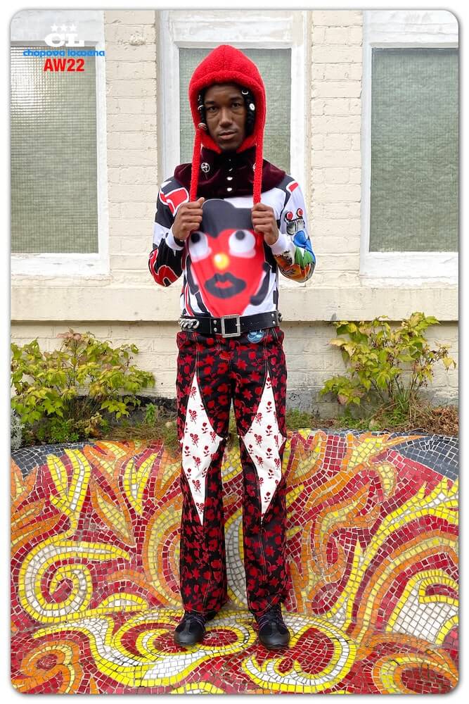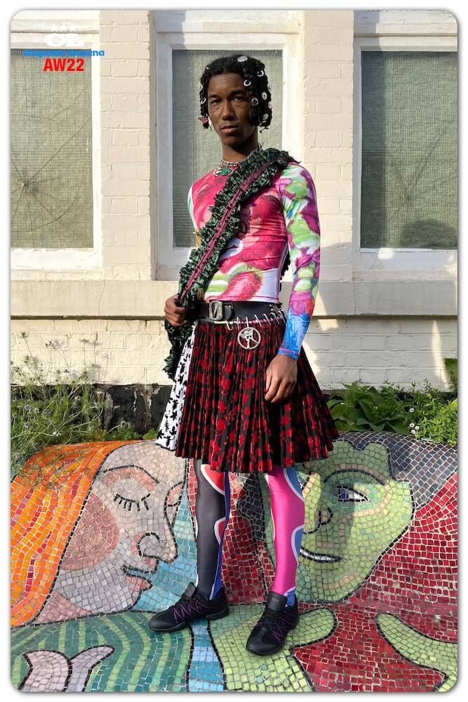 For AW22, designer Emma Chopova and Laura Lowena-Irons present a vibrant, kaleidoscopic collection, which pushes their exuberant design vocabulary further afield. Ever wanted to channel an ancient Slavic deity that got lost in Camden Town and donned anarchic tartans à la Westwood? This is your chance. The abundance of historical references – the chains, both as ornaments and prints, were inspired by the medieval garments – goes in hand with leggings or sneakers made out of net.