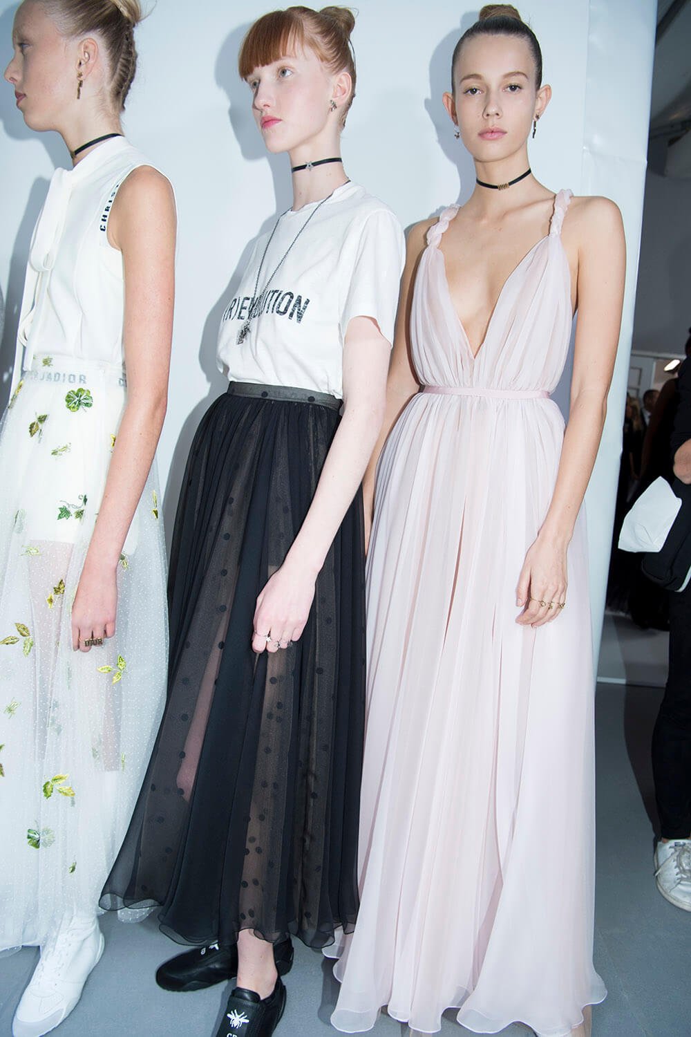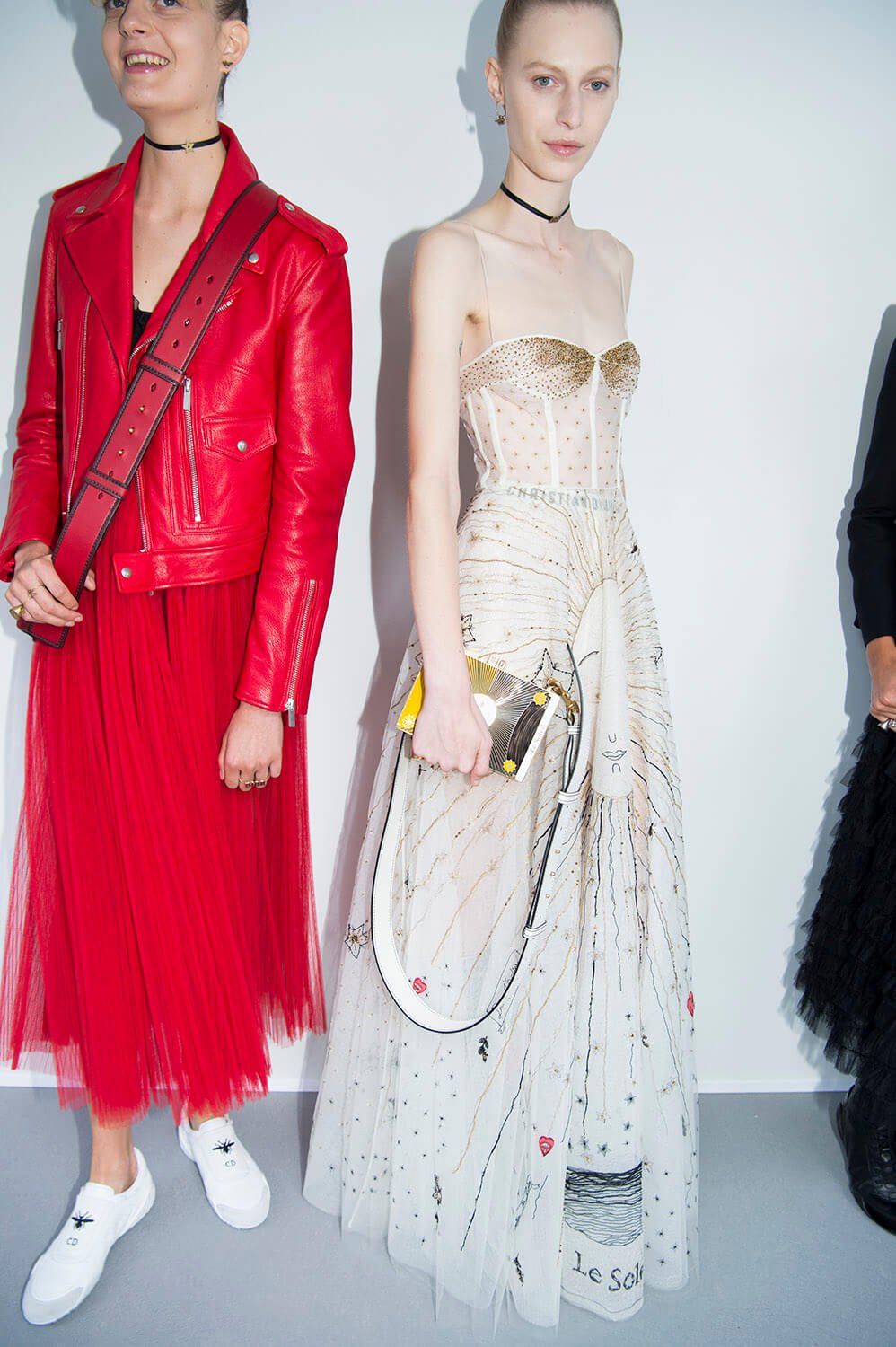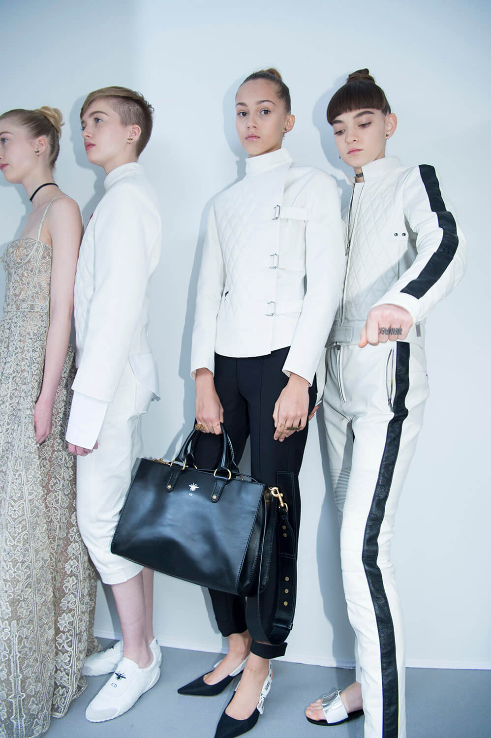 We should all be feminists. That was the message of Maria Chiuri Grazia’s debut outing for the house of Christian Dior. A message that was, handily, also printed upon a t-shirt, just in case you forgot. It was a fitting slogan for Maria, a designer who is, as you may have noticed, a woman, which, in turn, makes her the very first woman to take the helm of the Parisian house. Thus, this collection was a mission, a mission to create clothing that reflected modern womanhood. “I strive to be attentive and open to the world and to create fashion that resembles the woman of today,” said Maria before the show. So what was this? Well, it began with the uniform of the fencer. As in, the sport. That one were they poke each other with swords or something. The reason? Because, as Maria said, the clothing that a fencer wears is worn by both male and female competitors – the difference being that it is the woman’s body transforms and alters the shape the shape of the garment. So that was the starting point – and, as is the deftness of Maria’s hand, the athletic shape was transformed into something altogether more romantic – the fencer’s tabard becoming more like a bodice, worn with trousers that cut off at the knee, or with a full-length, sheer layered skirt – a sort of athletic, Olympian take on the ballgown. A single red heart was embroidered upon the chest of the opening look. It was this play between masculine and feminine that remained as we moved away from the fencer – floating ballet skirts worn with leather jackets and boxing boots, peeks of bra straps and waistbands emblazoned with Christian Dior, a bit like the waistband of men’s boxers, a bar jacket worn not with a blouse but a t-shirt. This one said Dio(r)evolution. Fitting, no? Because this was a revolution of sorts. This is a Dior lady who’s ready to move. And, she even has a pair of trainers to do it in. But don’t worry – to end, a frisson of sheer tulle dresses, corseted on the bodice and delicately embroidered with the signs of the zodiac. Because, well, this is Dior mon cherie. Where would we be without a little drama?