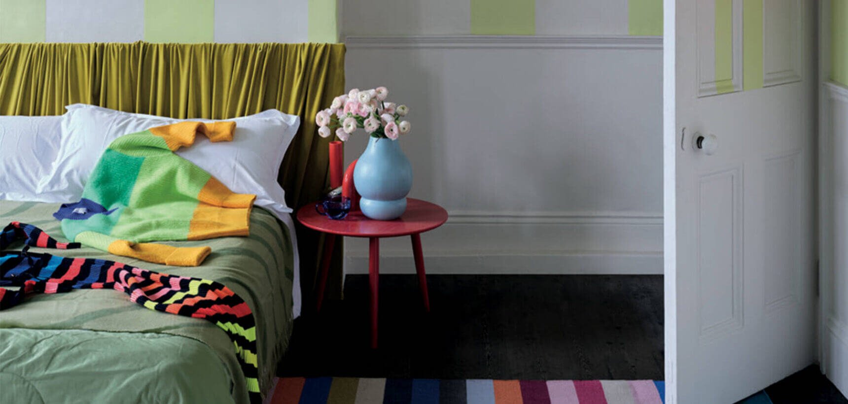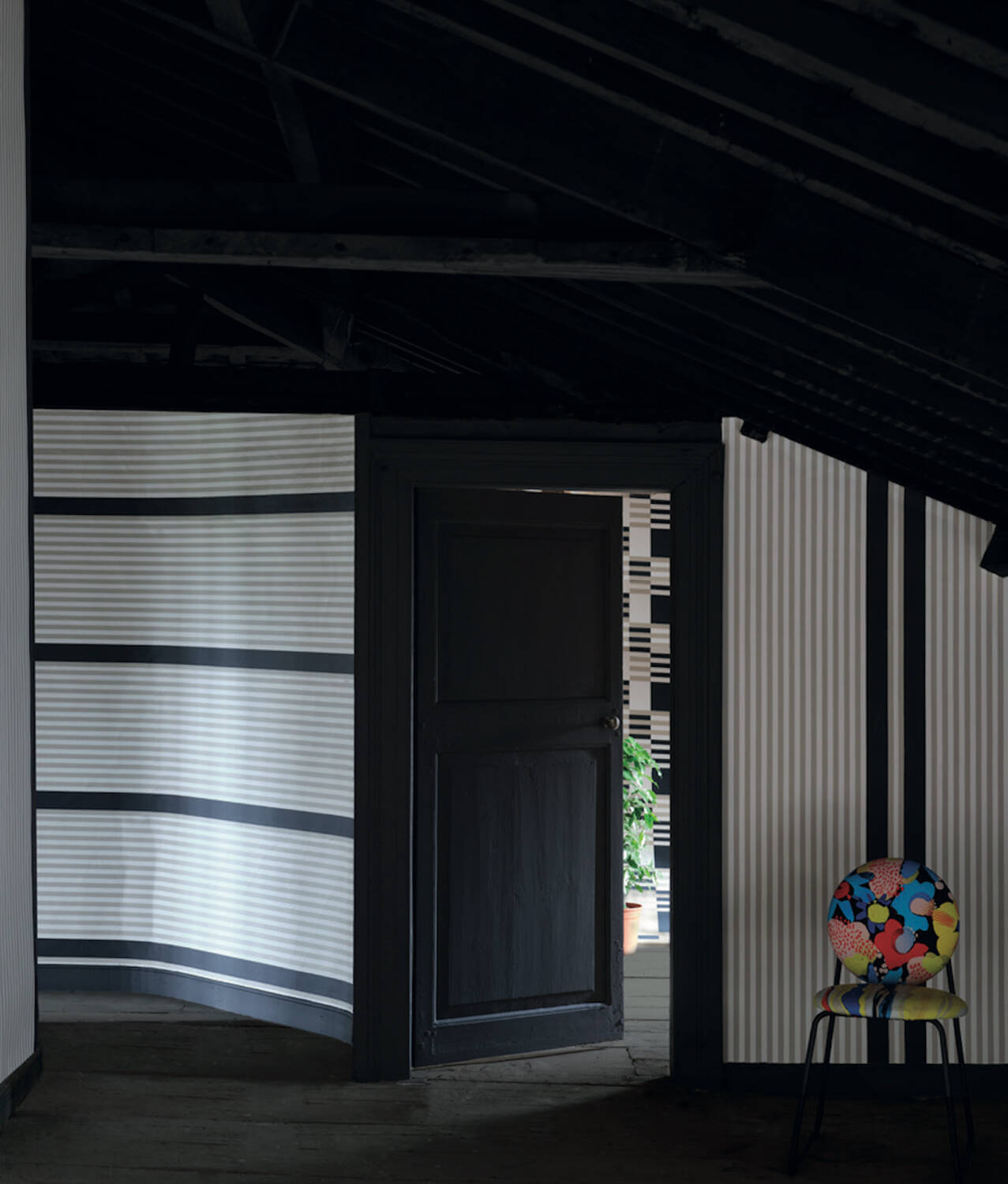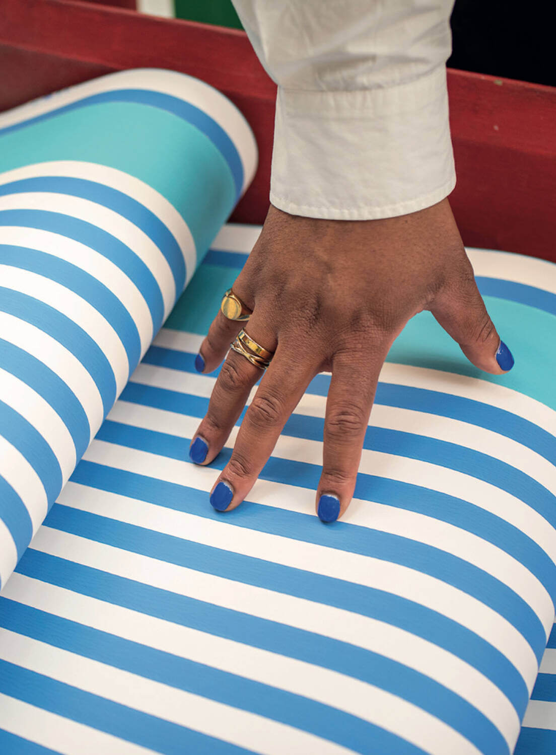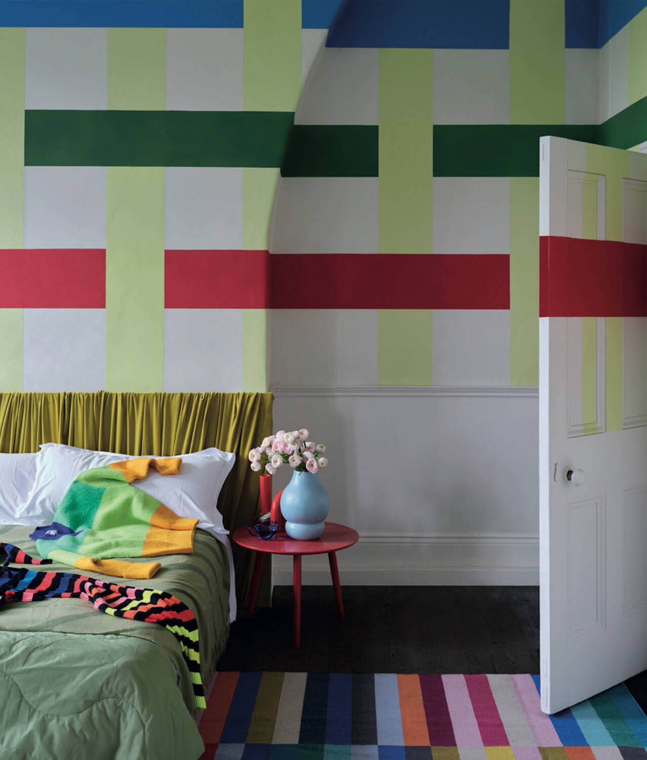 The result is a foundation of four neutrals, eight statement shades and three zesty wallpaper prints. Those 12 new paint shades range from Lobster and Pea Flower Tea blues to Raw Tomatillo green, Hog Plum yellow to Romesco crimson, Shallot pink and more, to structural neutrals like roasted macadamia Cardamom, Au lait and black Liquorice. “Colours, and the feelings that I get from them, are always my starting point when working,” he explains. The wallpaper? That’s where the pattern play comes in. A first time endeavour for Farrow & Ball’s collaborative projects, the decorative overlays each play with a different, geometric shape. Dots add tantalising depth to interiors. Wide statement stripes lengthen a room and bold, Bauhaus-inspired checks pay homage to the innovative work of Anni Albers. Each of them bears a tactile finish achieved by hand-painting paint on paper at Farrow & Ball ’s Dorset Factory. With these artisanal paints and papers “the customer can craft a room that’s entirely neutral with a bit of our paper, something incredibly kaleidoscopic, or a room that sits neatly in-between these two spaces” according to Rogers.