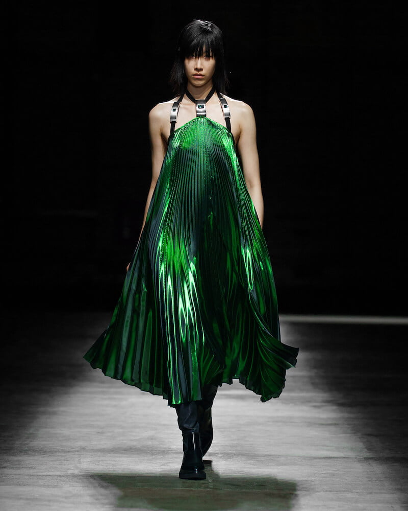 Kane pulled his beloved Brats characters he’s been painting and dousing in glitter throughout the pandemic and plastered them across swollen T-shirts and hoodies, worn alongside shiny frocks with metal hardware and woollen car coats with fetish-y clown collars in wipe-clean faux patent leather. The designer had Hollywood bombshell, Jayne Mansfield, in mind when it came to extenuating the bust across a series of going out dresses, which came cusped and pointed. “I loved working with a more minimalist approach for spring-summer 22. I felt the need for clean structures and volume. It felt right for now,” wrote the designer. “My intention is always to make women feel confident, safe and sensual when they wear Christopher Kane.”