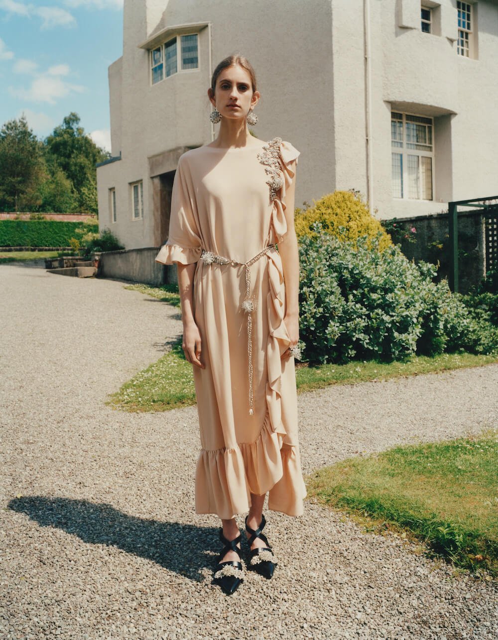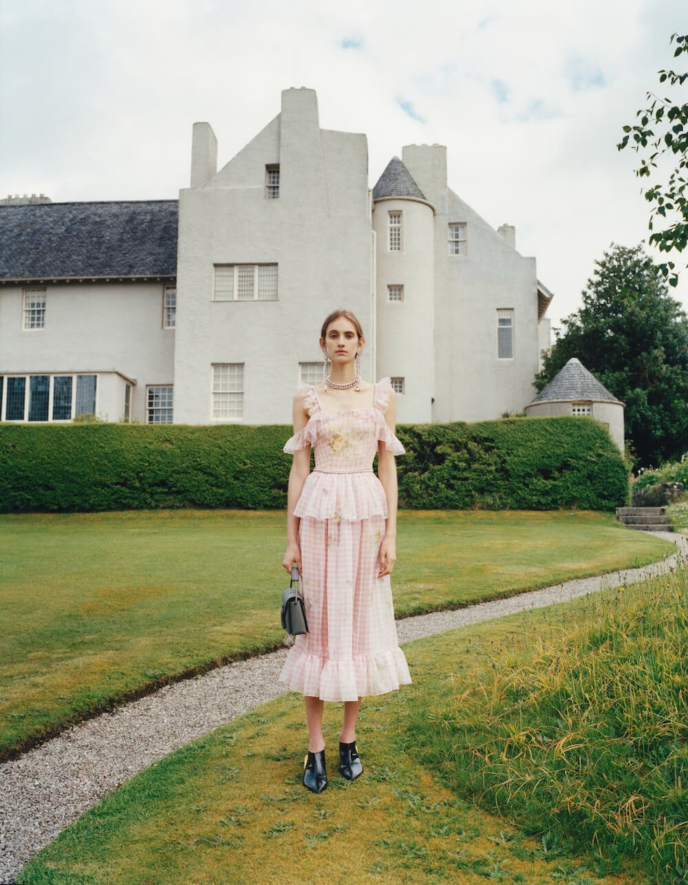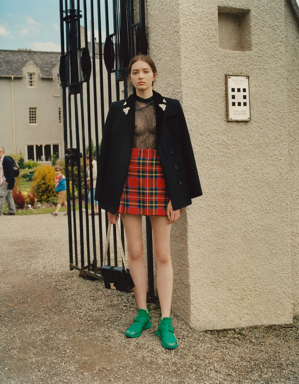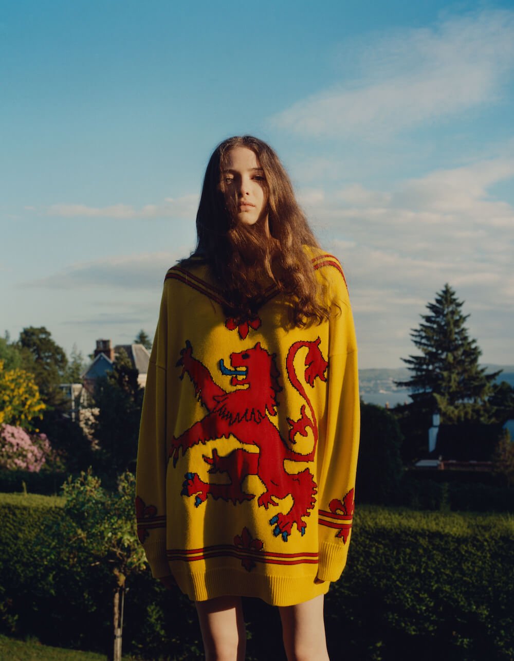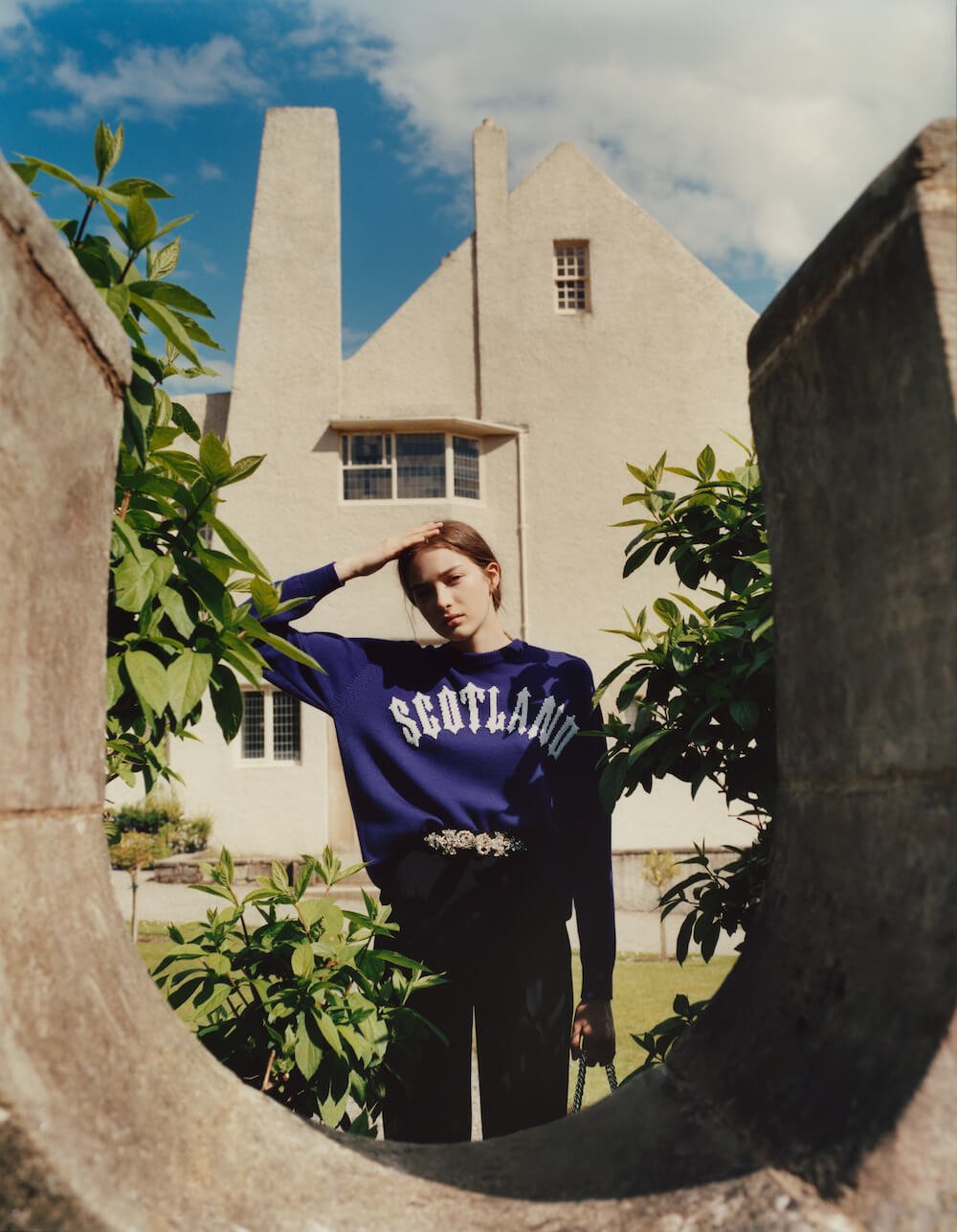 And celebrate he did – not just via the slightly well-trodden symbolism of Scottishness – the touch of tartan that peaks out at various points of the collection, or the Lion Rampant print knitwear, but also through the celebration of some of Scotland’s finest minds, namely, Margaret MacDonald and husband Charles Rennie Mackintosh. Bright flowers, not dissimilar from those seen in Margaret MacDonald’s famed gesso panels, adorn delicate lace and latticed dresses, the former a recurrent theme throughout the collection and another nod to Scotland and her once thriving lace industry. Elsewhere, MacDonald’s elegant, elongated shapes are reflected by modest silhouettes – loose crochet fabric and tiered lace dresses bring an ethereal quality to this collection that we’re sure Mrs. MacDonald would have been very proud of.