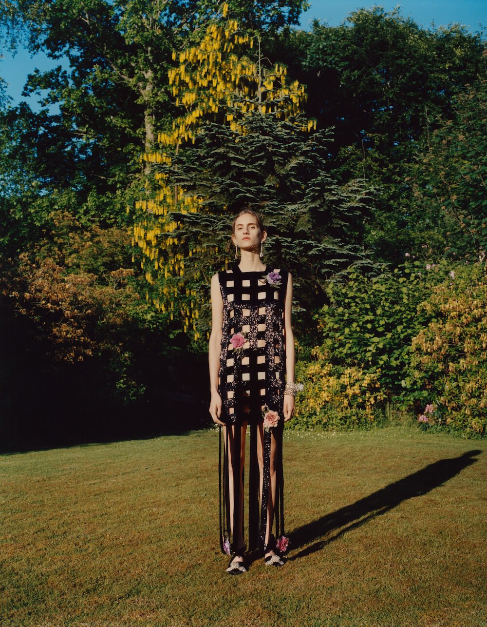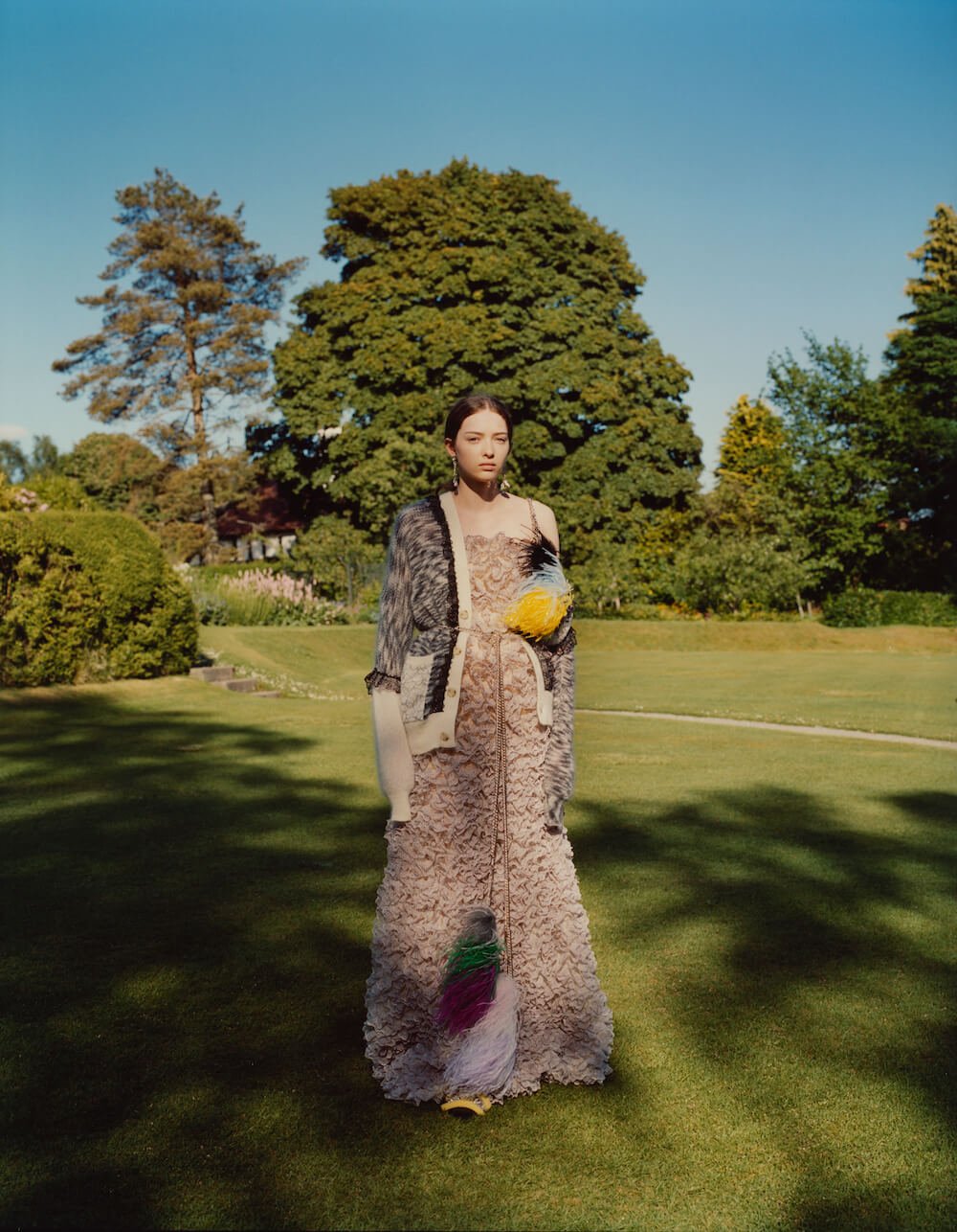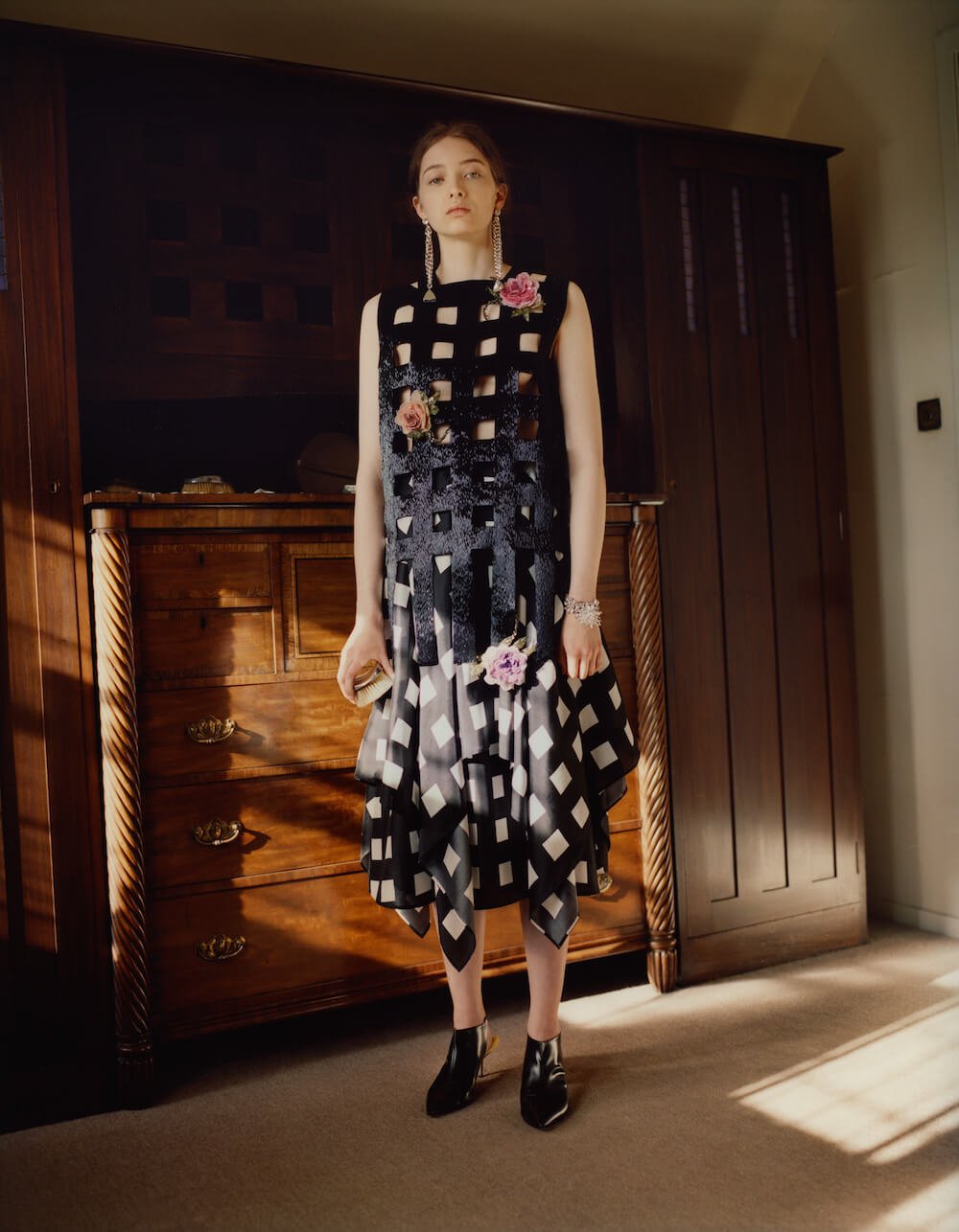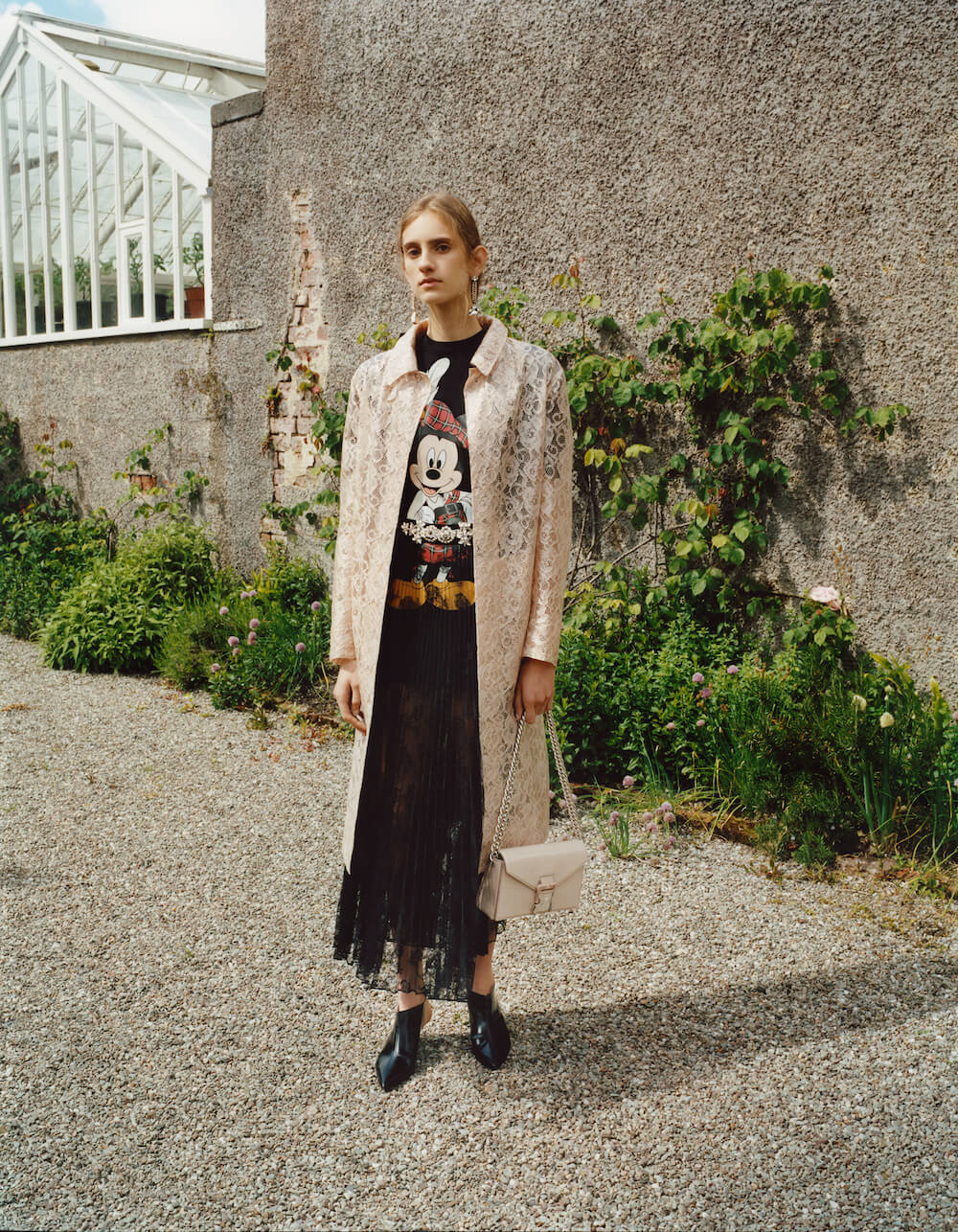 And celebrate he did – not just via the slightly well-trodden symbolism of Scottishness – the touch of tartan that peaks out at various points of the collection, or the Lion Rampant print knitwear, but also through the celebration of some of Scotland’s finest minds, namely, Margaret MacDonald and husband Charles Rennie Mackintosh. Bright flowers, not dissimilar from those seen in Margaret MacDonald’s famed gesso panels, adorn delicate lace and latticed dresses, the former a recurrent theme throughout the collection and another nod to Scotland and her once thriving lace industry. Elsewhere, MacDonald’s elegant, elongated shapes are reflected by modest silhouettes – loose crochet fabric and tiered lace dresses bring an ethereal quality to this collection that we’re sure Mrs. MacDonald would have been very proud of.