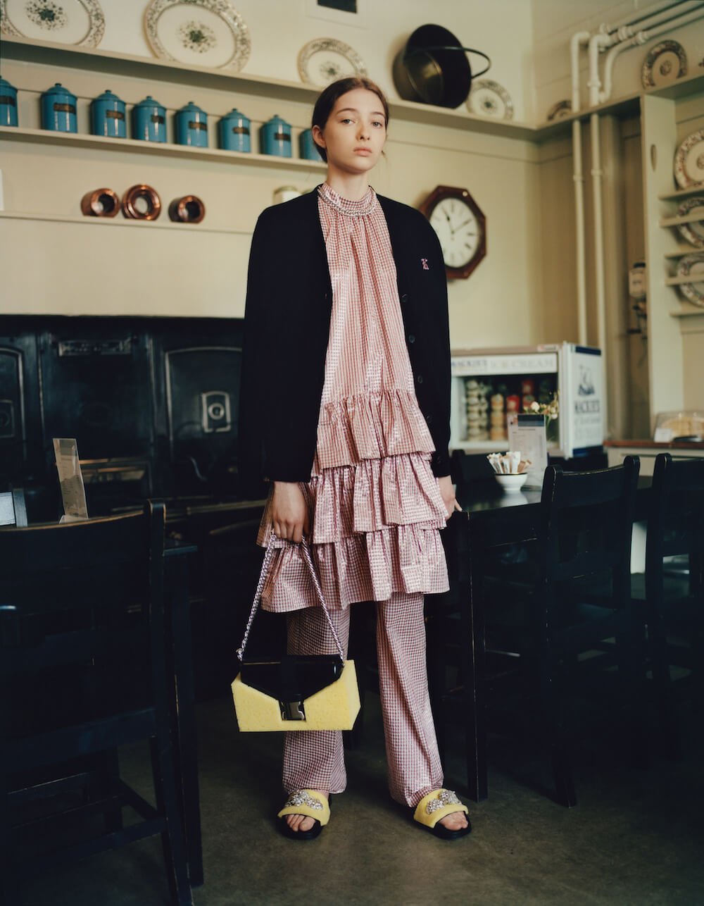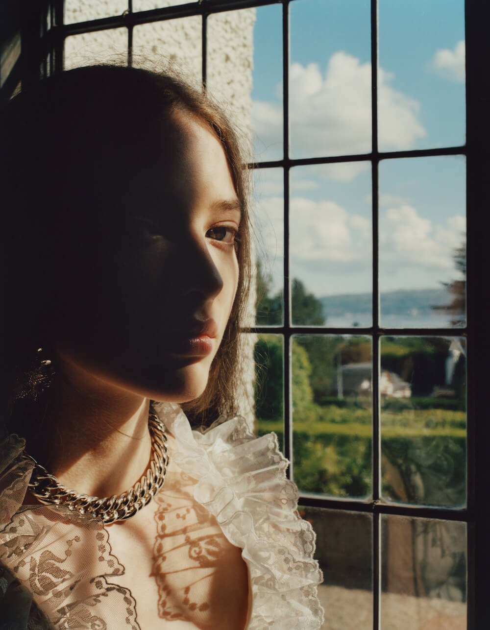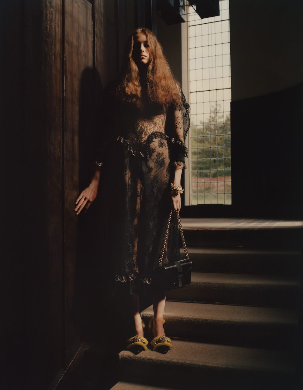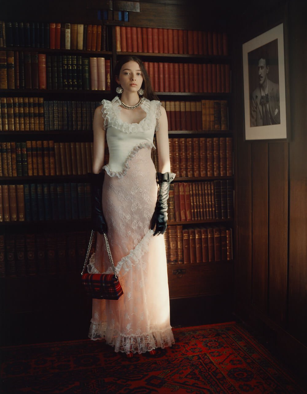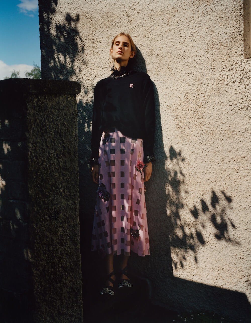 And celebrate he did – not just via the slightly well-trodden symbolism of Scottishness – the touch of tartan that peaks out at various points of the collection, or the Lion Rampant print knitwear, but also through the celebration of some of Scotland’s finest minds, namely, Margaret MacDonald and husband Charles Rennie Mackintosh. Bright flowers, not dissimilar from those seen in Margaret MacDonald’s famed gesso panels, adorn delicate lace and latticed dresses, the former a recurrent theme throughout the collection and another nod to Scotland and her once thriving lace industry. Elsewhere, MacDonald’s elegant, elongated shapes are reflected by modest silhouettes – loose crochet fabric and tiered lace dresses bring an ethereal quality to this collection that we’re sure Mrs. MacDonald would have been very proud of.