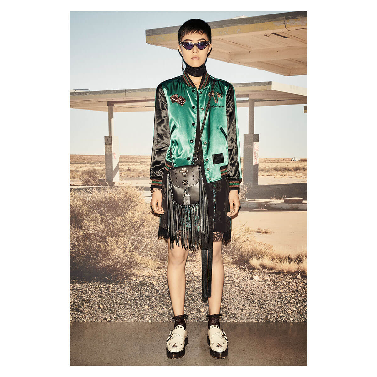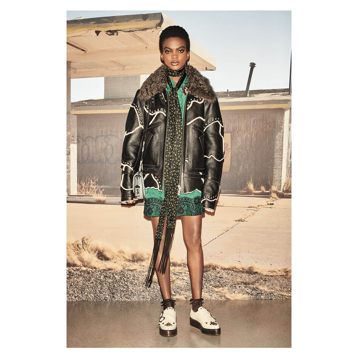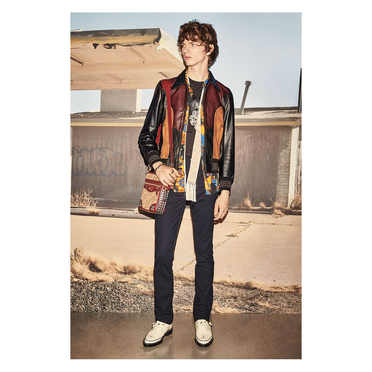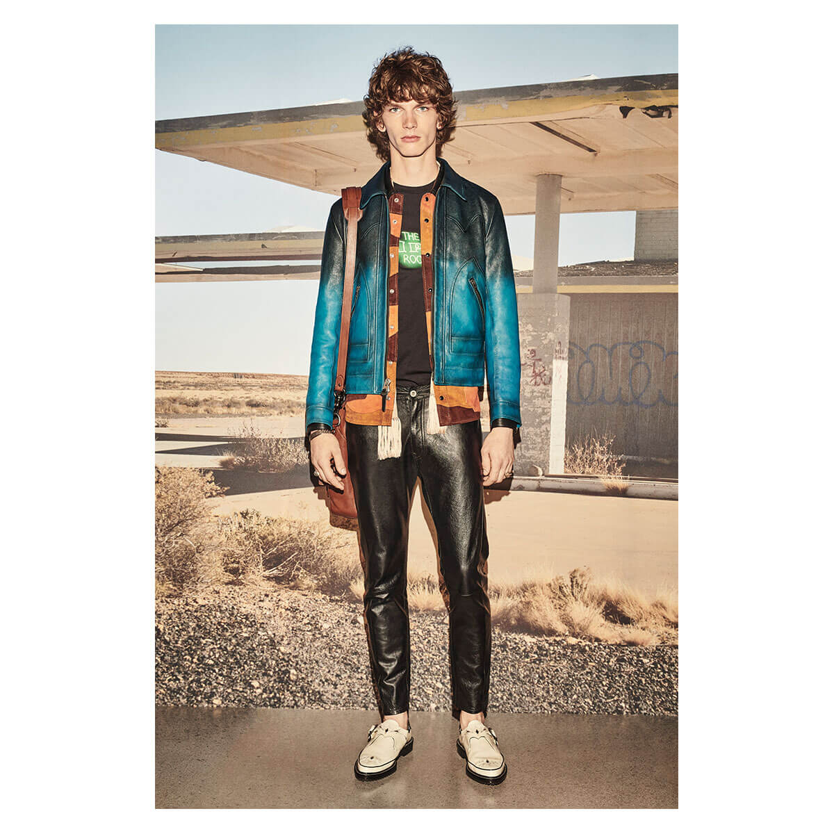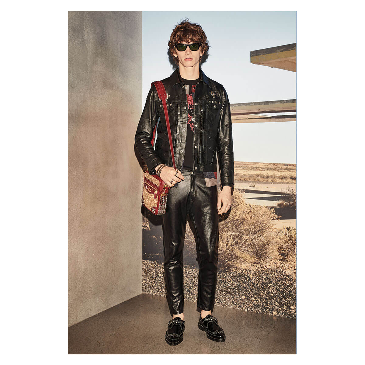 Stuart Vevers’ Coach kids are in the mood for good music and good company, just like Johnny Depp was when he opened The Viper Room on the Sunset Strip in 1993. “I was looking for escape,” Depp said in 2000. Escape he did, the Viper Room became notorious after River Phoenix’s death there and was a place for illicit activity, strippers and great bands. Coach Pre-Spring 2019 is not of the stripping kind (although by all means, take it all of if you want to) but it is feeling all those ‘90s Viper Room vibes, the chosen place of inspiration for Vevers. The collection is layered in all that brown leather Vevers loves, Los Angeles palm trees knitted onto cardigans and patchwork shearling. These are the kind of clothes we would wear to the more PG rated Viper Room. It’s a collection for rockstars, shiny red leather fringing, layered florals under palm tree pyramid studded denim jackets and smart shouldered jackets paired with an ever so slightly flared jean. Long fringed scarves trail down the body amongst loose suiting and Viper Room logo’d t-shirts. Modern merch. For the East Coast-ers going West. The sounds Stuart is envisioning are those of Nick Cave and Marilyn Manson. Goth goes rock god. Turn it all the way up. It’s all happening on the West Coast.