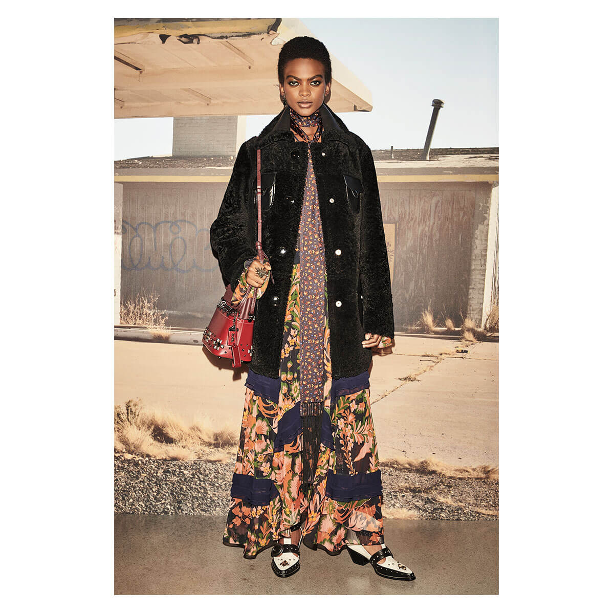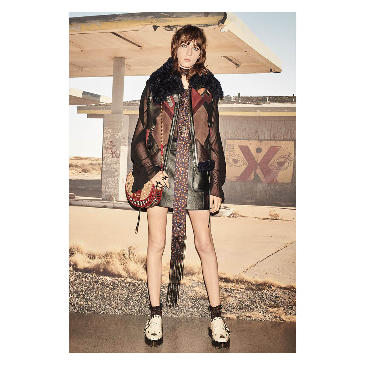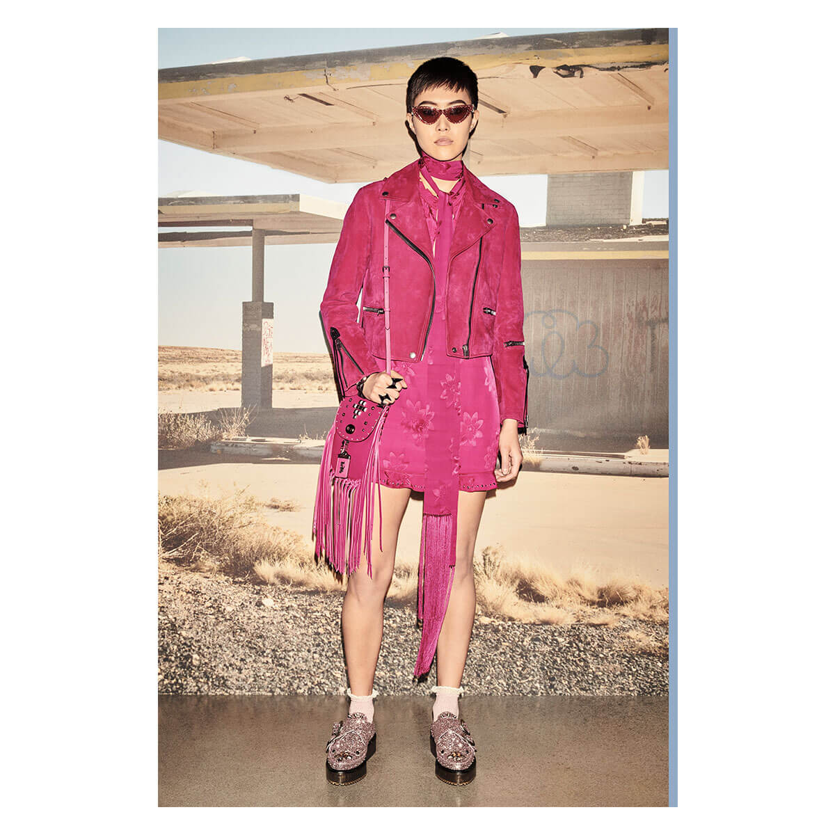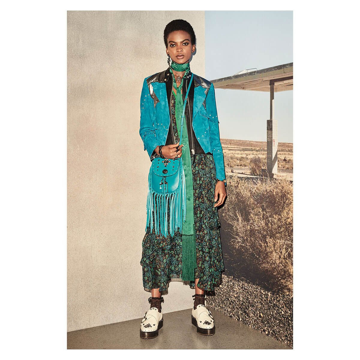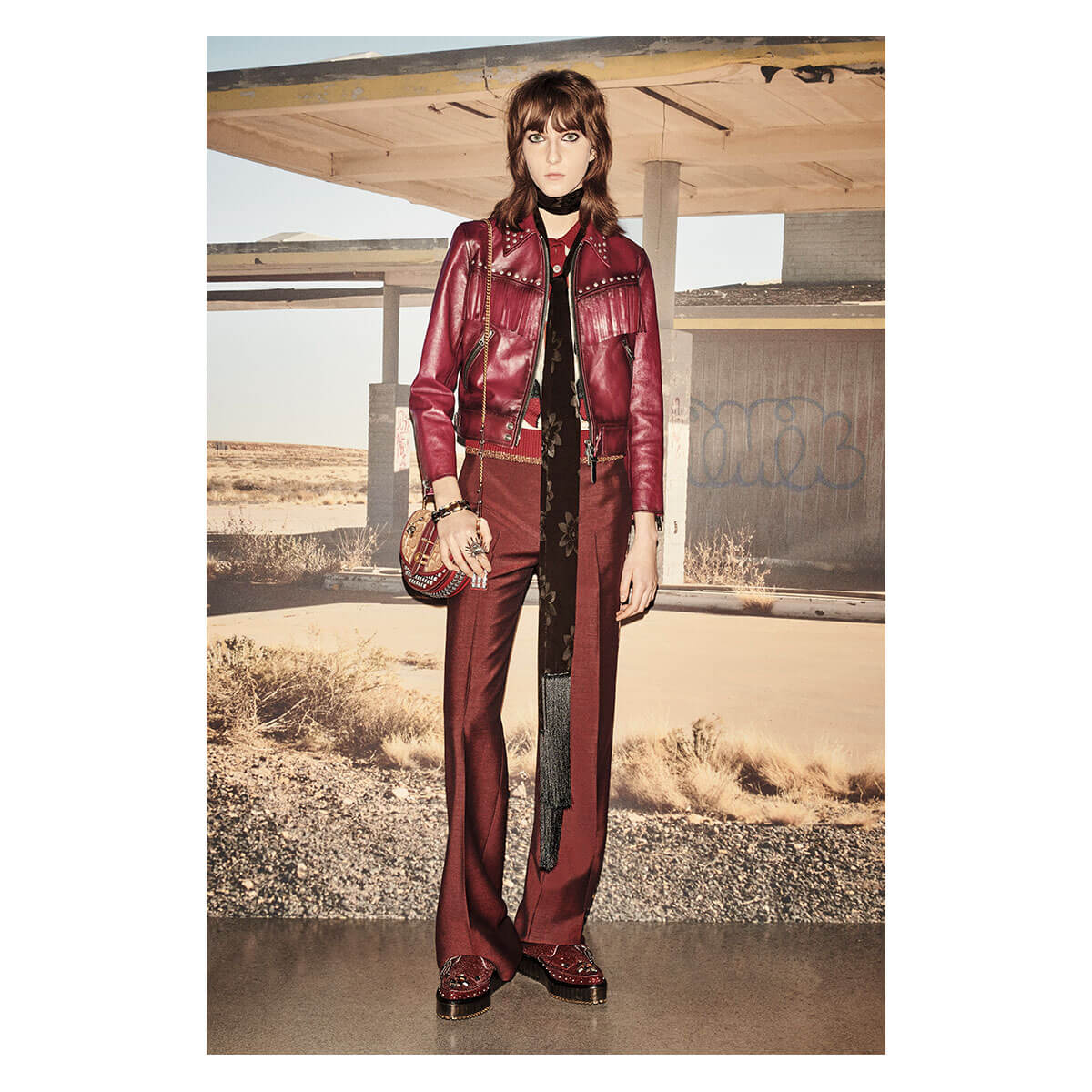 Stuart Vevers’ Coach kids are in the mood for good music and good company, just like Johnny Depp was when he opened The Viper Room on the Sunset Strip in 1993. “I was looking for escape,” Depp said in 2000. Escape he did, the Viper Room became notorious after River Phoenix’s death there and was a place for illicit activity, strippers and great bands. Coach Pre-Spring 2019 is not of the stripping kind (although by all means, take it all of if you want to) but it is feeling all those ‘90s Viper Room vibes, the chosen place of inspiration for Vevers. The collection is layered in all that brown leather Vevers loves, Los Angeles palm trees knitted onto cardigans and patchwork shearling. These are the kind of clothes we would wear to the more PG rated Viper Room. It’s a collection for rockstars, shiny red leather fringing, layered florals under palm tree pyramid studded denim jackets and smart shouldered jackets paired with an ever so slightly flared jean. Long fringed scarves trail down the body amongst loose suiting and Viper Room logo’d t-shirts. Modern merch. For the East Coast-ers going West. The sounds Stuart is envisioning are those of Nick Cave and Marilyn Manson. Goth goes rock god. Turn it all the way up. It’s all happening on the West Coast.