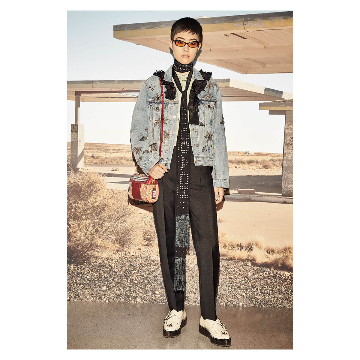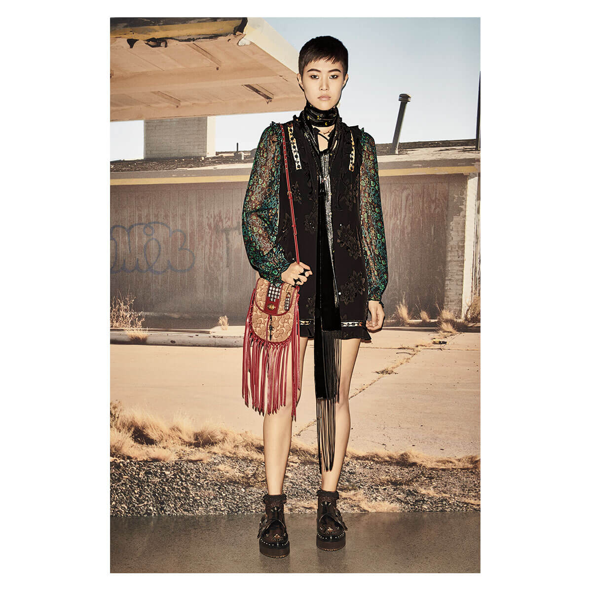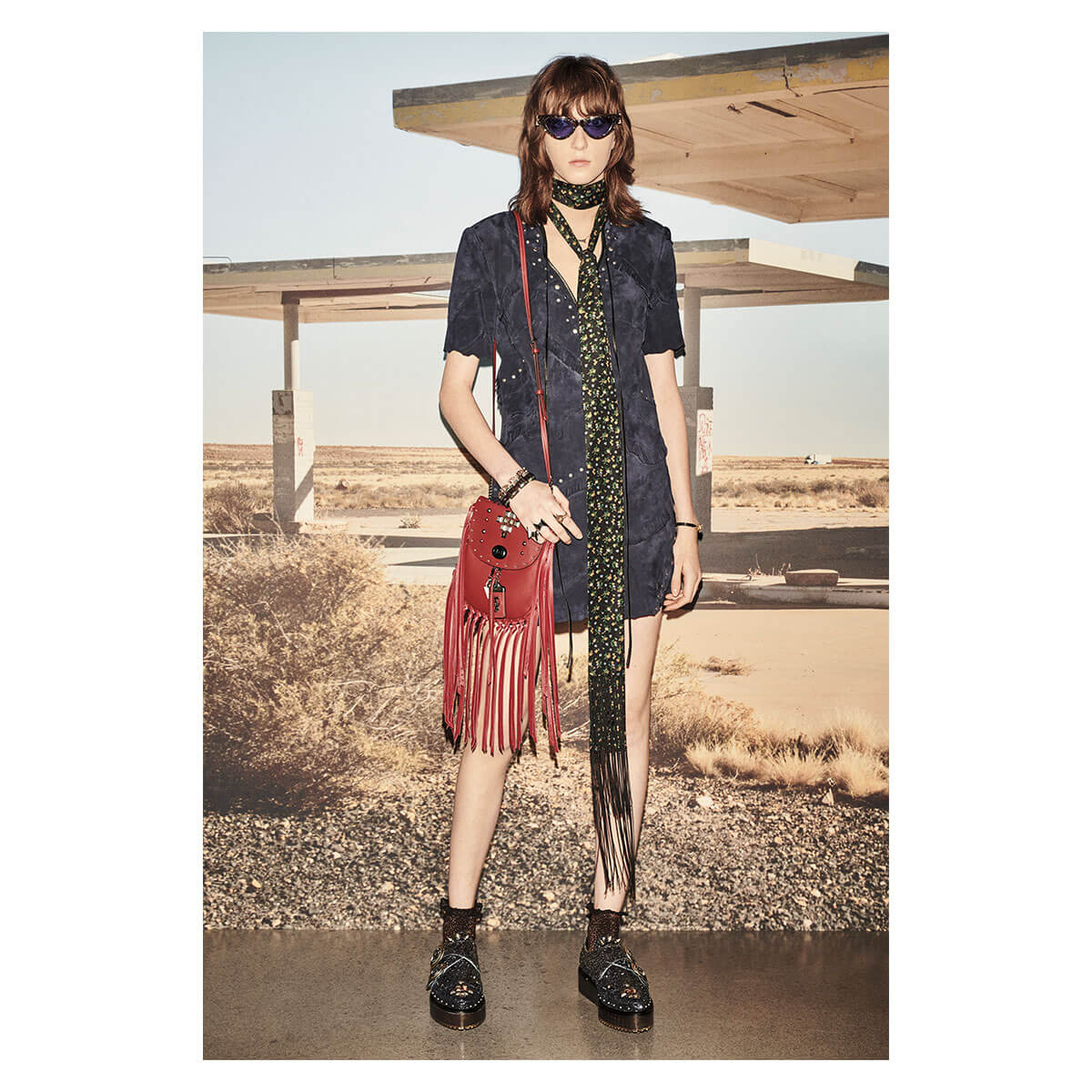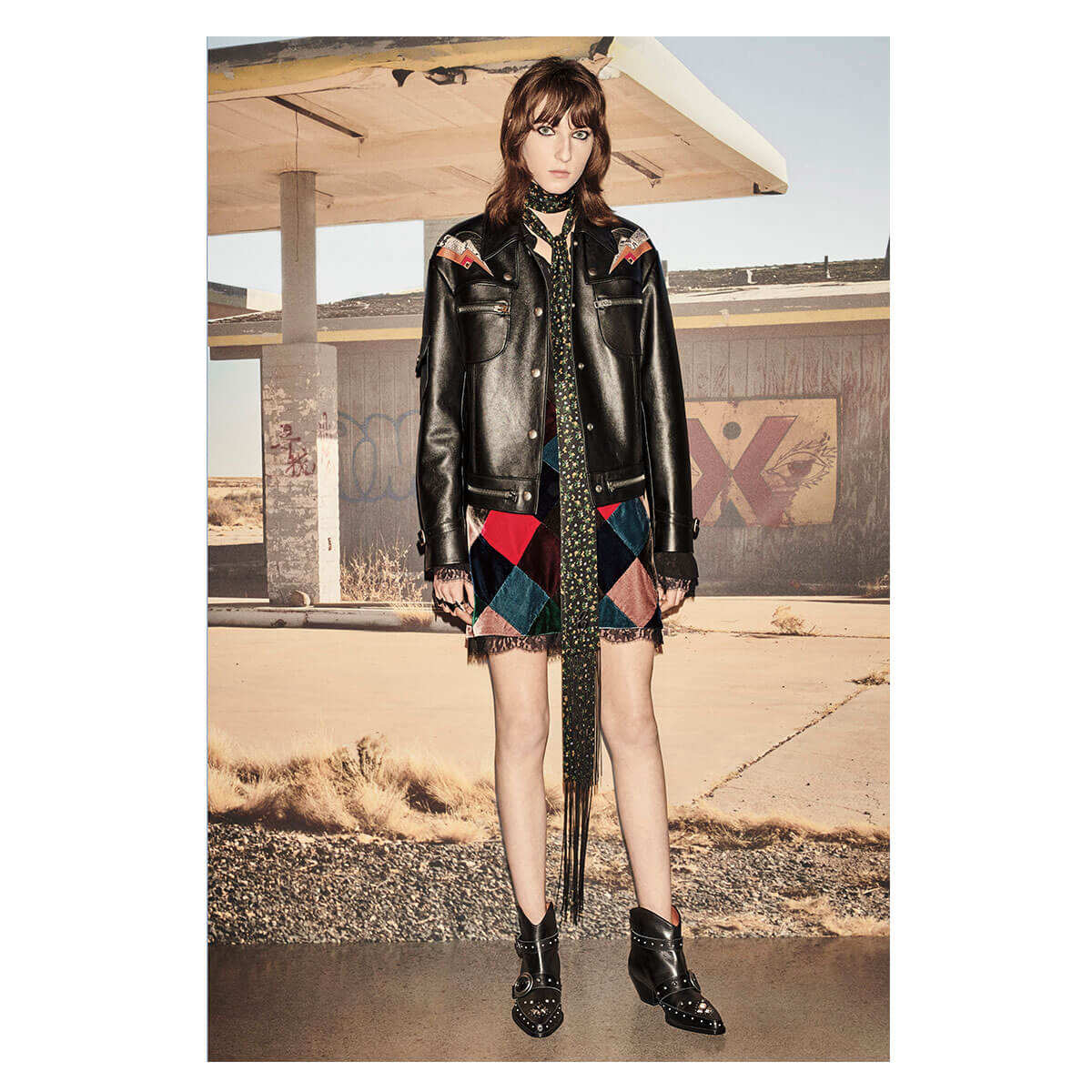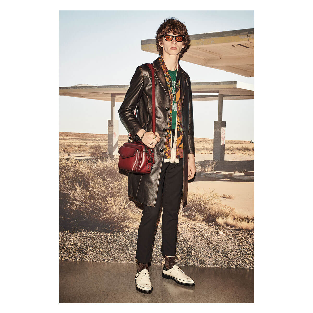 Stuart Vevers’ Coach kids are in the mood for good music and good company, just like Johnny Depp was when he opened The Viper Room on the Sunset Strip in 1993. “I was looking for escape,” Depp said in 2000. Escape he did, the Viper Room became notorious after River Phoenix’s death there and was a place for illicit activity, strippers and great bands. Coach Pre-Spring 2019 is not of the stripping kind (although by all means, take it all of if you want to) but it is feeling all those ‘90s Viper Room vibes, the chosen place of inspiration for Vevers. The collection is layered in all that brown leather Vevers loves, Los Angeles palm trees knitted onto cardigans and patchwork shearling. These are the kind of clothes we would wear to the more PG rated Viper Room. It’s a collection for rockstars, shiny red leather fringing, layered florals under palm tree pyramid studded denim jackets and smart shouldered jackets paired with an ever so slightly flared jean. Long fringed scarves trail down the body amongst loose suiting and Viper Room logo’d t-shirts. Modern merch. For the East Coast-ers going West. The sounds Stuart is envisioning are those of Nick Cave and Marilyn Manson. Goth goes rock god. Turn it all the way up. It’s all happening on the West Coast.