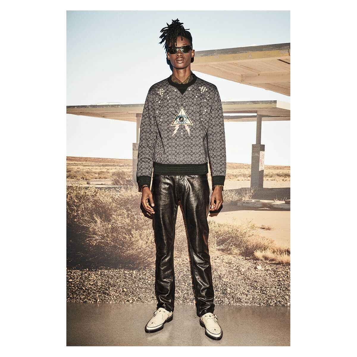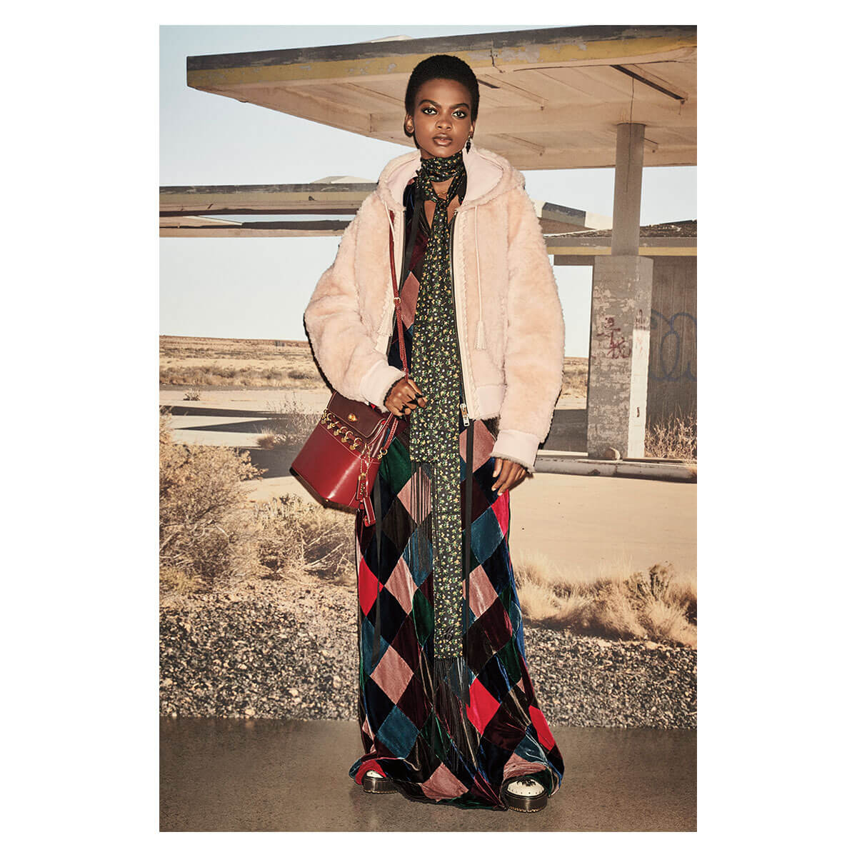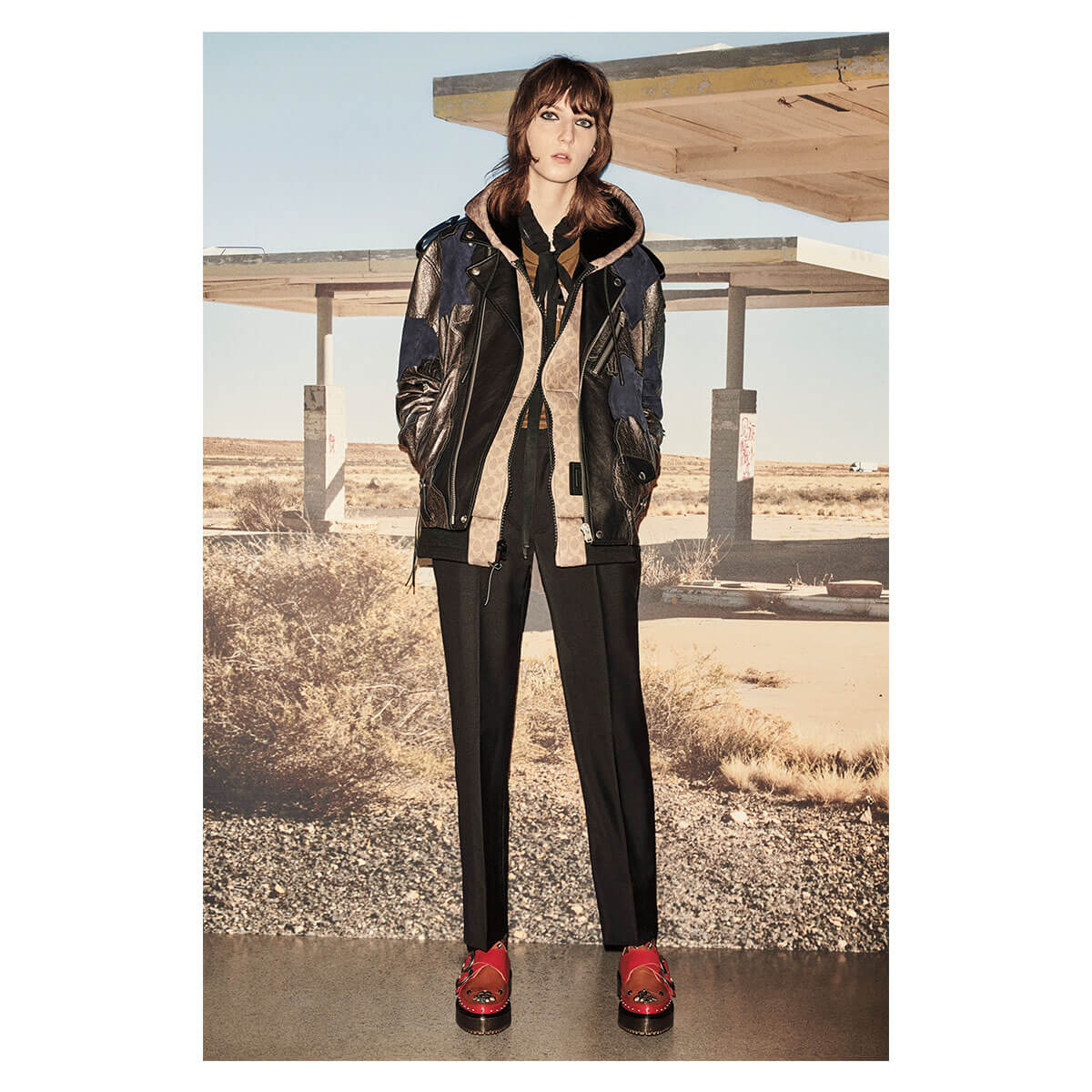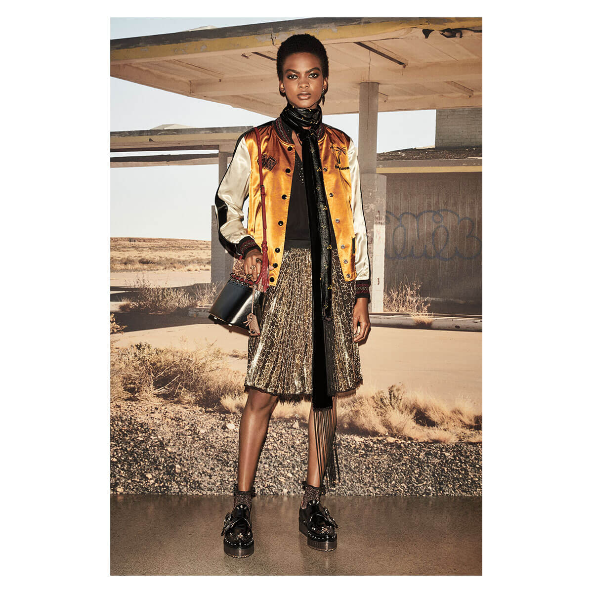 Stuart Vevers’ Coach kids are in the mood for good music and good company, just like Johnny Depp was when he opened The Viper Room on the Sunset Strip in 1993. “I was looking for escape,” Depp said in 2000. Escape he did, the Viper Room became notorious after River Phoenix’s death there and was a place for illicit activity, strippers and great bands. Coach Pre-Spring 2019 is not of the stripping kind (although by all means, take it all of if you want to) but it is feeling all those ‘90s Viper Room vibes, the chosen place of inspiration for Vevers. The collection is layered in all that brown leather Vevers loves, Los Angeles palm trees knitted onto cardigans and patchwork shearling. These are the kind of clothes we would wear to the more PG rated Viper Room. It’s a collection for rockstars, shiny red leather fringing, layered florals under palm tree pyramid studded denim jackets and smart shouldered jackets paired with an ever so slightly flared jean. Long fringed scarves trail down the body amongst loose suiting and Viper Room logo’d t-shirts. Modern merch. For the East Coast-ers going West. The sounds Stuart is envisioning are those of Nick Cave and Marilyn Manson. Goth goes rock god. Turn it all the way up. It’s all happening on the West Coast.