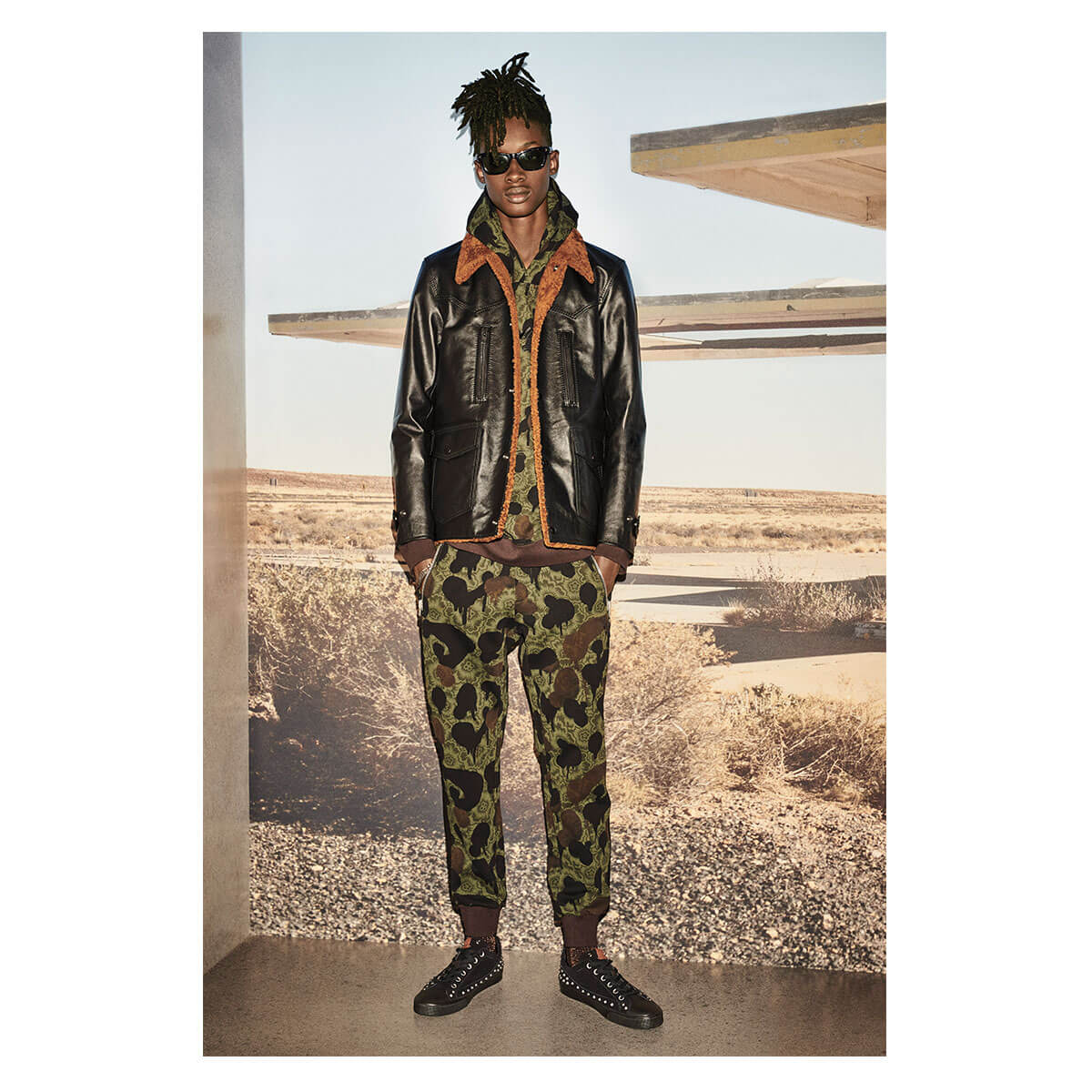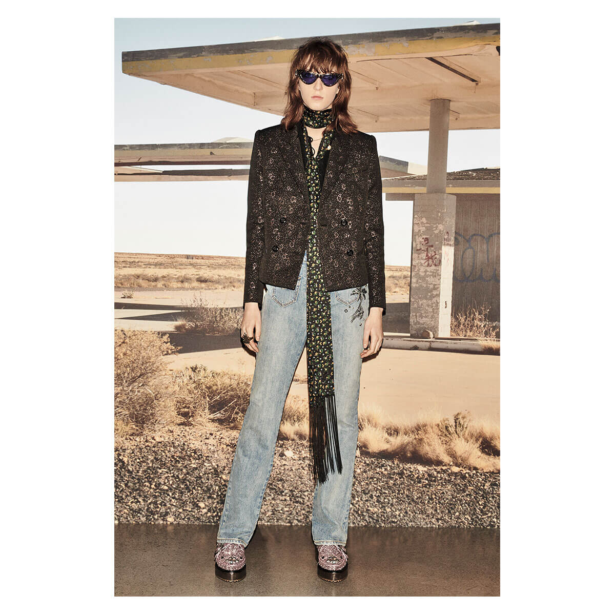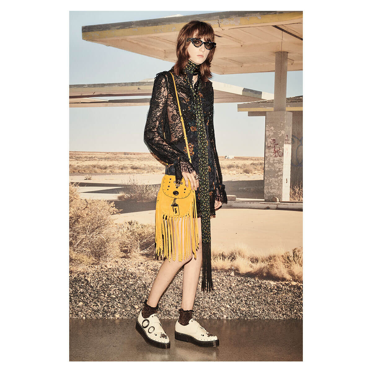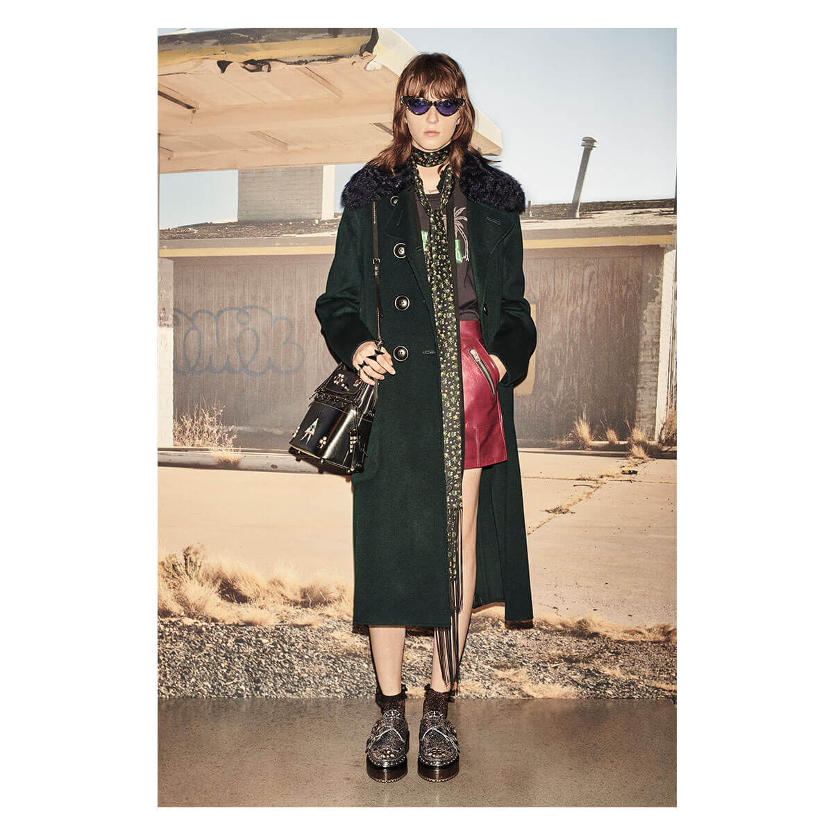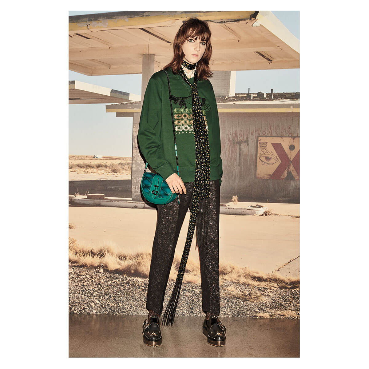 Stuart Vevers’ Coach kids are in the mood for good music and good company, just like Johnny Depp was when he opened The Viper Room on the Sunset Strip in 1993. “I was looking for escape,” Depp said in 2000. Escape he did, the Viper Room became notorious after River Phoenix’s death there and was a place for illicit activity, strippers and great bands. Coach Pre-Spring 2019 is not of the stripping kind (although by all means, take it all of if you want to) but it is feeling all those ‘90s Viper Room vibes, the chosen place of inspiration for Vevers. The collection is layered in all that brown leather Vevers loves, Los Angeles palm trees knitted onto cardigans and patchwork shearling. These are the kind of clothes we would wear to the more PG rated Viper Room. It’s a collection for rockstars, shiny red leather fringing, layered florals under palm tree pyramid studded denim jackets and smart shouldered jackets paired with an ever so slightly flared jean. Long fringed scarves trail down the body amongst loose suiting and Viper Room logo’d t-shirts. Modern merch. For the East Coast-ers going West. The sounds Stuart is envisioning are those of Nick Cave and Marilyn Manson. Goth goes rock god. Turn it all the way up. It’s all happening on the West Coast.