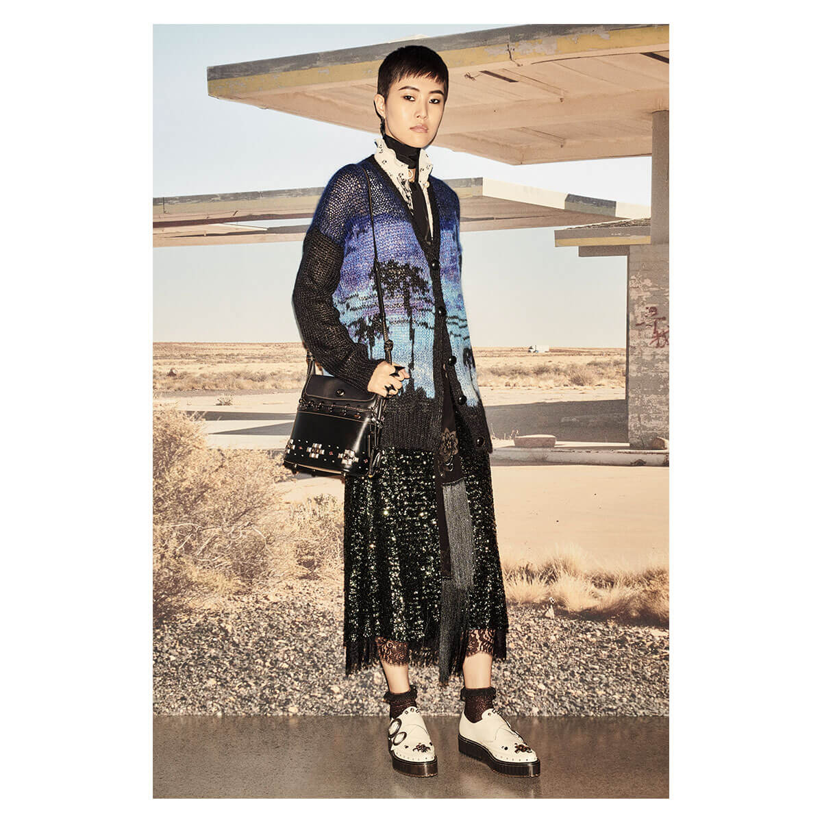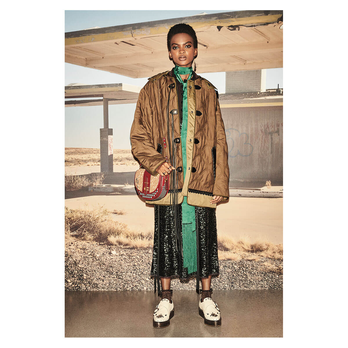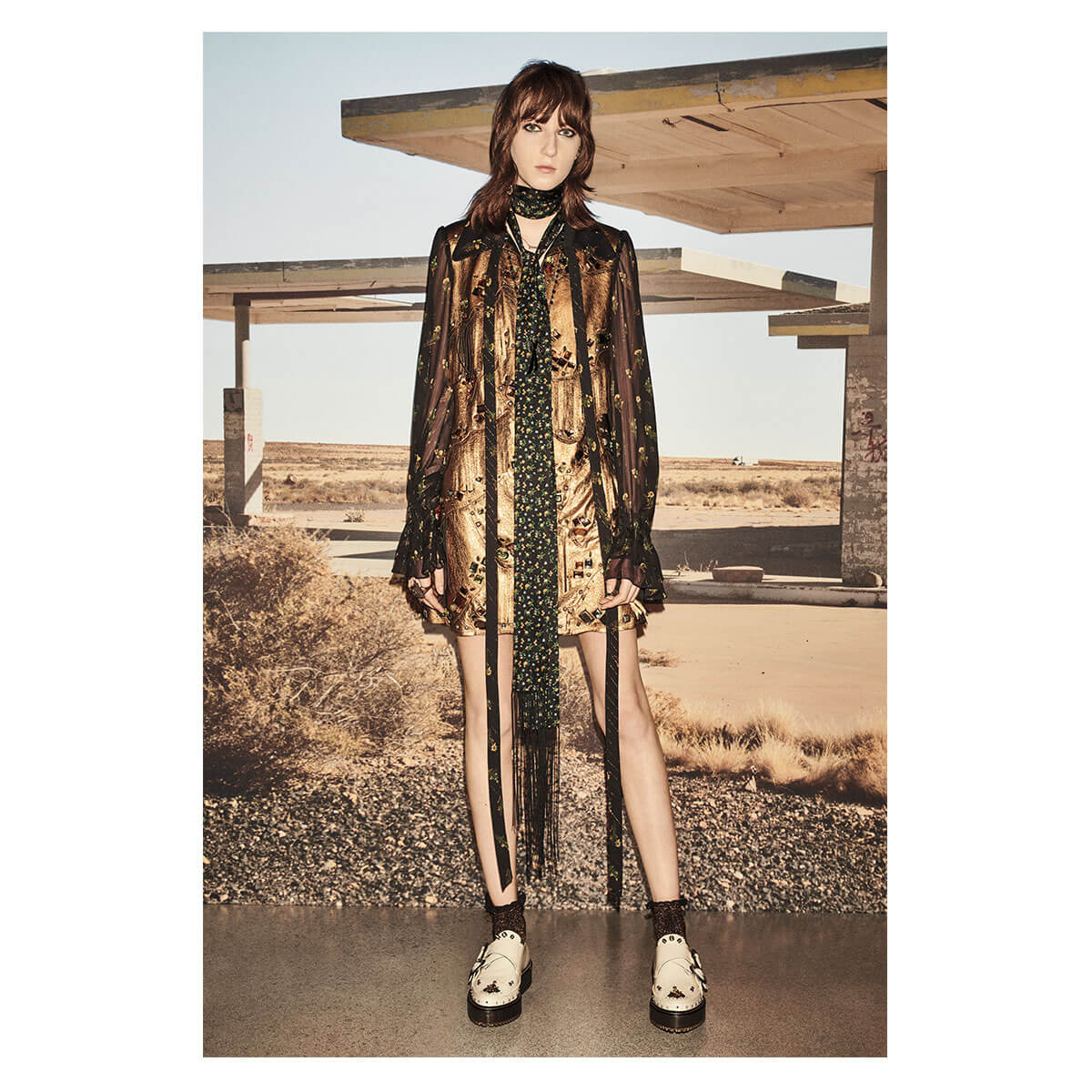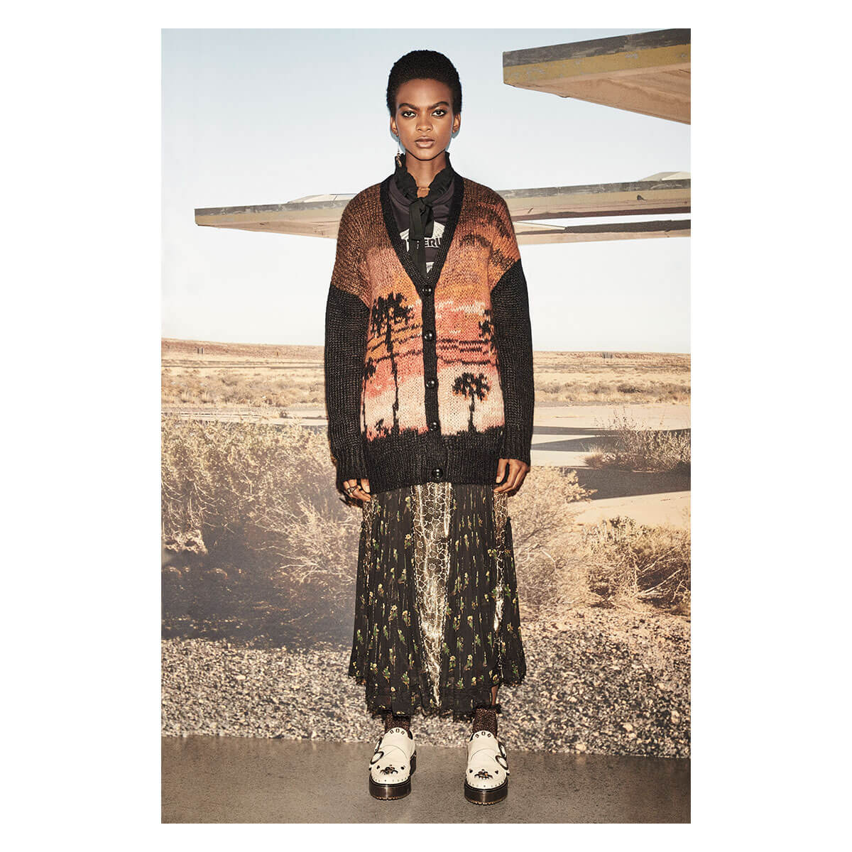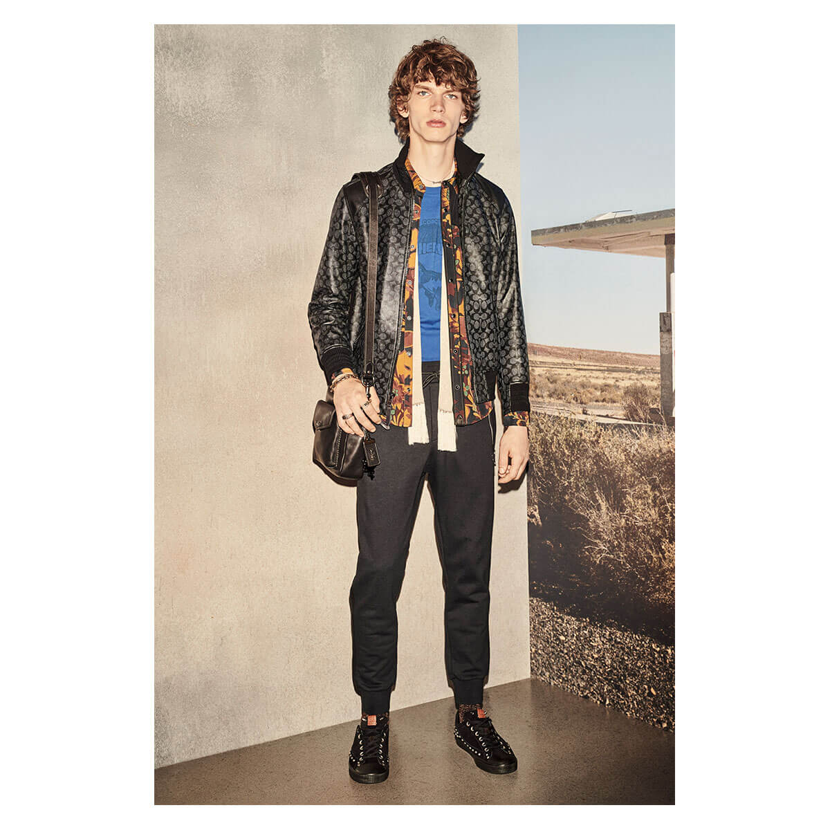 Stuart Vevers’ Coach kids are in the mood for good music and good company, just like Johnny Depp was when he opened The Viper Room on the Sunset Strip in 1993. “I was looking for escape,” Depp said in 2000. Escape he did, the Viper Room became notorious after River Phoenix’s death there and was a place for illicit activity, strippers and great bands. Coach Pre-Spring 2019 is not of the stripping kind (although by all means, take it all of if you want to) but it is feeling all those ‘90s Viper Room vibes, the chosen place of inspiration for Vevers. The collection is layered in all that brown leather Vevers loves, Los Angeles palm trees knitted onto cardigans and patchwork shearling. These are the kind of clothes we would wear to the more PG rated Viper Room. It’s a collection for rockstars, shiny red leather fringing, layered florals under palm tree pyramid studded denim jackets and smart shouldered jackets paired with an ever so slightly flared jean. Long fringed scarves trail down the body amongst loose suiting and Viper Room logo’d t-shirts. Modern merch. For the East Coast-ers going West. The sounds Stuart is envisioning are those of Nick Cave and Marilyn Manson. Goth goes rock god. Turn it all the way up. It’s all happening on the West Coast.