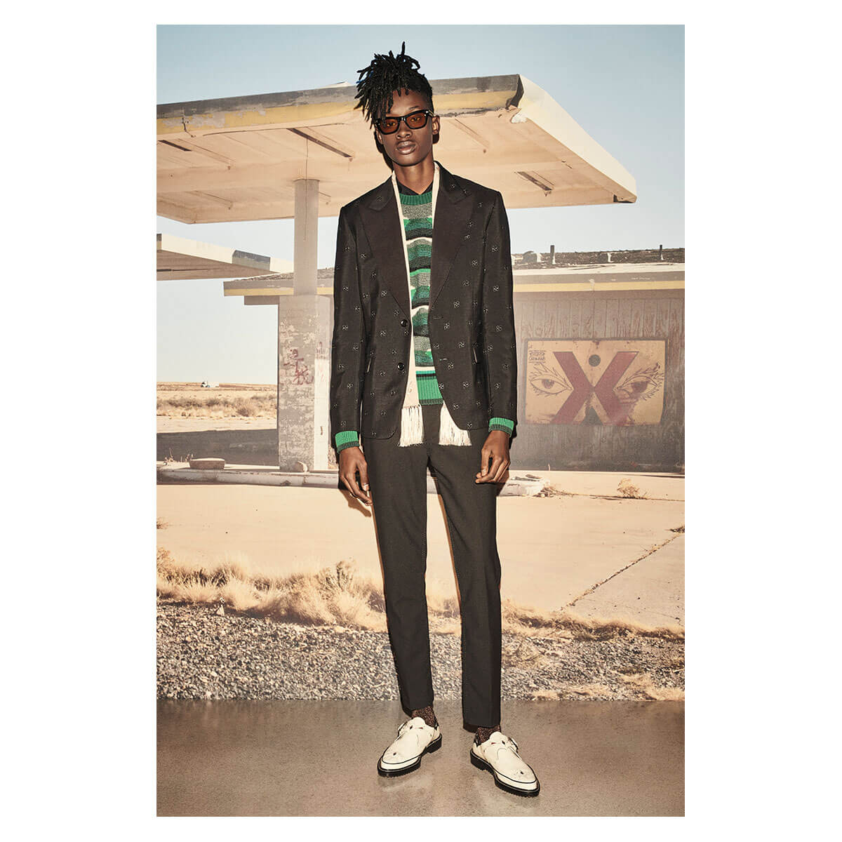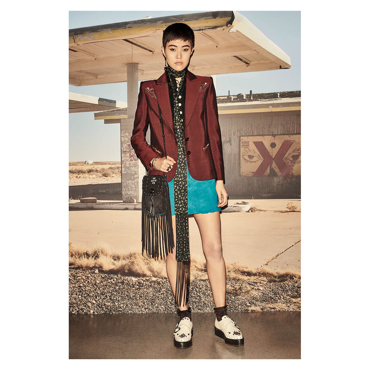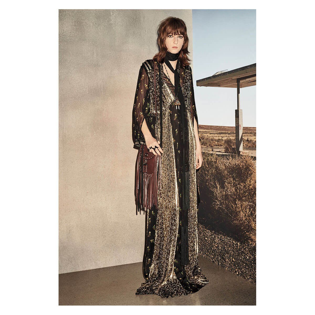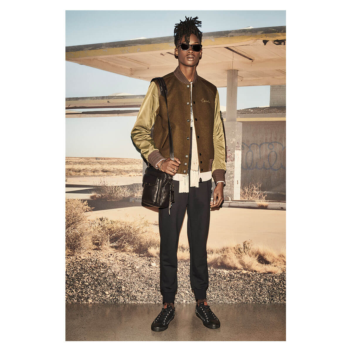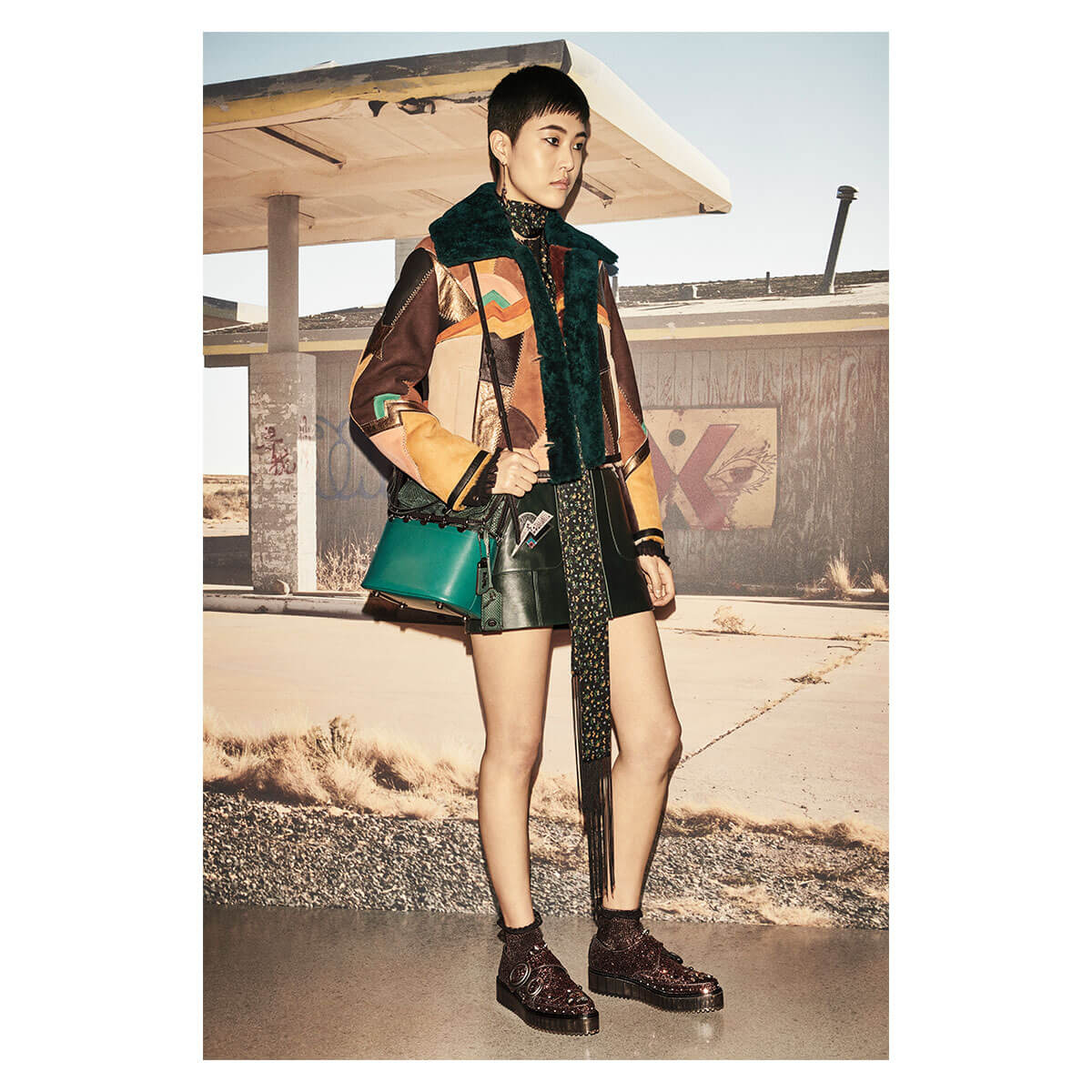 Stuart Vevers’ Coach kids are in the mood for good music and good company, just like Johnny Depp was when he opened The Viper Room on the Sunset Strip in 1993. “I was looking for escape,” Depp said in 2000. Escape he did, the Viper Room became notorious after River Phoenix’s death there and was a place for illicit activity, strippers and great bands. Coach Pre-Spring 2019 is not of the stripping kind (although by all means, take it all of if you want to) but it is feeling all those ‘90s Viper Room vibes, the chosen place of inspiration for Vevers. The collection is layered in all that brown leather Vevers loves, Los Angeles palm trees knitted onto cardigans and patchwork shearling. These are the kind of clothes we would wear to the more PG rated Viper Room. It’s a collection for rockstars, shiny red leather fringing, layered florals under palm tree pyramid studded denim jackets and smart shouldered jackets paired with an ever so slightly flared jean. Long fringed scarves trail down the body amongst loose suiting and Viper Room logo’d t-shirts. Modern merch. For the East Coast-ers going West. The sounds Stuart is envisioning are those of Nick Cave and Marilyn Manson. Goth goes rock god. Turn it all the way up. It’s all happening on the West Coast.